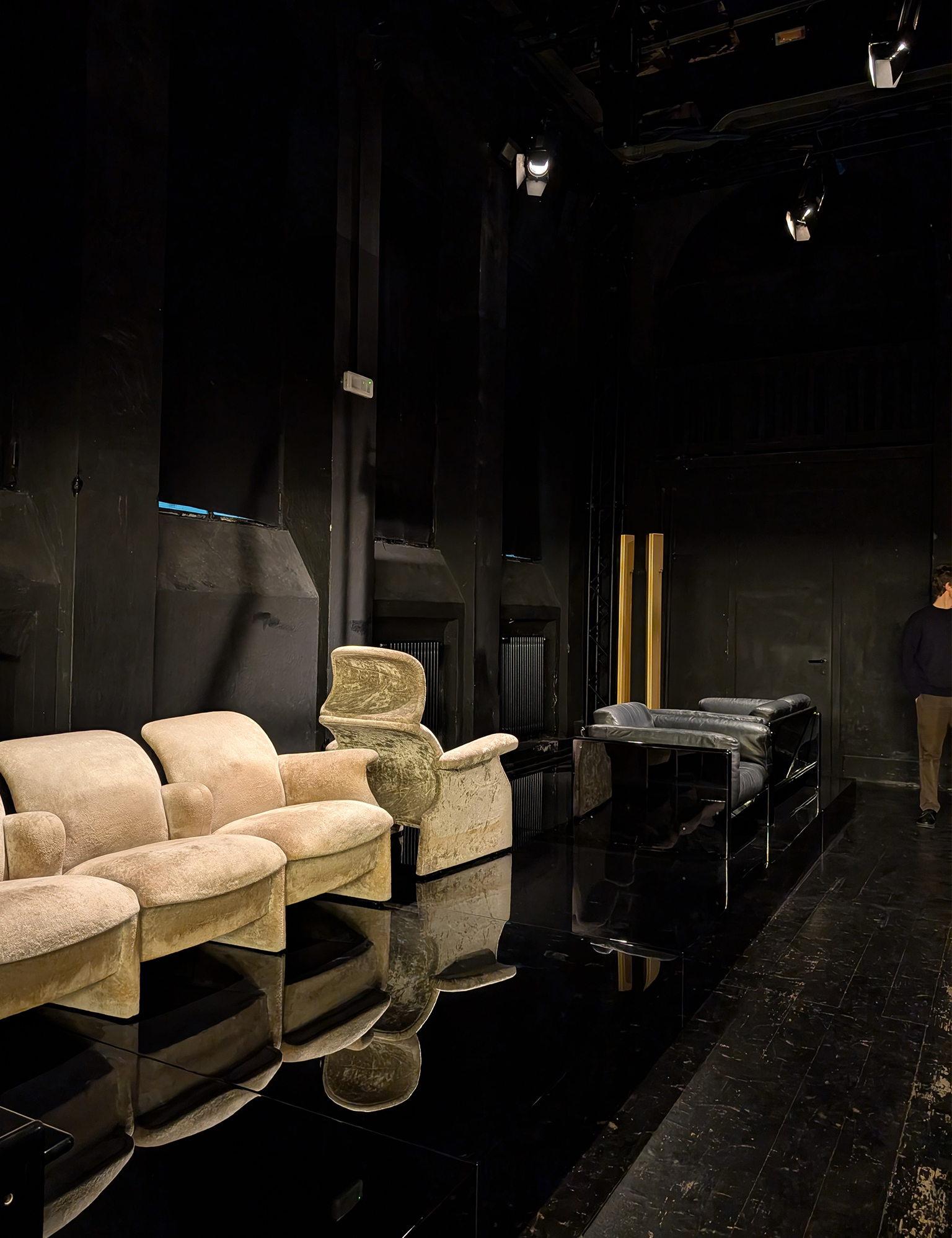 На выставке Yves Salomon Éditions и Dimorestudio в пространстве Teatro Arsenale были представлены предметы мебели с интарсиями из меха, металлом, кожей, алюминием, овчиной и формами, отсылающими к ар-деко и постмодернизму, вдохновленные эстетикой Карло Бугатти. Но больше, чем сами предметы, меня поразило то, как именно они были представлены. Dimore выстроили пространство как высказывание: мягкое, театральное, почти кинематографичное. Особенно точно это чувствовалось в том, как они показали работы дизайнеров, которые их вдохновляют. В первую очередь, Широ Кураматы, – одного из моих любимых авторов. Он – мастер формы и недосказанности. На выставке его предметы были почти тенями: их будто впустили в пространство и оставили в нем жить. Сцена была выстроена так, что посетитель не просто видел их, а чувствовал, как вокруг «вибрирует воздух» (как писал дизайнер Этторе Соттсасс). Уважение, диалог и тончайшее попадание в поэтику его предметов.