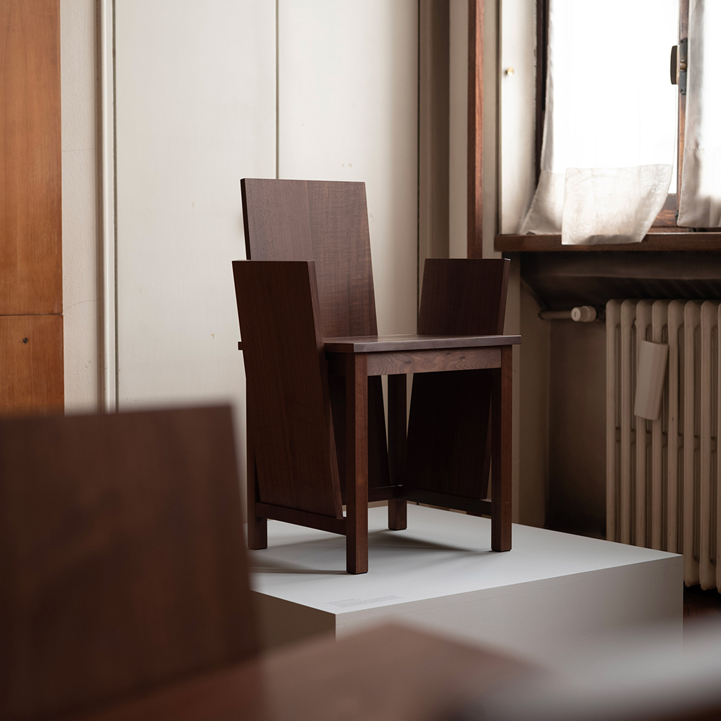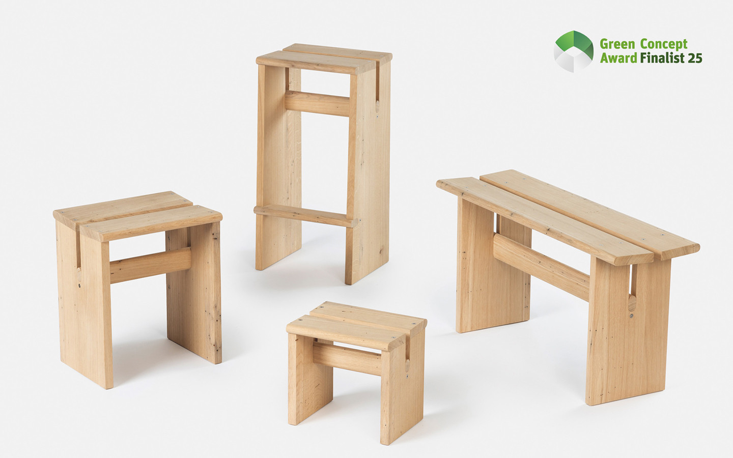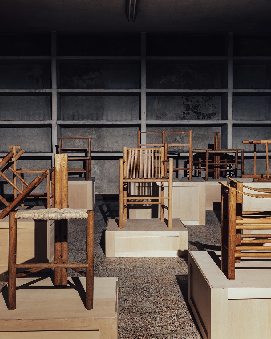Объект посвящен новой жизни предмета. Поврежденные оригинальные стулья J39 были бережно собраны заново. Экспонирование предметов почти музейное: воспринимаются не как «апсайкл», а как объект с новой судьбой.