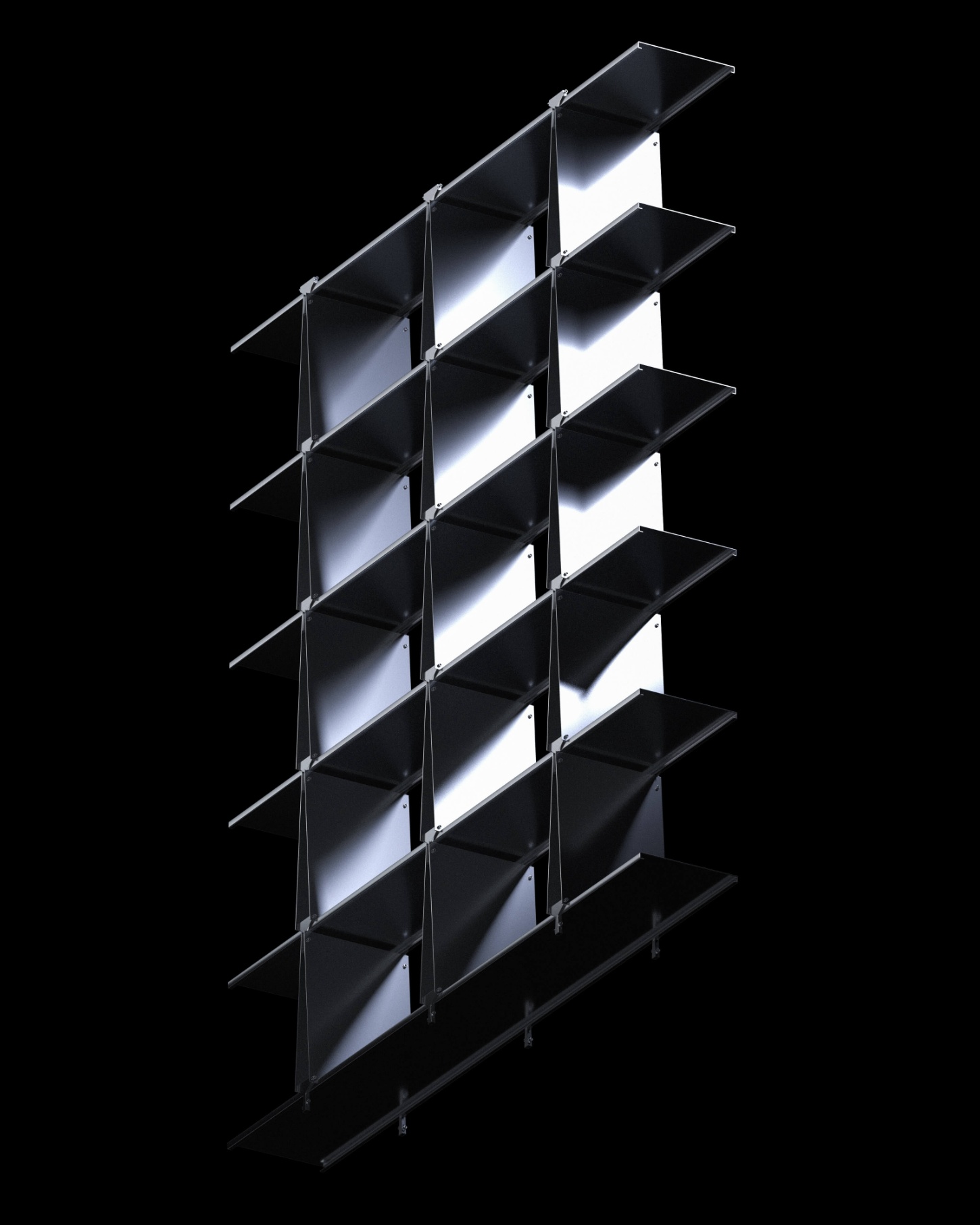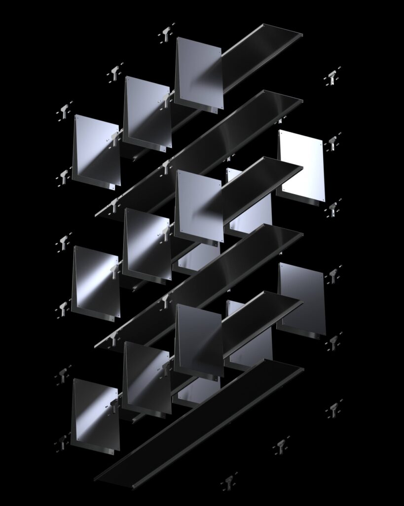 Очень архитектурно и инженерно. Стеллаж собран как карточный домик, полный логики, строгости и воздуха.