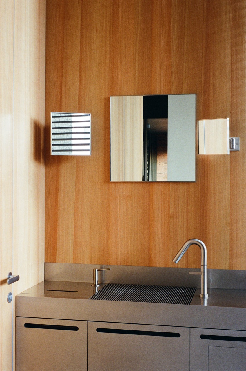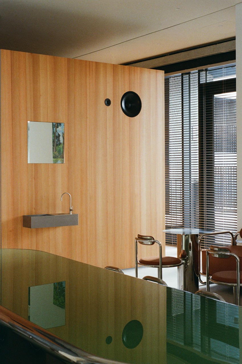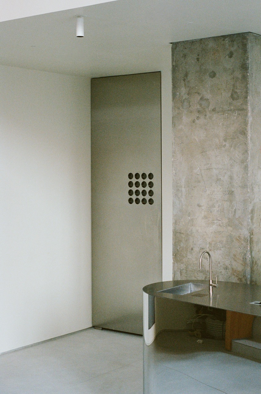 Вся мебель выполнена по индивидуальным чертежам. В проекте использовано много предметов из собственной коллекции, которые разрабатывались специально под этот интерьер и общую концепцию, включая столы. По сути, все, что представлено в пространстве, сделано нами. Отдельного внимания заслуживают двери высотой три метра — большие, сплошные, металлические, из нержавеющей стали, со стеклянными окошками, выходящими в сторону кухни».