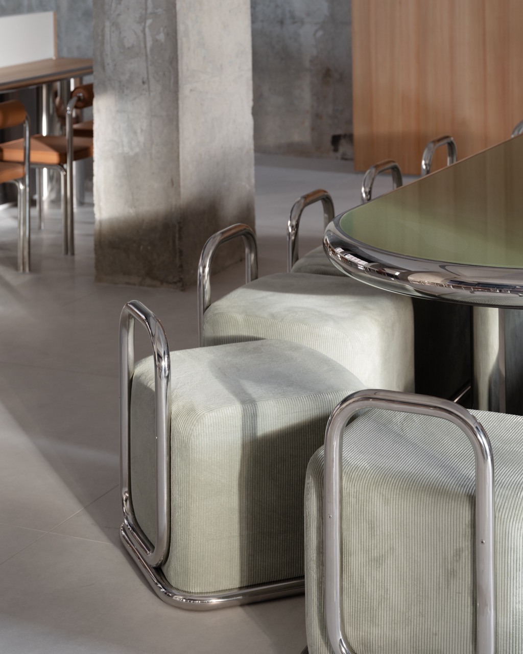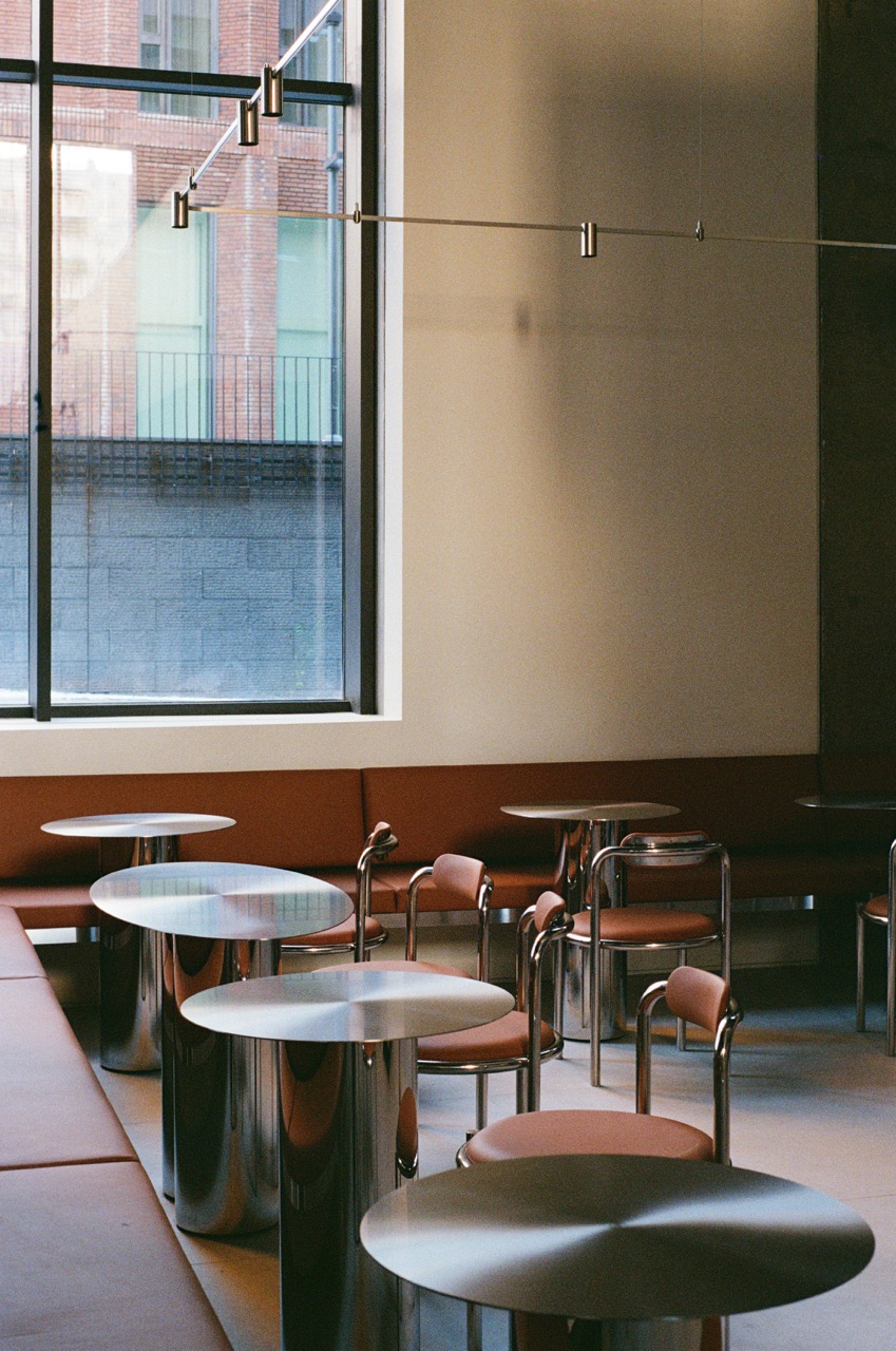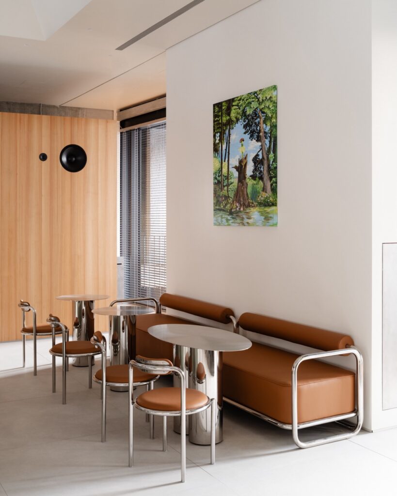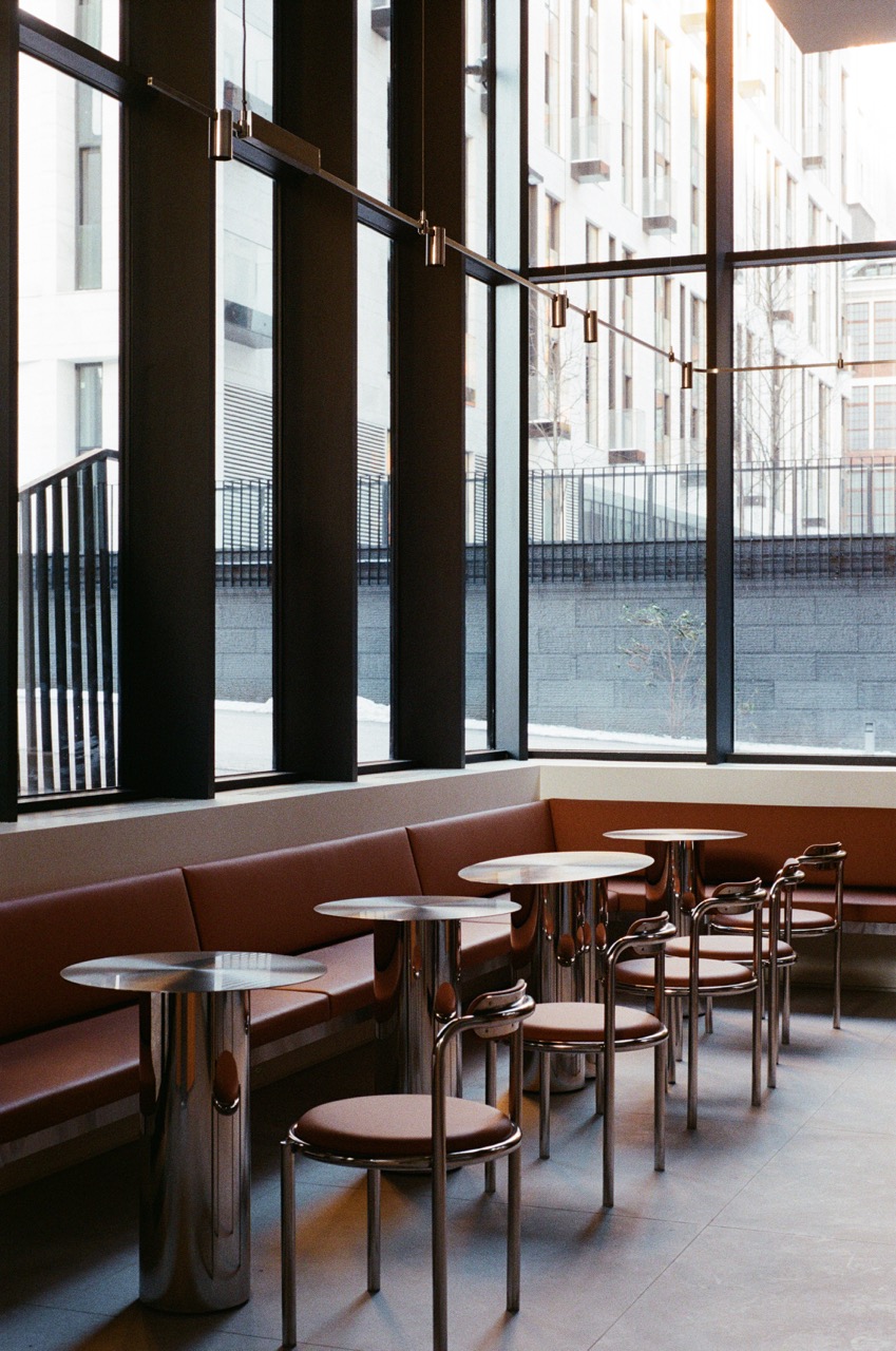 С точки зрения интерьера это для нас шаг вперед. В этом проекте мы впервые добавили новые материалы — например, дерево, с которым раньше не работали. Это было осознанное решение: мы всерьез задумались об ощущении уюта. При этом нам было важно сохранить узнаваемость Nothing Fancy. Поэтому остались фирменные элементы: стойка приема заказов из зеркальной нержавеющей стали — она есть во всех наших проектах, столы, стулья. Примерно треть из них — знакомые по предыдущим локациям, а два типа стульев были разработаны специально для этого пространства. Также осталась наша привычная цветовая палитра — например, кожа шоколадного оттенка. Но при этом появился новый цвет — зеленый, и общий стол, который мы делаем на каждом проекте. На Петровке это была ручная мозаика, здесь — полированное зеленое стекло.