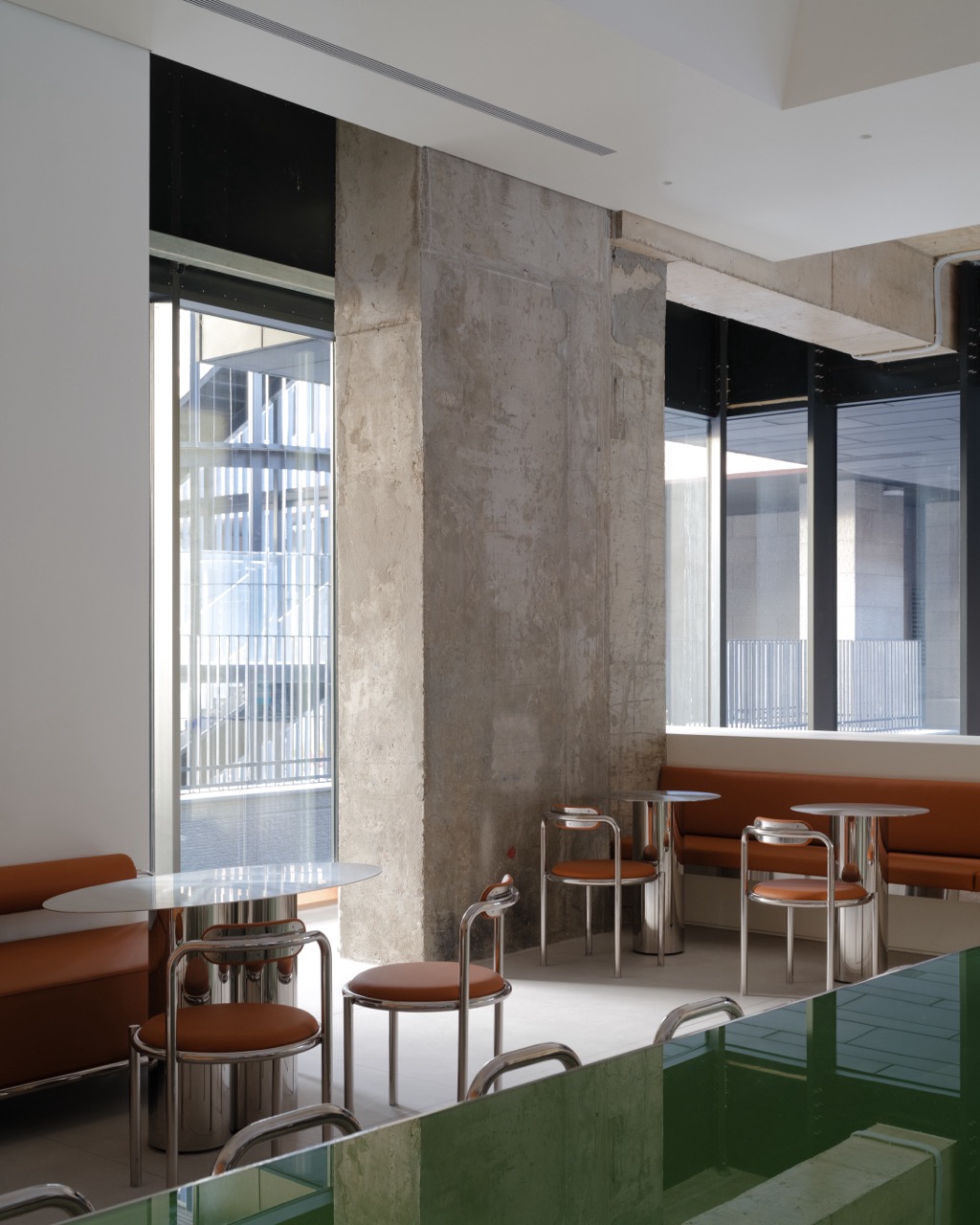 «В качестве отправной точки был выбран образ нео-бистро — к нему мы обращаемся уже в четвертый раз. Развивая эту тематику, мы создали интерьер, в котором много коричневой кожи и глянцевой полированной нержавеющей стали. В этот раз в пространстве появилось много бетона — с сохраненными следами и рисунками, оставшимися от строителей, и зеленое стекло на столах.