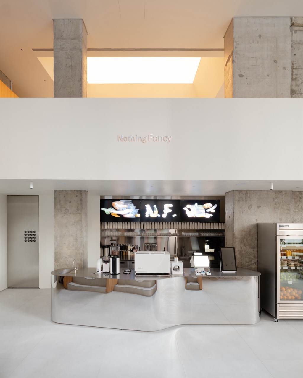 В интерьере стоит обратить внимание на сам масштаб пространства: два этажа, большой объем, высокие потолки — это сразу видно с улицы. Мы давно хотели открыть Nothing Fancy именно в таком помещении, потому что оно хорошо отражает дух бренда — этот стык индустриальности и уюта, большого количества посадок и открытого пространства.