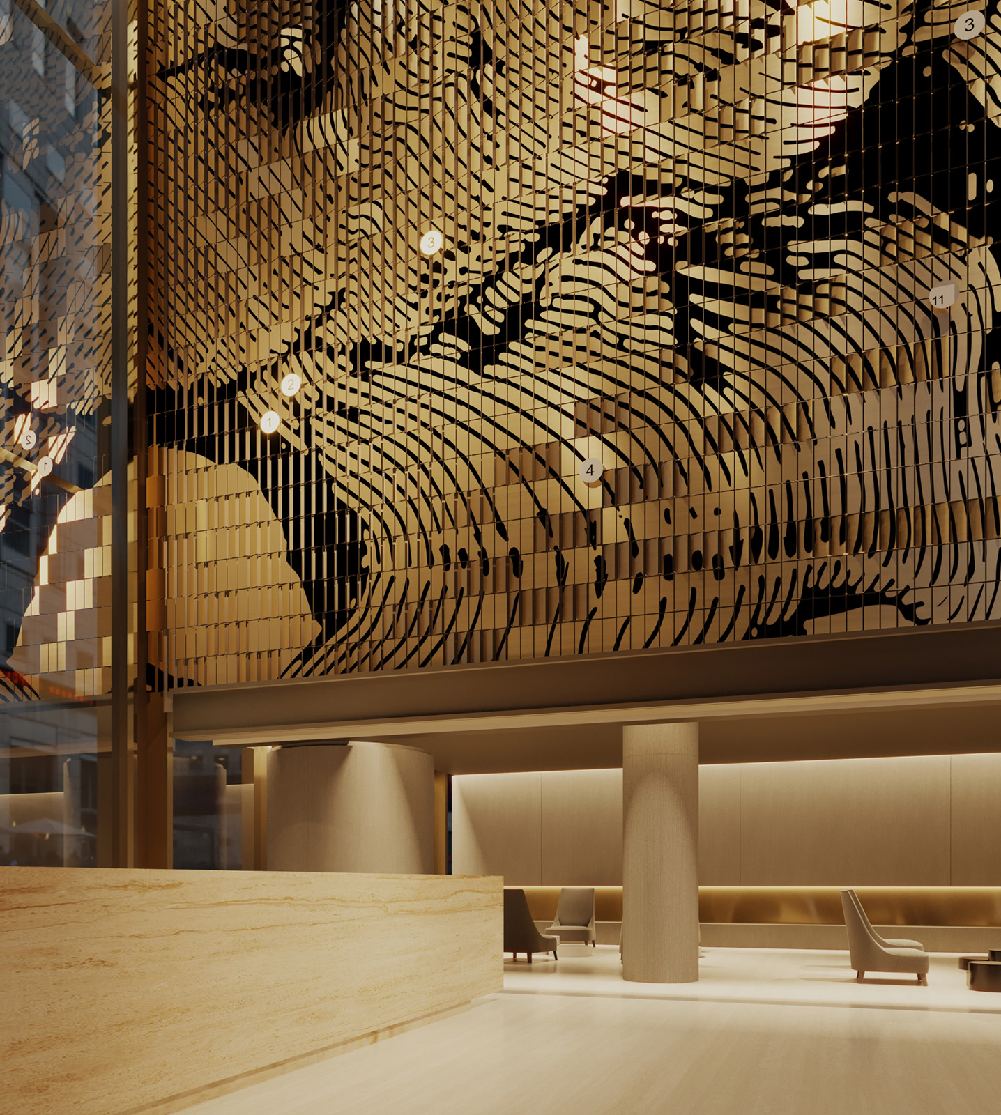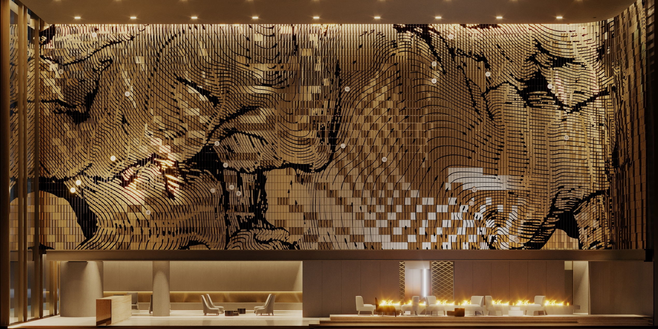 В лобби жилой части размещен арт-объект из тысячи металлических пластин: по мере продвижения в пространстве лобби гости и жильцы комплекса будут видеть, как рисунок на стене меняется в зависимости от положения пластин и отражения света.