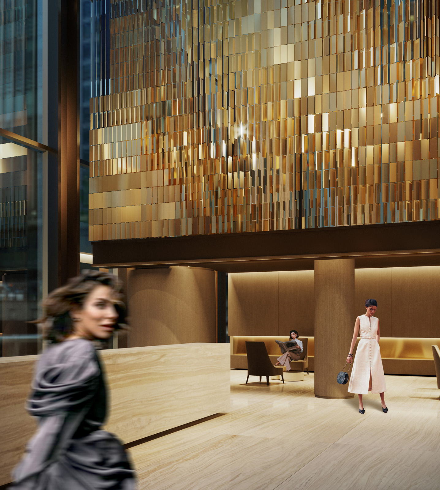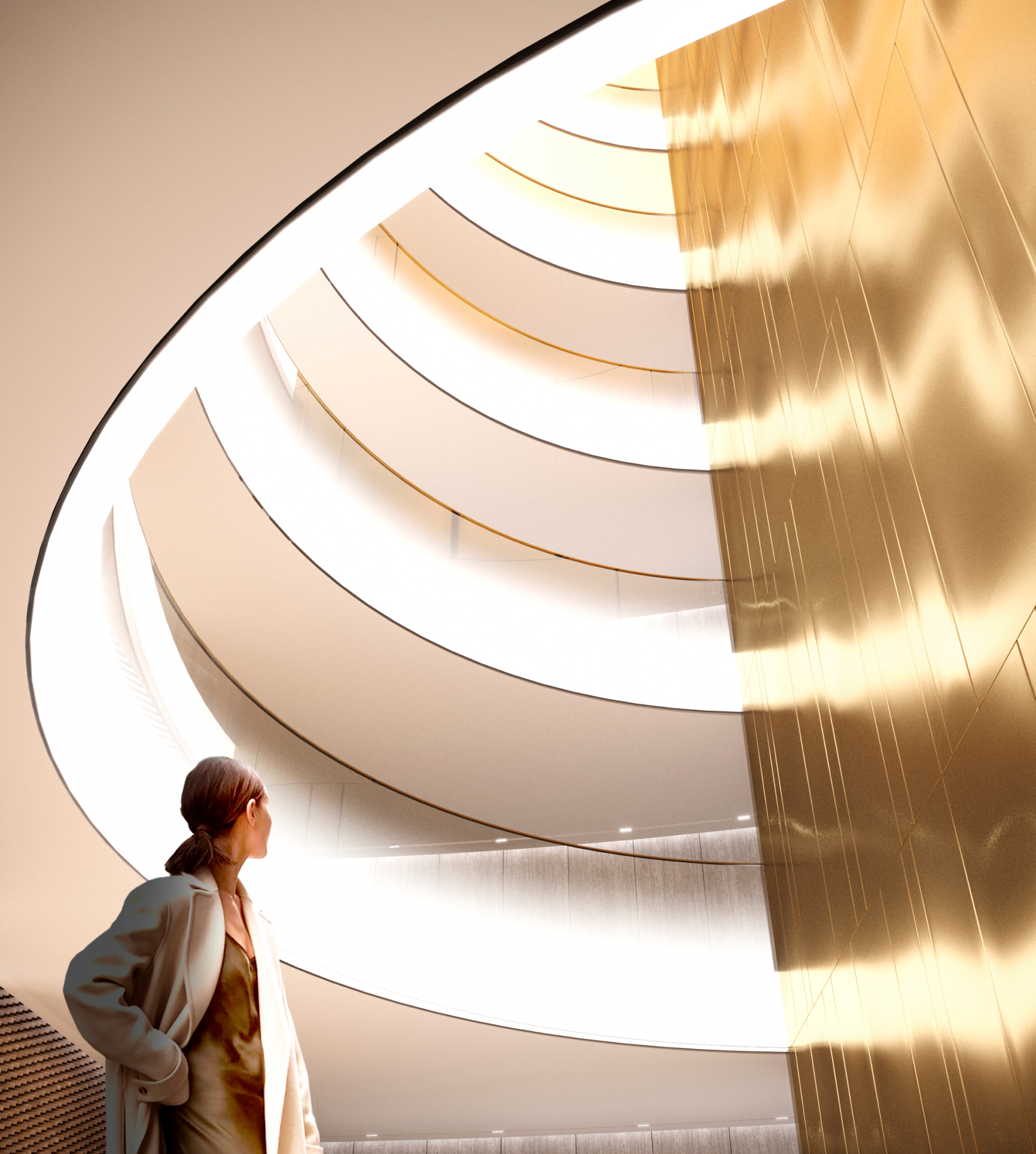 Жилая часть наполнена теплом и золотым светом. Здесь архитекторы задумали интеграцию панно, выполненного из тысяч металлических пластин.