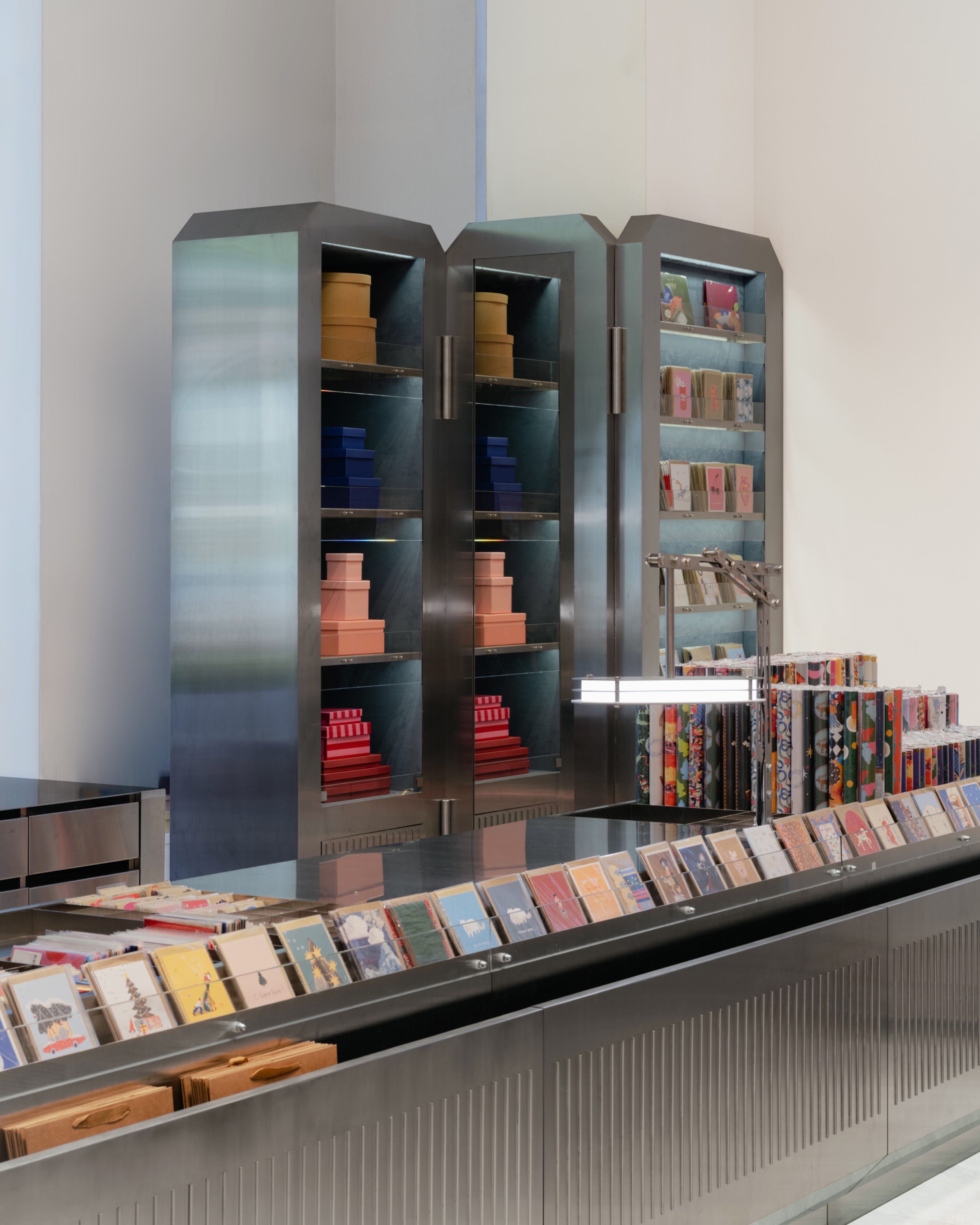 Основная идея торгового оборудования — монументальная интерпретация портативного органайзера. Концепция строится на том, что все пространство магазина воспринимается как одна гигантская, идеально организованная шкатулка или лоток для инструментов, где каждому праздничному предмету отведено свое почетное место.