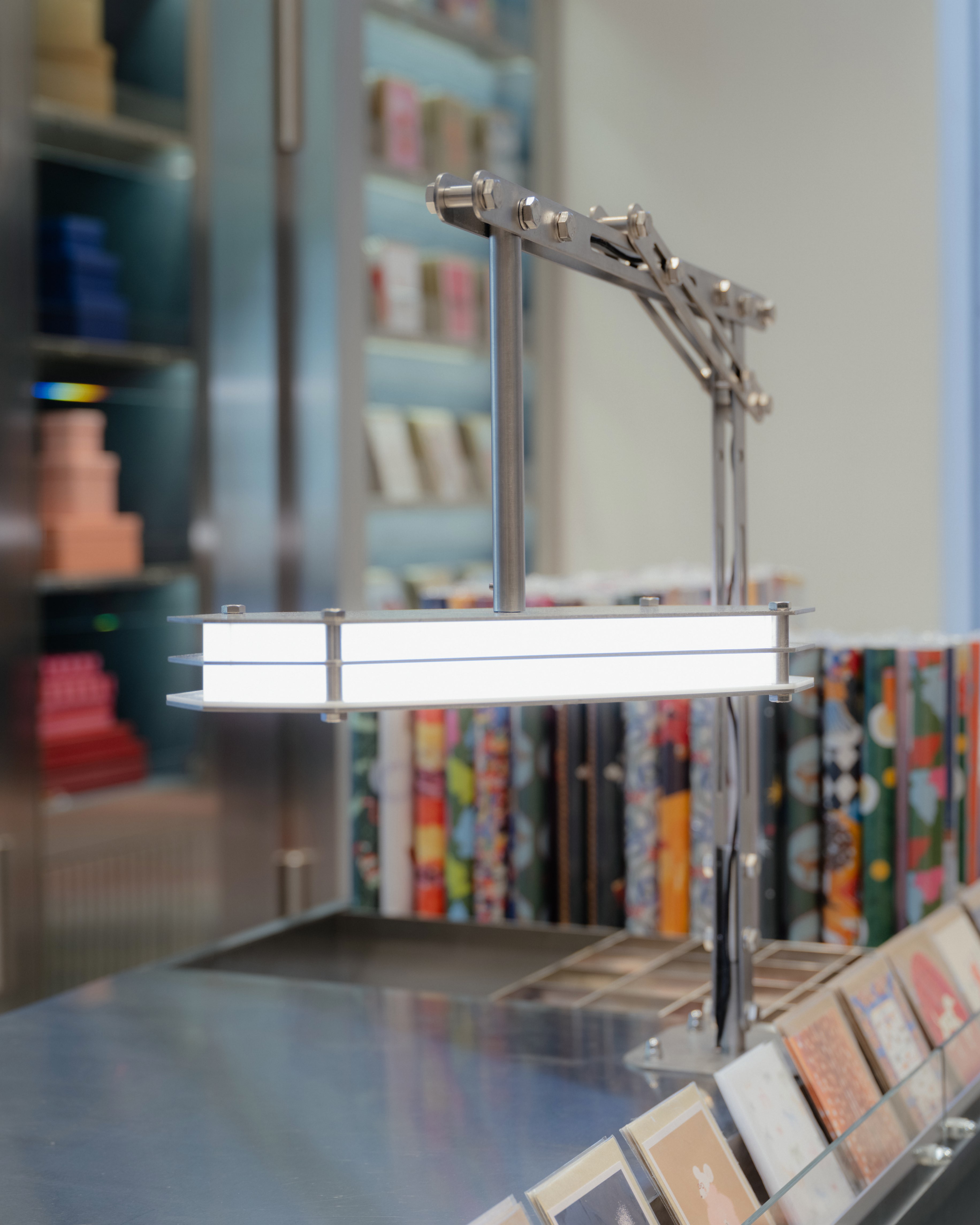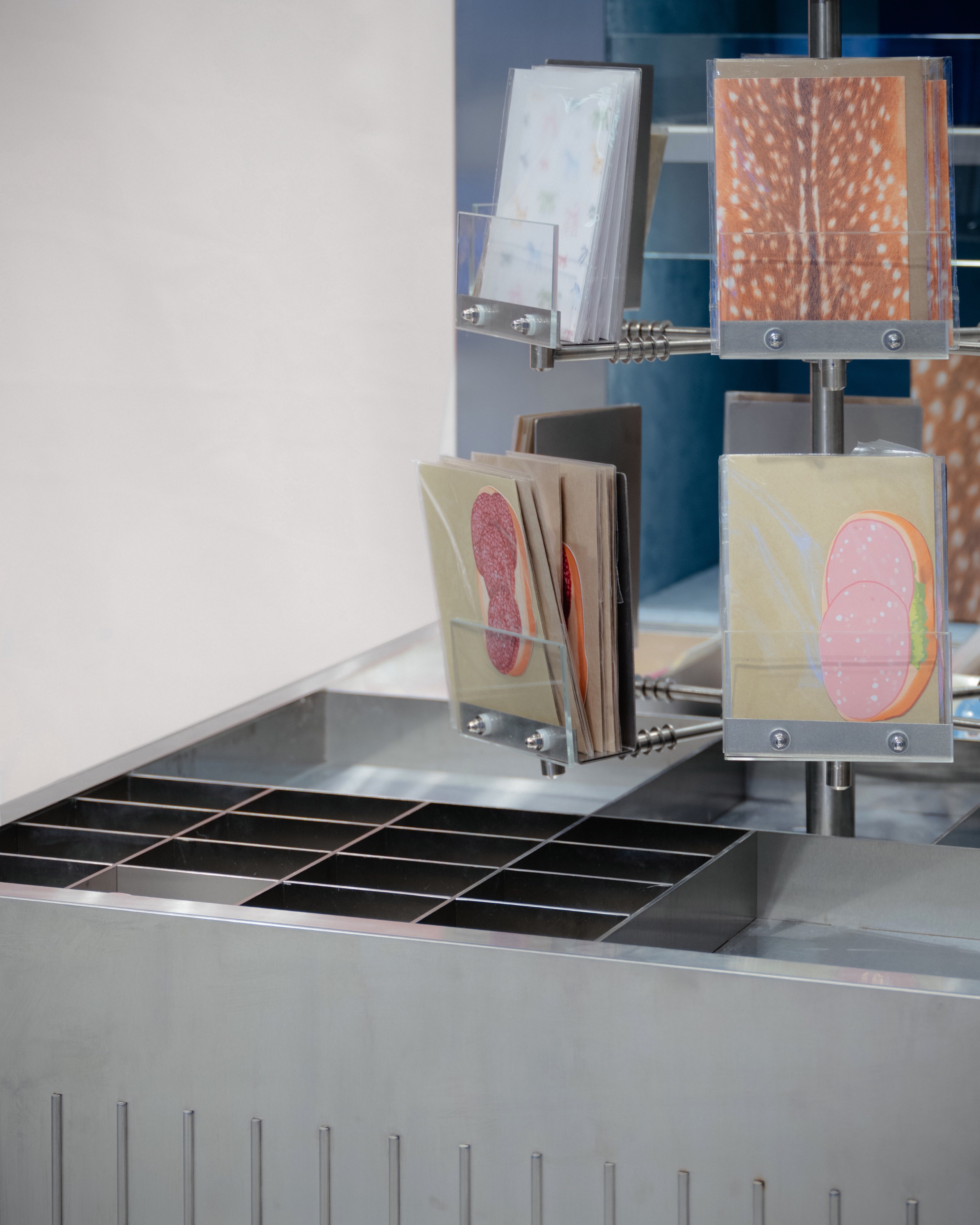 Ключевой дизайнерский ход — использование нержавеющей стали в сочетании с мягкими материалами. Холодный блеск и индустриальная честность стали создают мощный визуальный и тактильный контраст с хрупкой красотой товаров: нежными лентами, фактурной бумагой, глянцевыми шарами. Этот контраст — суть концепции: индустриальная база (каркасы, стеллажи) не подавляет, а, наоборот, усиливает впечатление от праздничной атрибутики, делает ее более утонченной и драгоценной, словно экспонаты в галерее или ювелирные изделия в сейфе.