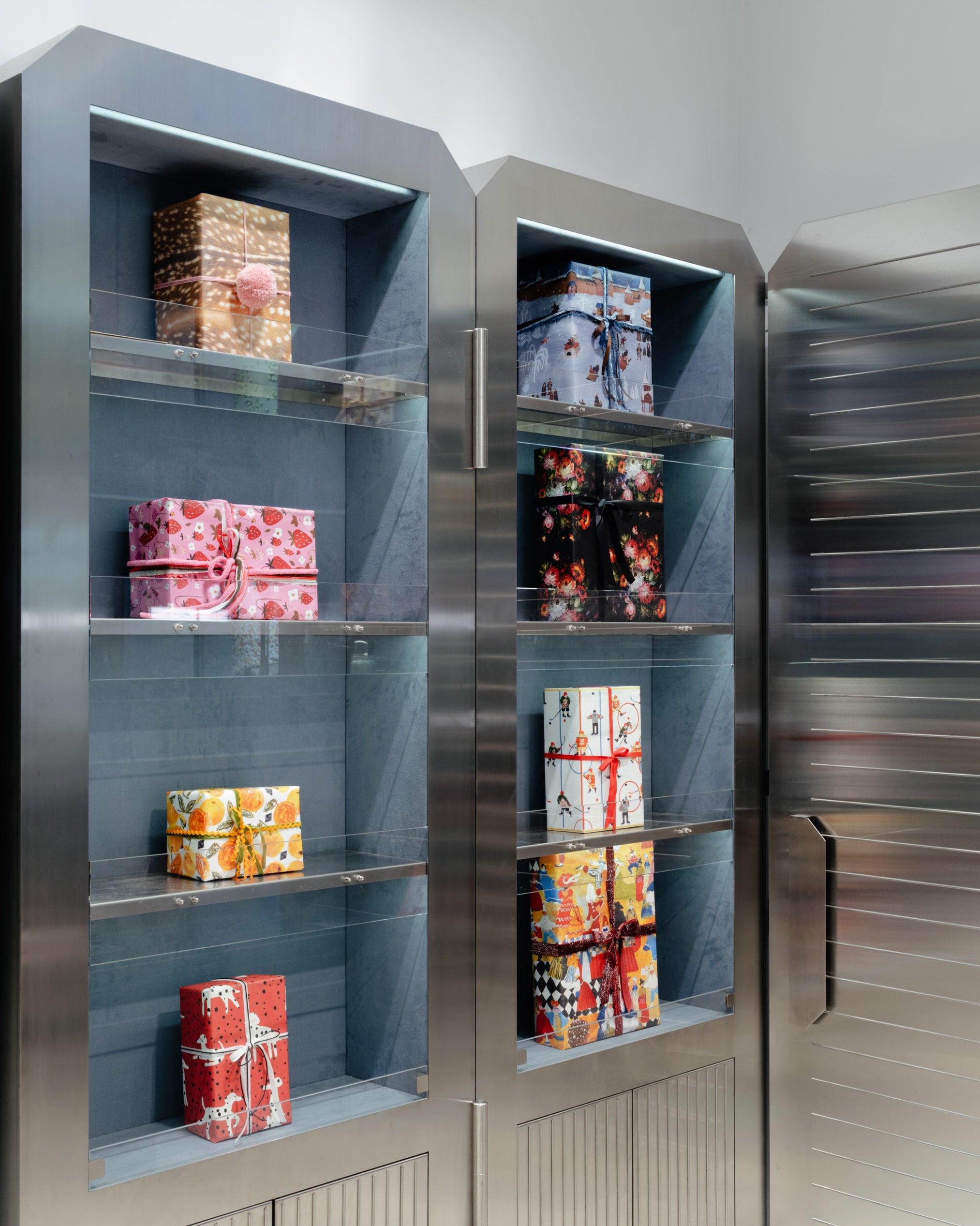 Ниши и выдвижные панели, обрамленные сталью, получили мягкие вставки из алькантары. Этот материал придает тактильное тепло, визуальную глубину и ощущение премиальности, подчеркивая уникальность каждого рулона бумаги, коробочки или декоративного элемента. Алькантара служит идеальным «ложем» для продукции, превращая хранение в эффектную презентацию.
