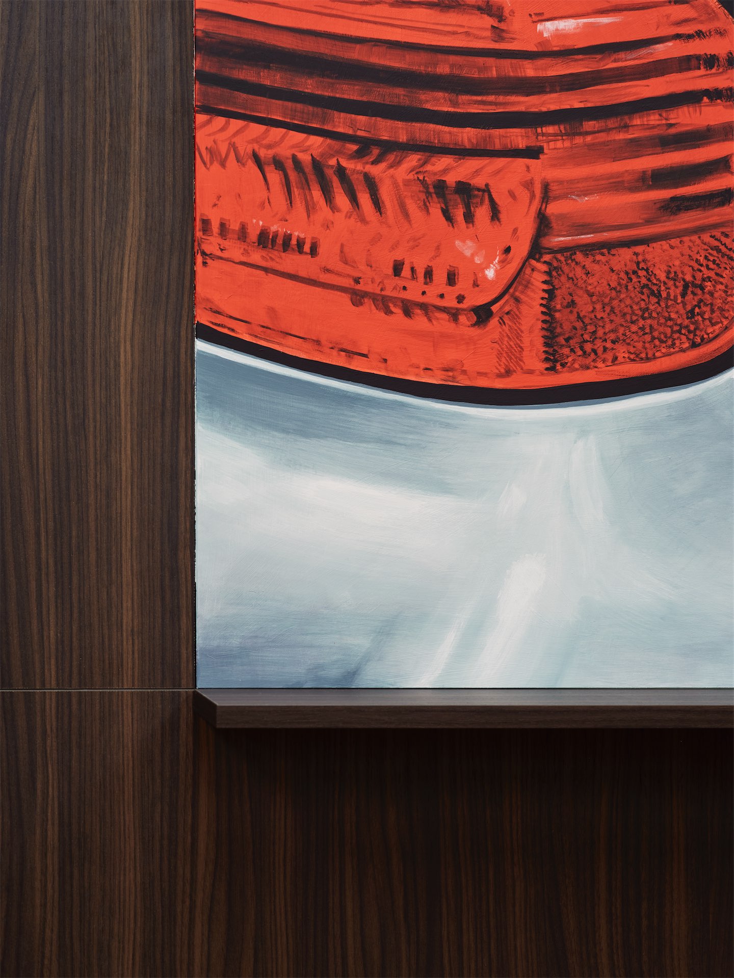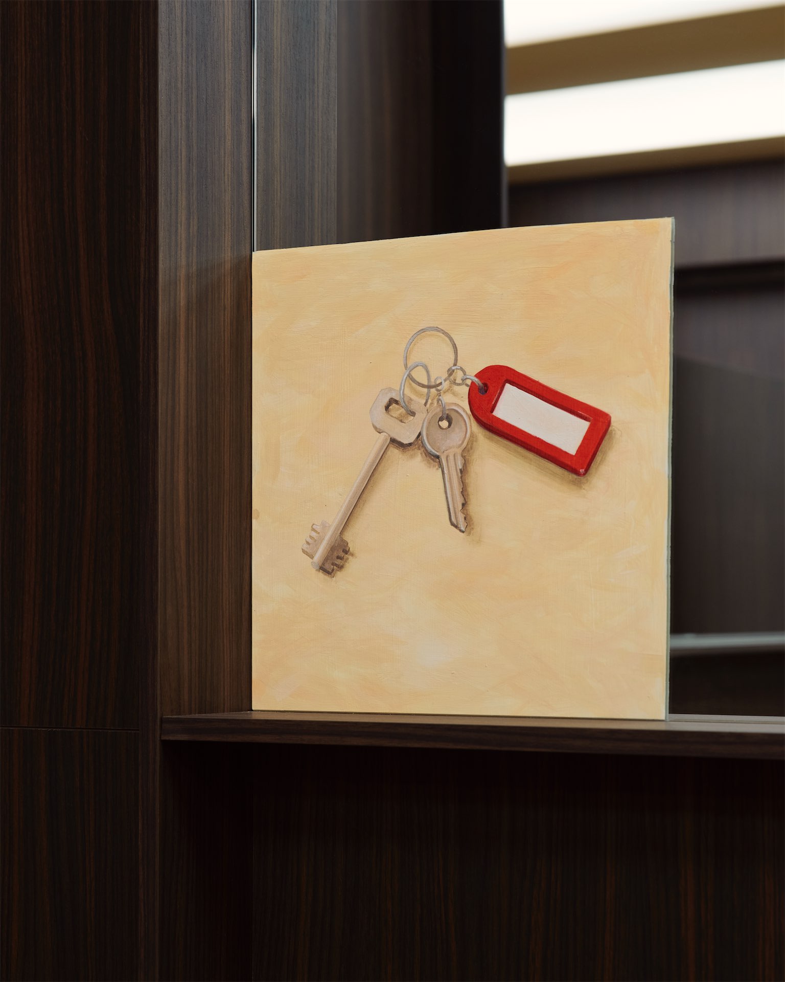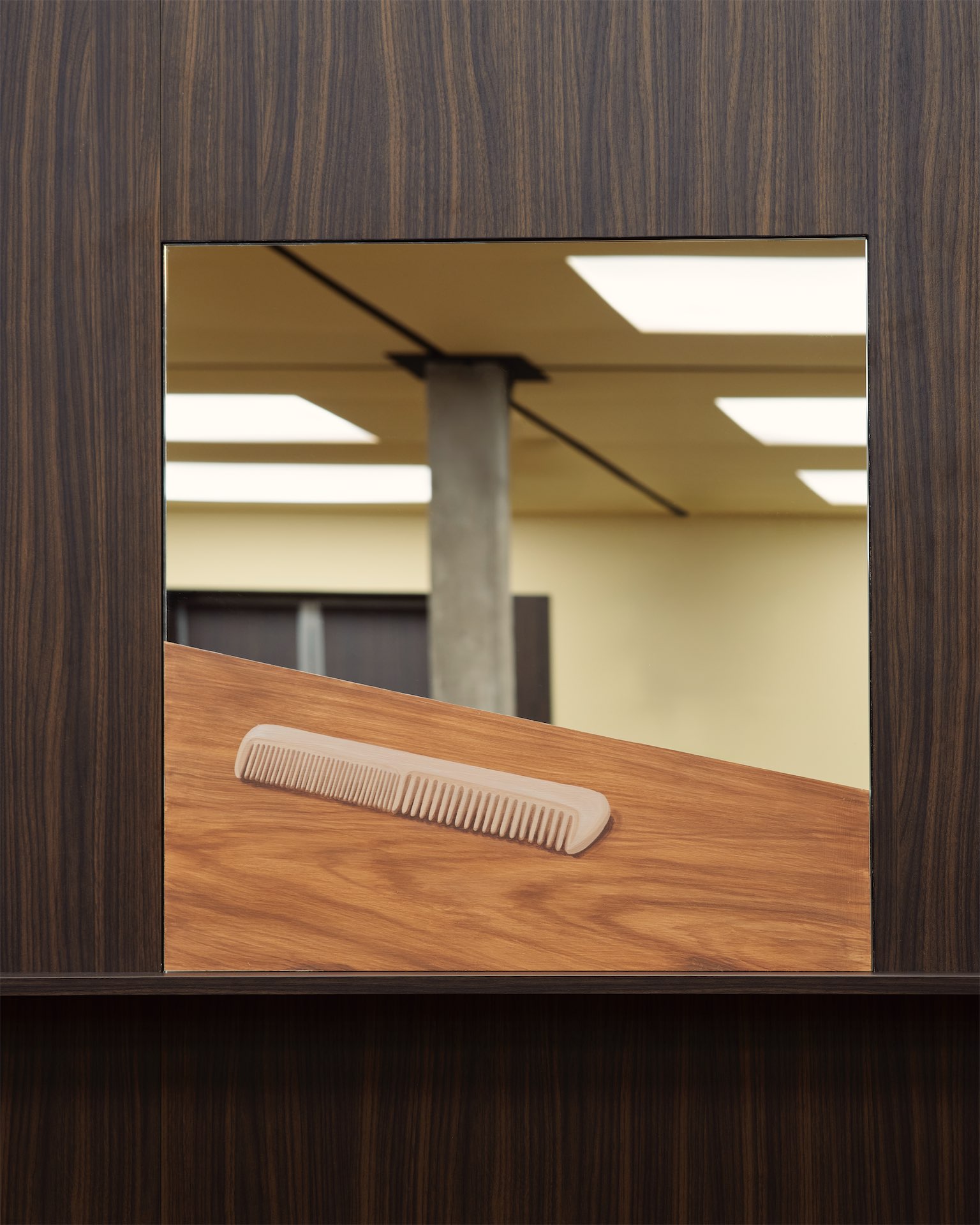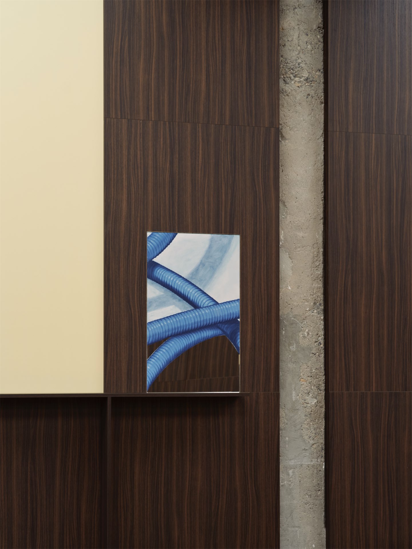 Пространственная композиция построена вокруг зеркал. На их поверхности появляются изображения предметов из повседневной жизни: задний фонарь автомобиля, офисное кресло, остатки еды на столе, камера наблюдения, ключи, календарь. По характеру живописные фрагменты напоминают работы итальянского художника Доменико Ньоли, чья выставка несколько лет назад проходила в Fondazione Prada: крупные, почти медитативные изображения привычных предметов.