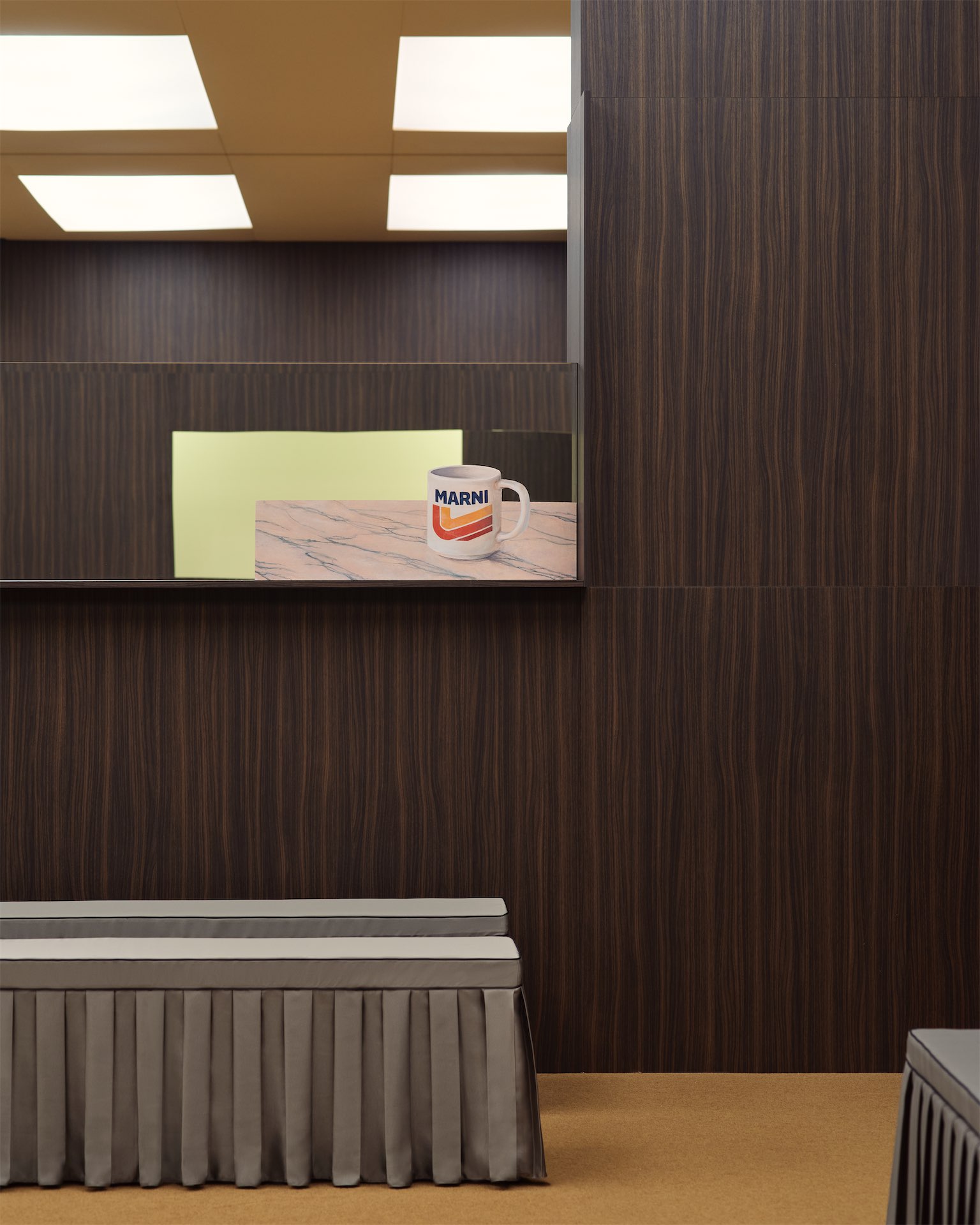Внутри пространства это настроение поддерживали элементы, напоминающие о повседневной рабочей среде: ковролин, кресла, панели, похожие на отделку интерьеров из 1970-х. Но все они были слегка смещены по масштабу или контексту, словно привычный офис вдруг превратился в декорацию.