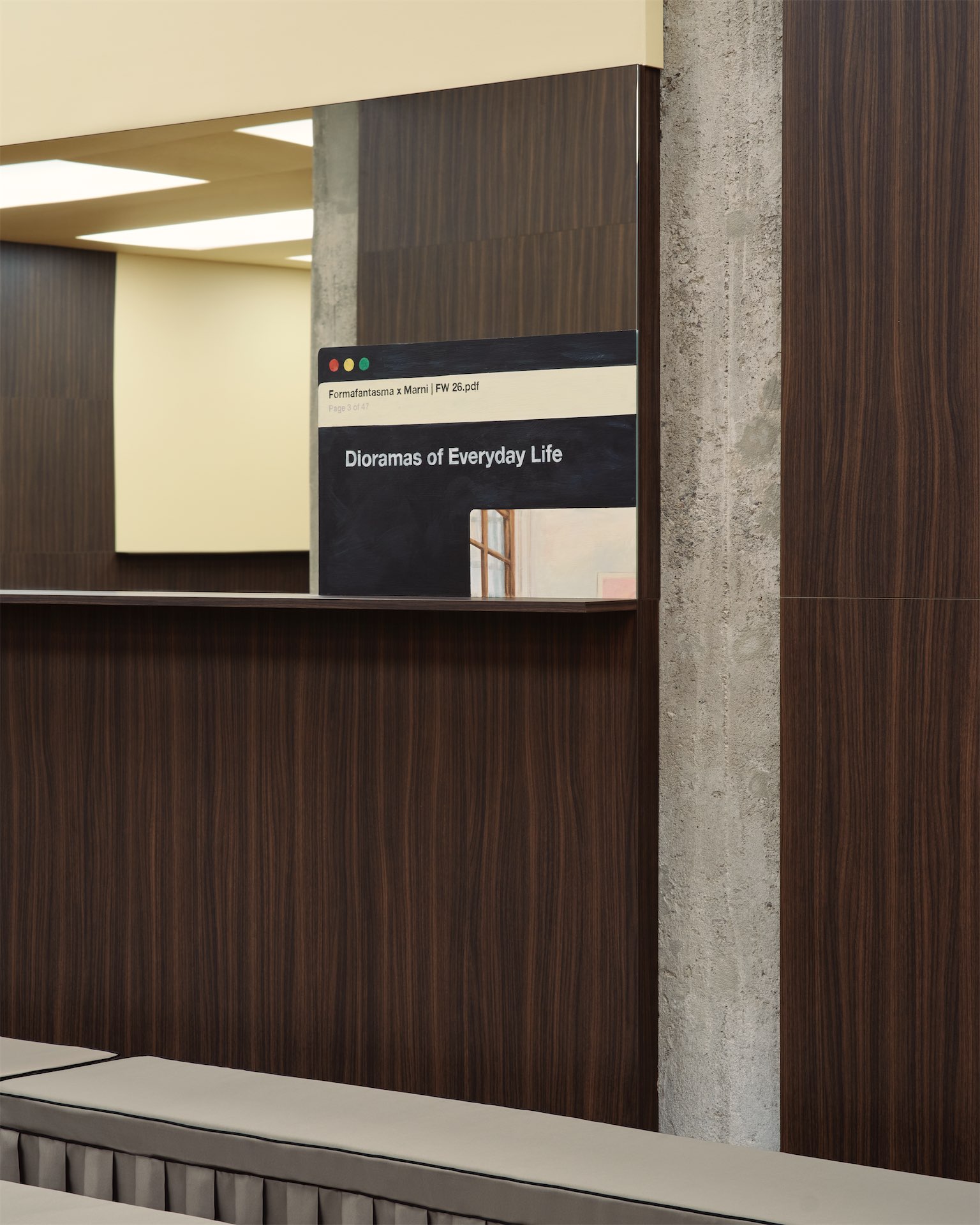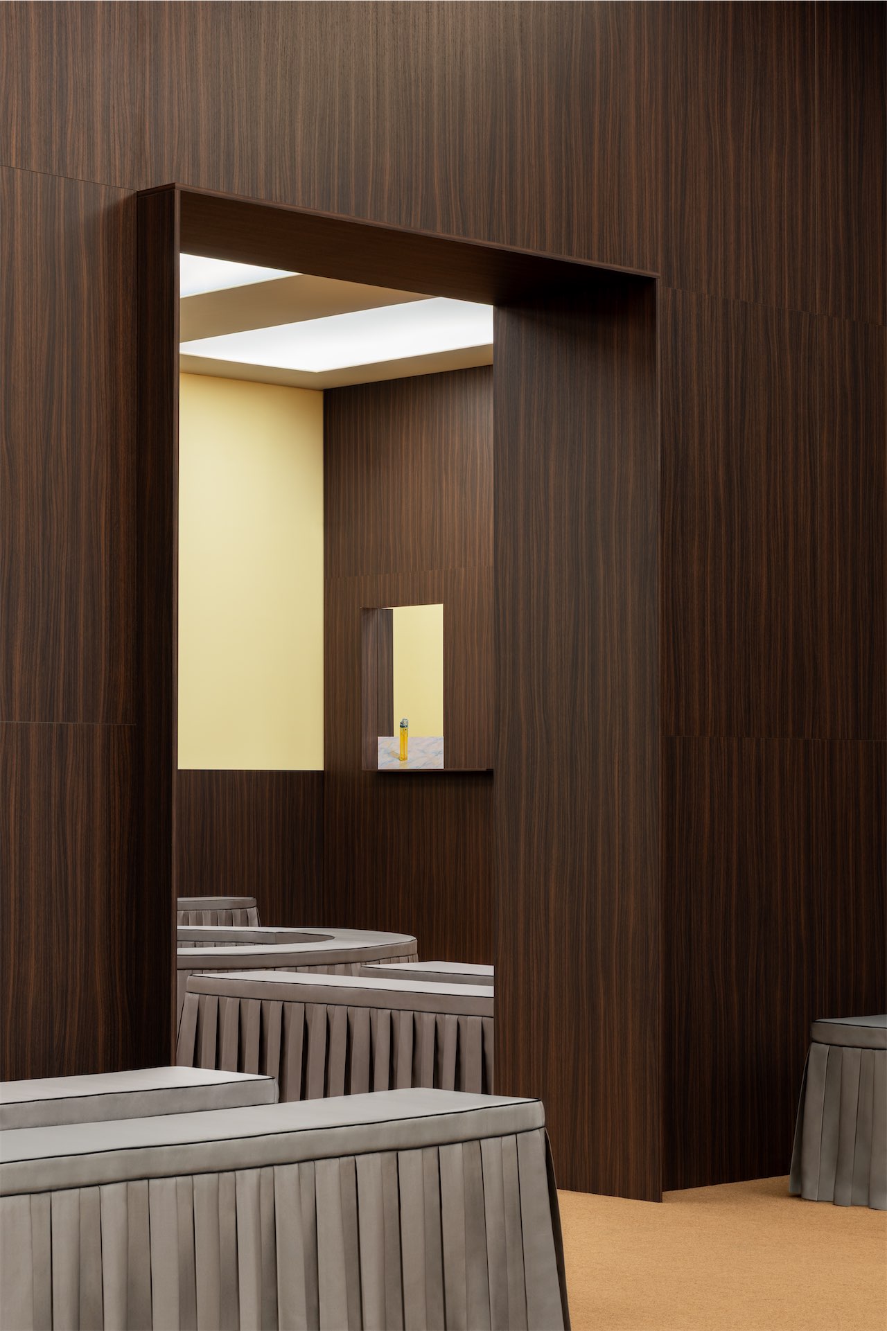 Особую роль играет пол: вместо привычного ковра дизайнеры используют увеличенную до монументального масштаба форму дверного коврика. Этот простой предмет становится символом перехода — порога между улицей и домом, между повседневной жизнью и театральностью подиума. Так пространство буквально помещает моду в контекст повседневности.