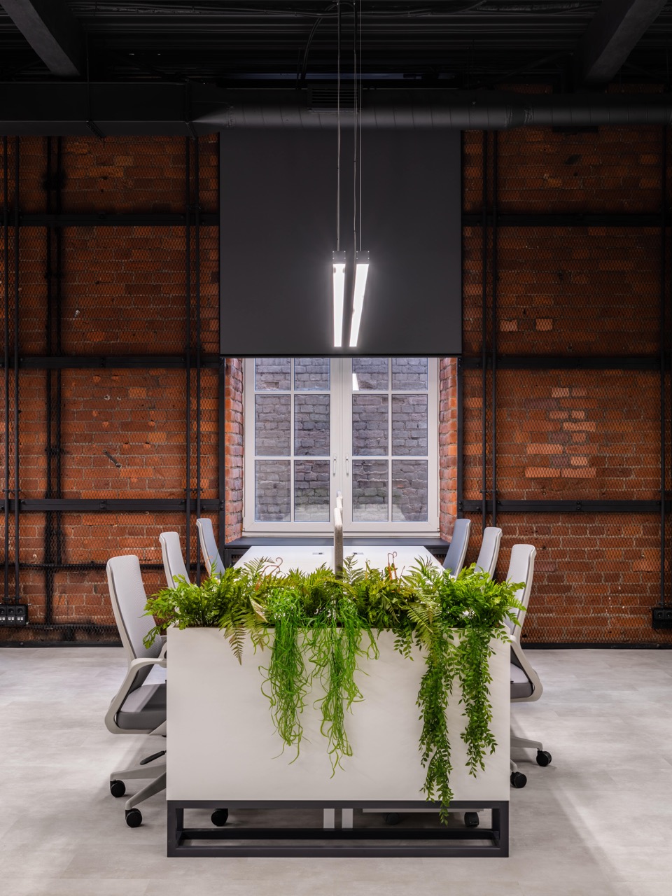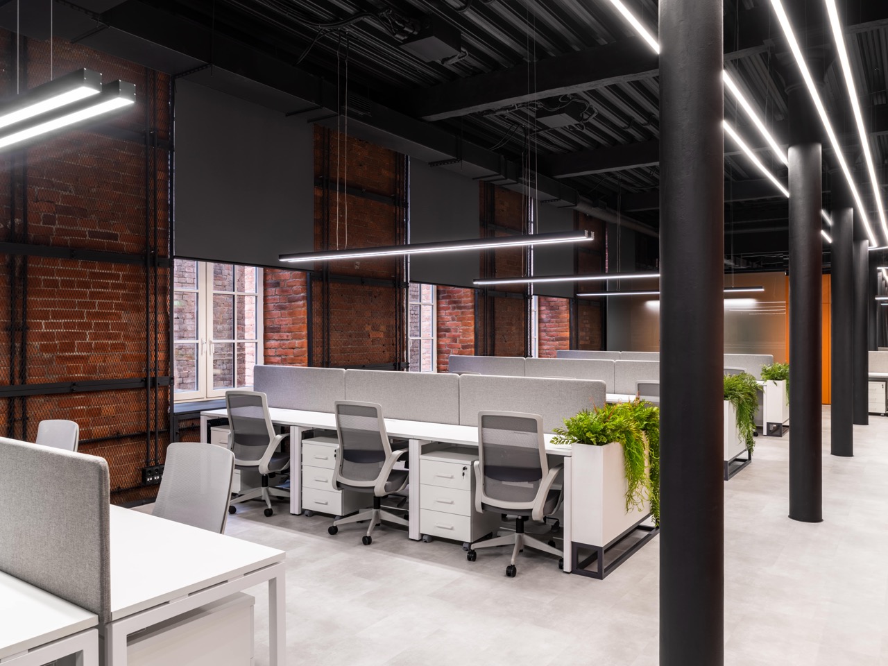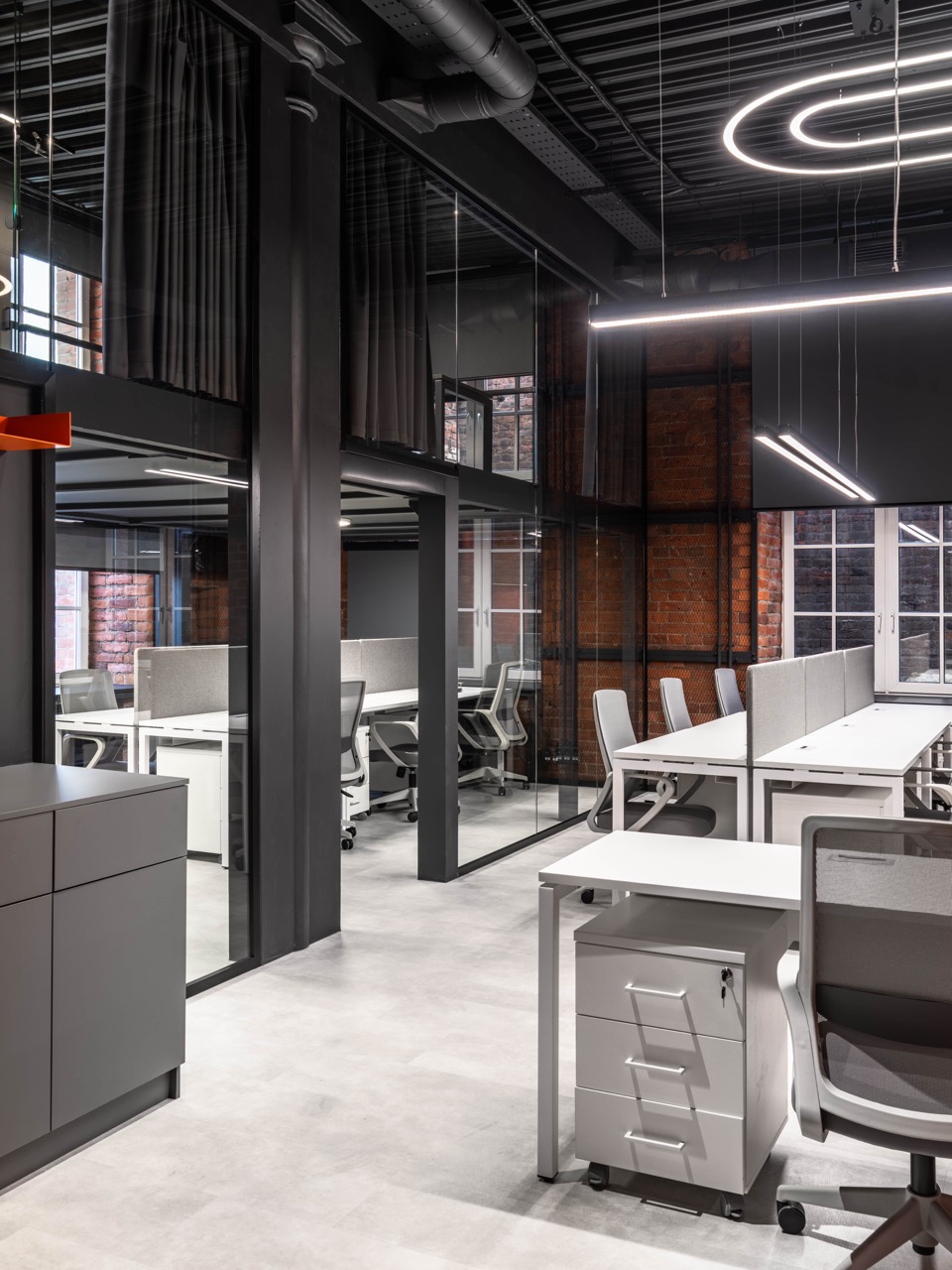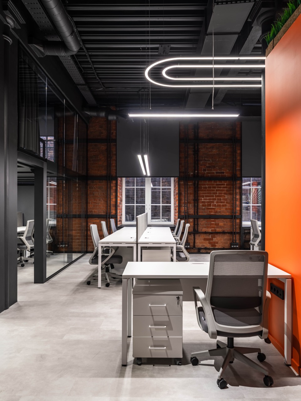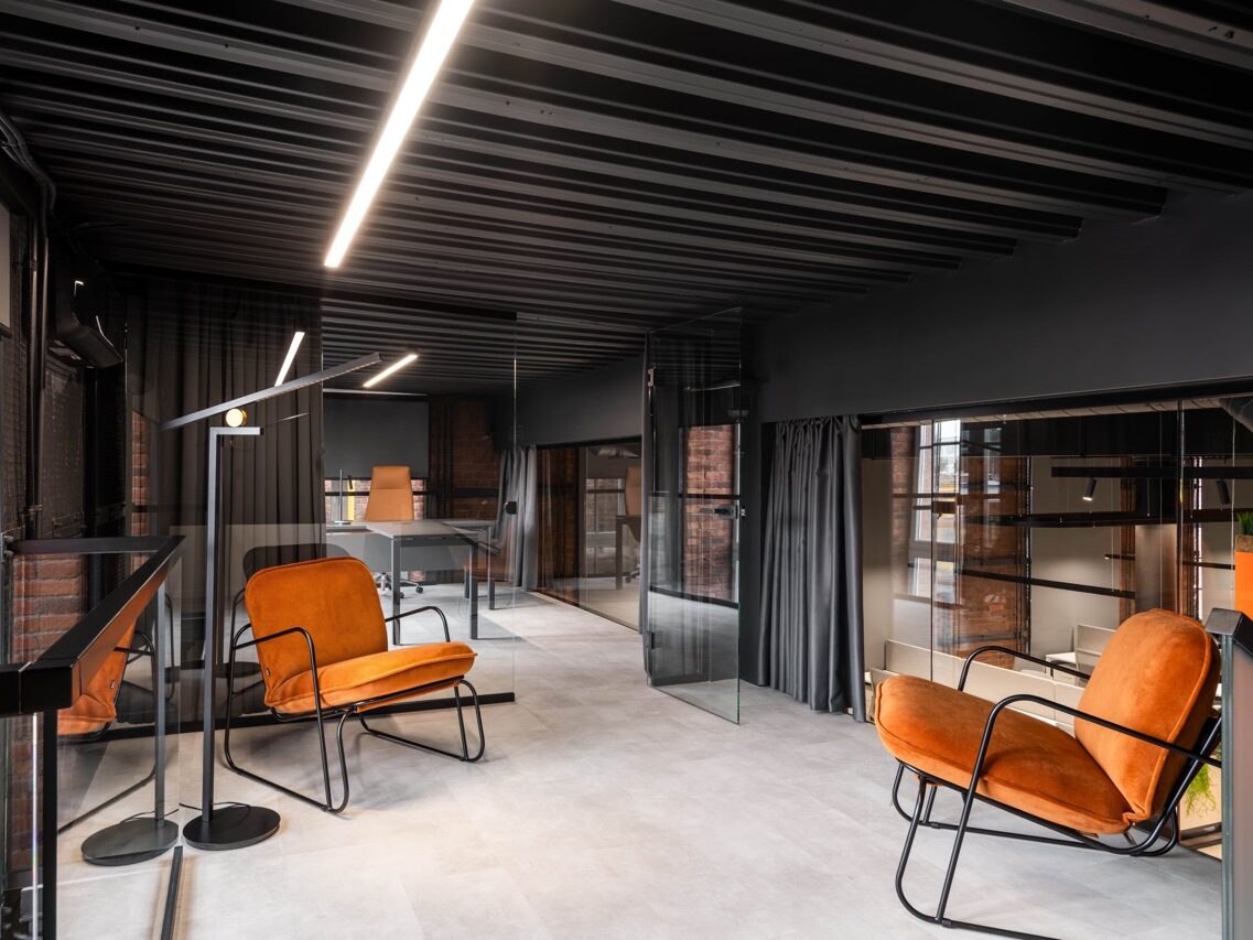 В основе концепции лежит идея сохранения «промышленного кода» пространства и создания комфортной и вдохновляющей среды для современной команды. Стиль «лофт» здесь — не просто декоративный прием, а осознанное продолжение архитектурной логики самого здания: открытые коммуникации, металлические конструкции, кирпичные поверхности и большие оконные проемы стали фоном для новой деловой атмосферы.