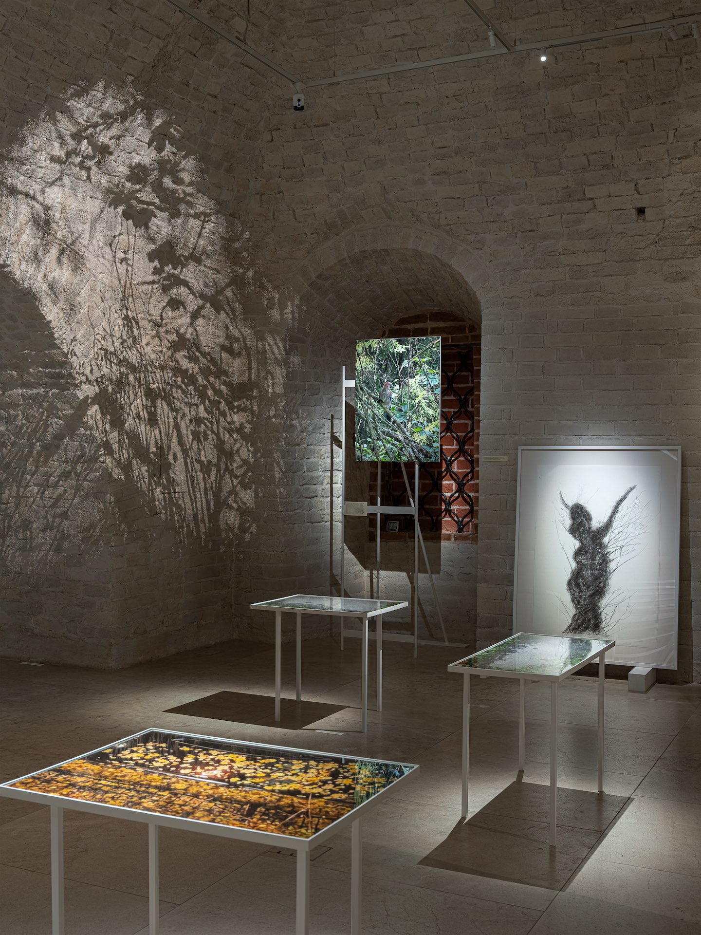Я бы сказала, что природный ландшафт зала выстраивается по природному принципу. Видео, которое мы видим издалека, проекция, рисунки, фотографии, игра света и тени, казалось бы, на первый взгляд не подчиняются никакой общей структуре, но при этом составляют единый мир. Это и есть магия, которую мы встречаем в природе, которую умеет видеть Ольга Чернышева.