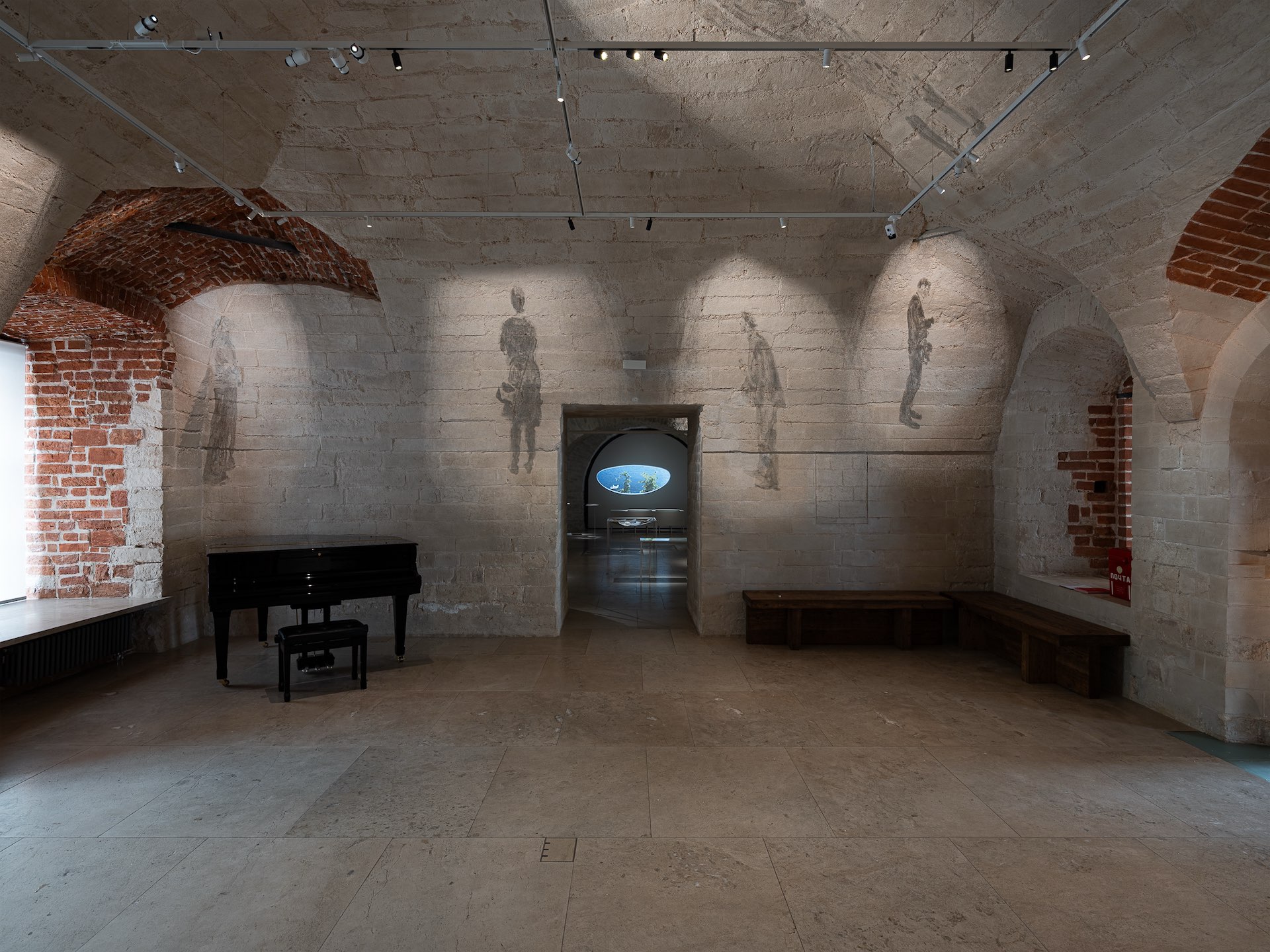 Нас встречают проекции зрителей, помещенные на своды, которые работают практически как фрески. Это авторская идея, которая сразу поражает зрителя, взаимодействует с ним, ненавязчиво связывает два боковых зала. Хотя у нас и есть деление на отдельные помещения, выставка воспринимается бесшовной – это и есть воплощение первоначальной идеи автора о пути как лемнискате (прим. редакции — кривая, имеющая форму восьмерки или знака бесконечности). Входное пространство становится узловой точкой.