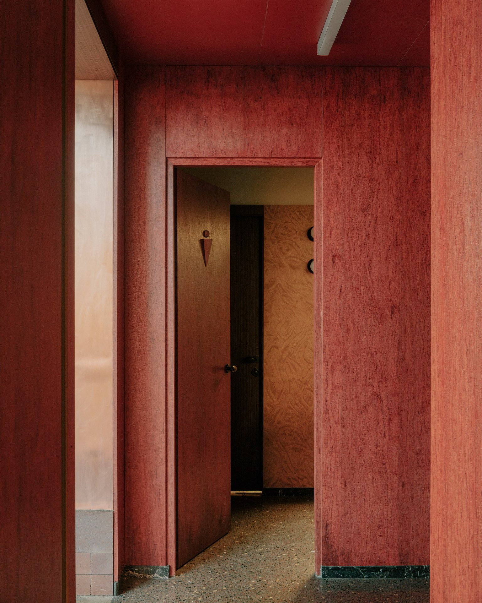 Ресепшен задуман как точка первого эмоционального контакта с местом. Пространство размещено в стеклянном объеме, напоминающем оранжерею: витражные стены растворяют границу между интерьером и природой, впуская пейзаж внутрь. В основе концепции — память о плантациях роз, которые когда-то существовали на этой территории. Шпон нежно-розового дерева и медные поверхности теплого оттенка формируют мягкую, почти тактильную атмосферу, а стойка ресепшен, выполненная из массивных блоков локального мрамора, буквально «заземляет» интерьер, связывая его с геологией места. Встроенные элементы — от мебели до света — разработаны студией. В качестве дополнения — объекты Santa & Cole и светильники Бруно Мари для Artemide, которые деликатно вписываются в общую композицию.