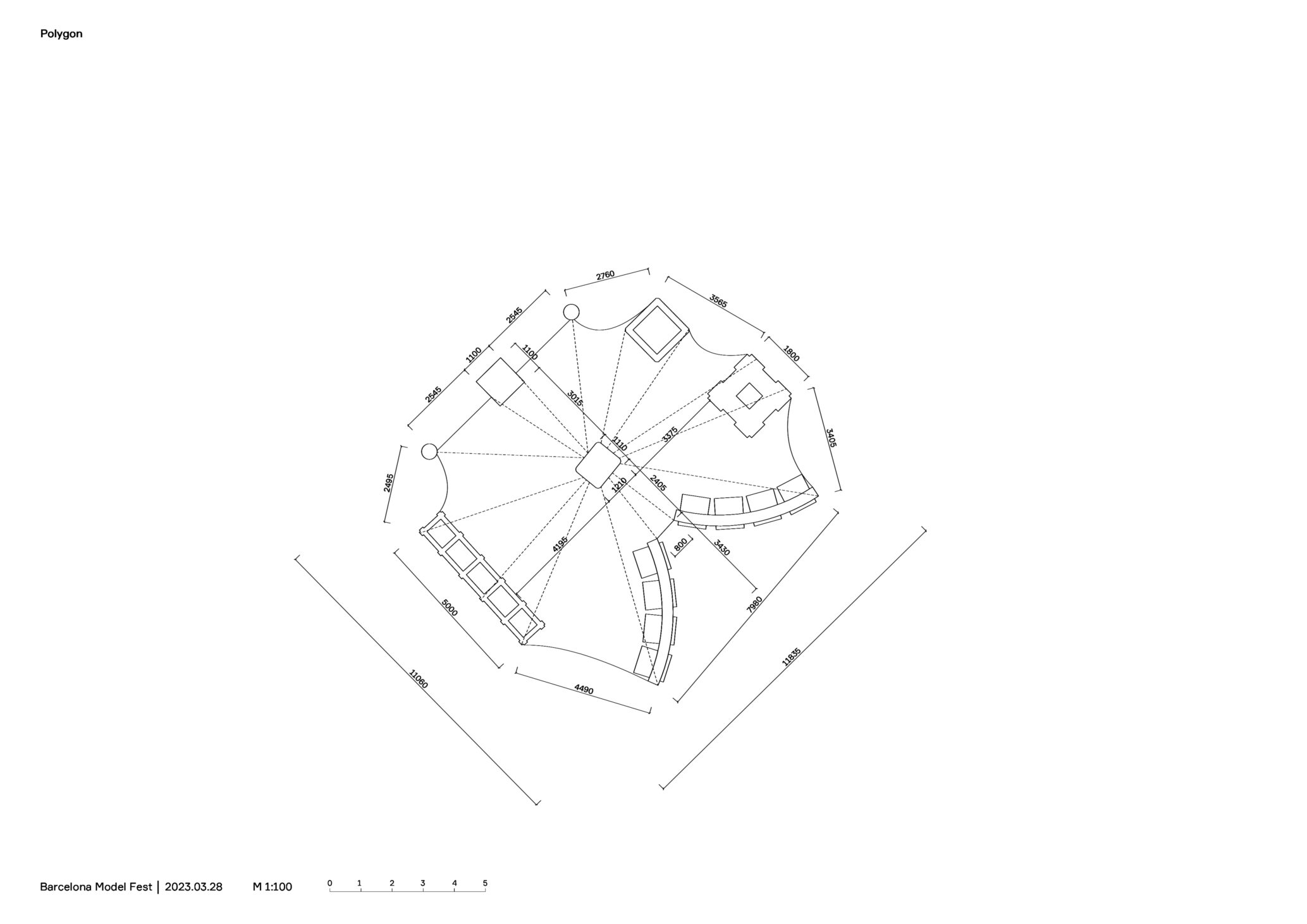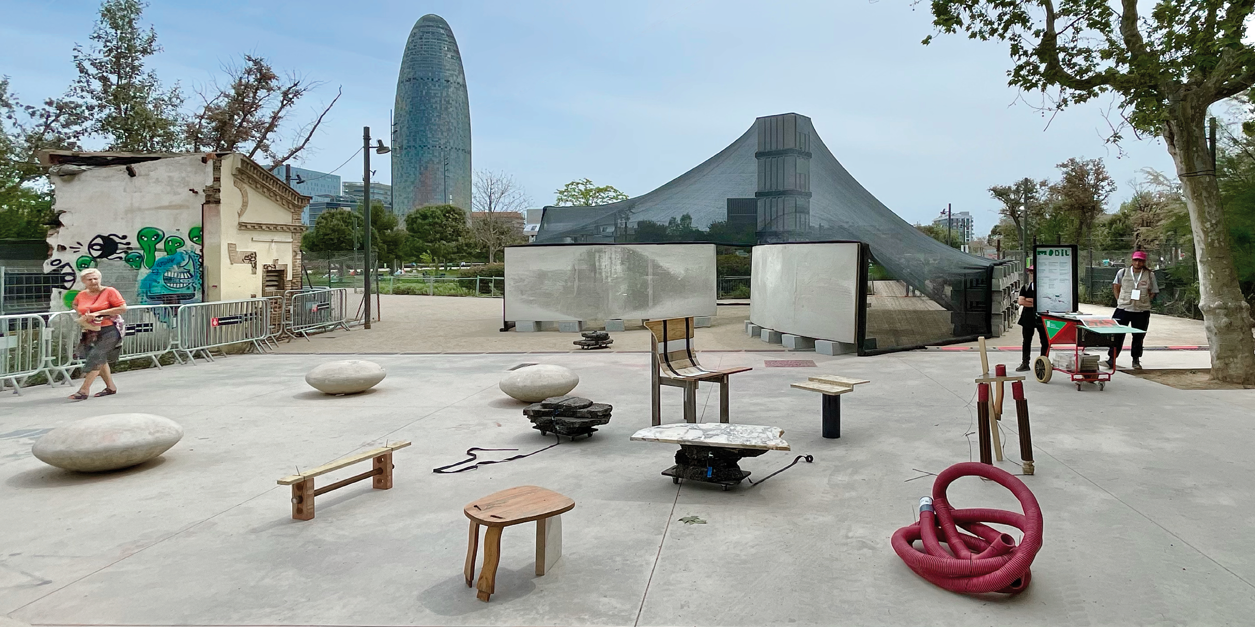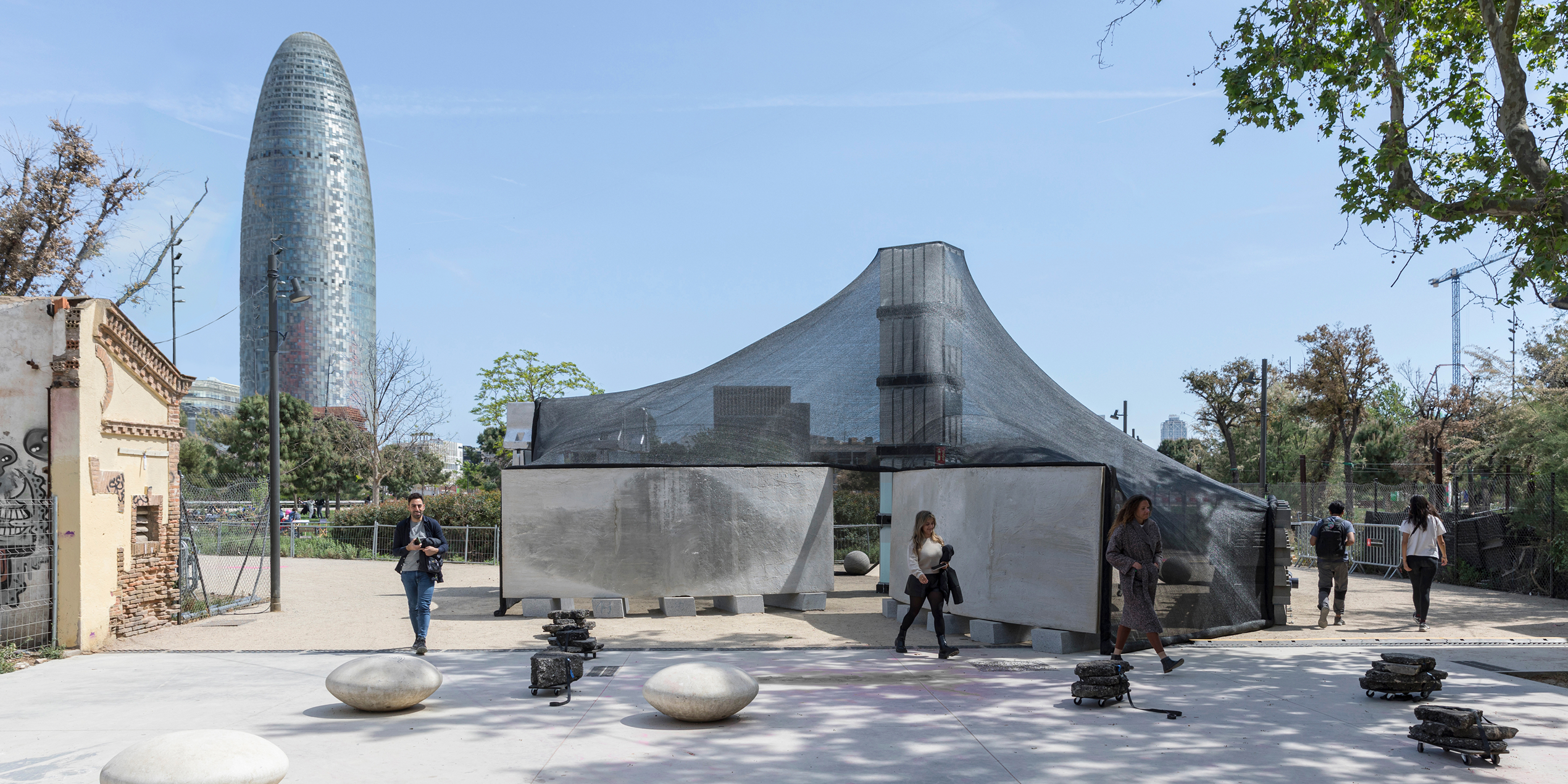 Фрагменты зданий и найденные нами материалы со складов собраны в высокие вертикальные тотемы, служащие, одновременно, структурными элементами павильона, и символом его источника — складских помещений на периферии Барселоны. Центральный элемент — колонна — собрана из резервуаров для воды. Она является опорой для легкой шатровой вуали крыши, сделанной из сетчатой строительной фасадной ткани. Колонна подсвечена изнутри и в ночное время служит своеобразным маяком в парке.