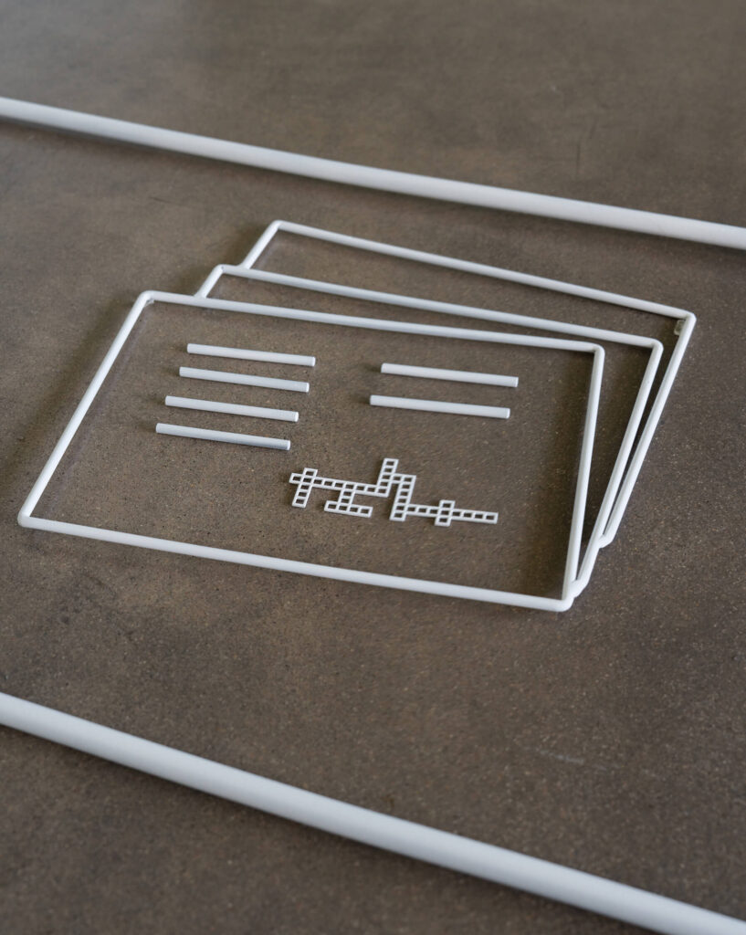 Инсталляция представляет с собой выложенные на полу скульптуры из стали — контуры предметов мебели. Художница предлагает посетителю две точки обзора: сверху, как на чертеже масштаба 1:1, и изнутри предполагаемой обстановки.