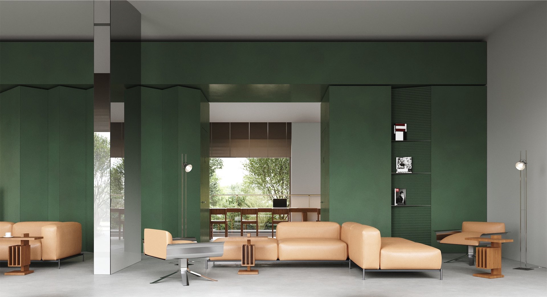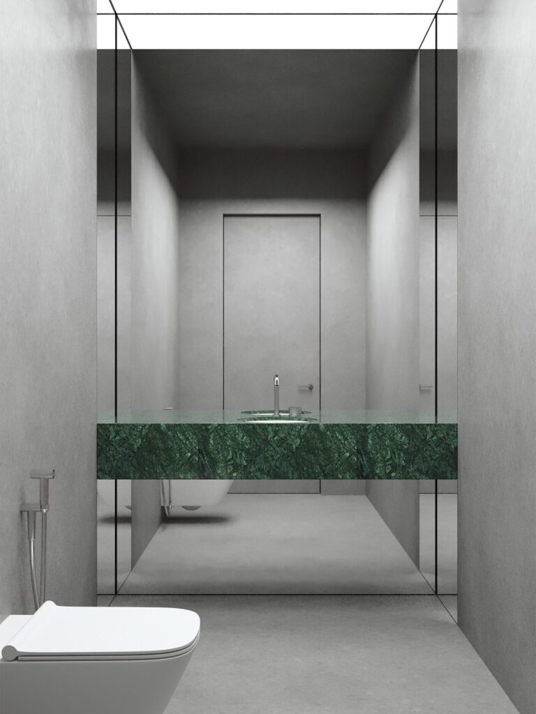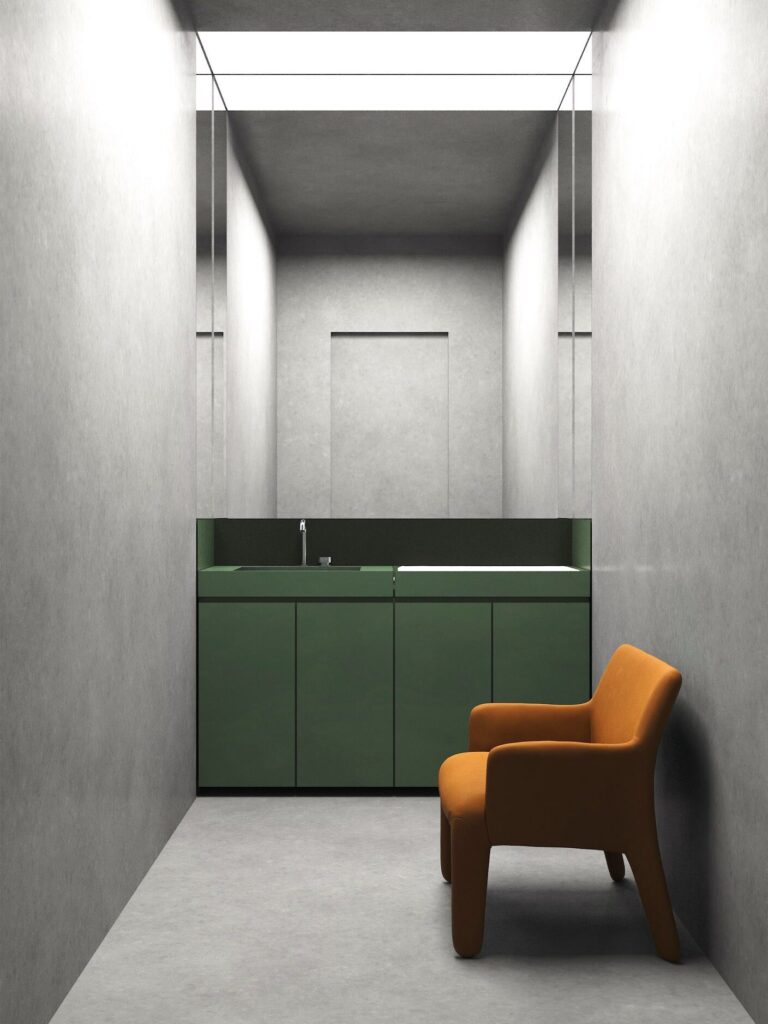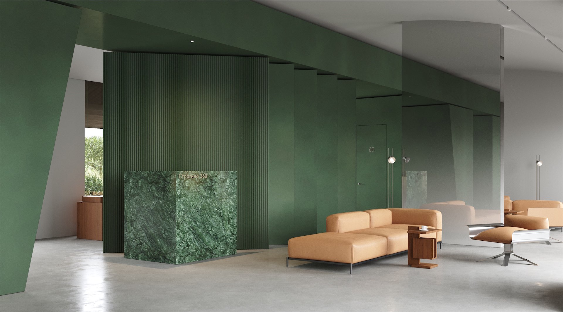 Доминантой пространства гранд-лобби стала изумрудная стена, геометрия которой перекликается с пластикой фасадов жилого комплекса. Объем выполняет одновременно скульптурную и функциональную роль: внутри него размещены комната матери и ребенка, переговорная для персонального пользования и санузел.