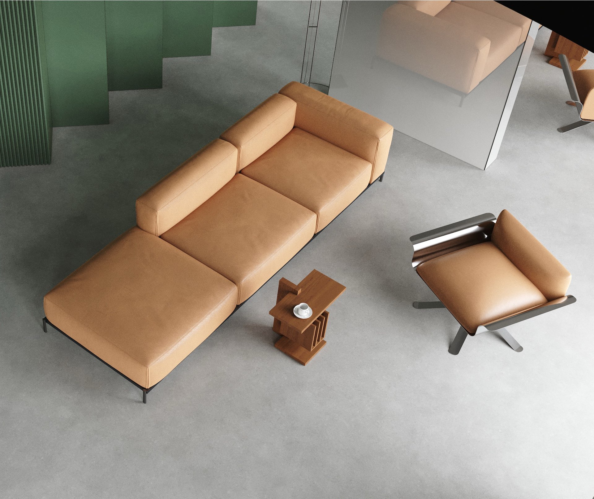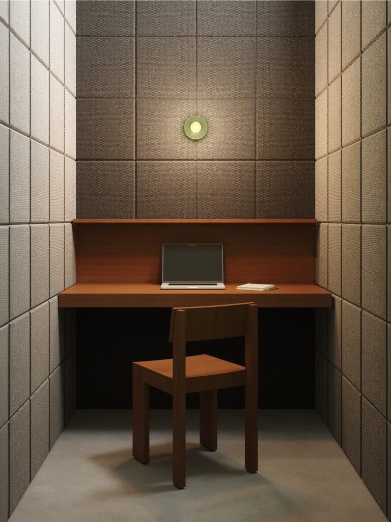 Лаунж оформлен дизайнерской мебелью, часть предметов разработана специально для проекта. В пространстве также используются кресла Demure Armchair, созданные бюро .dpt. В зоне коворкинга предусмотрены рабочие столы с дополнительным освещением, шкафчики для личных вещей и переговорная, которую можно забронировать.