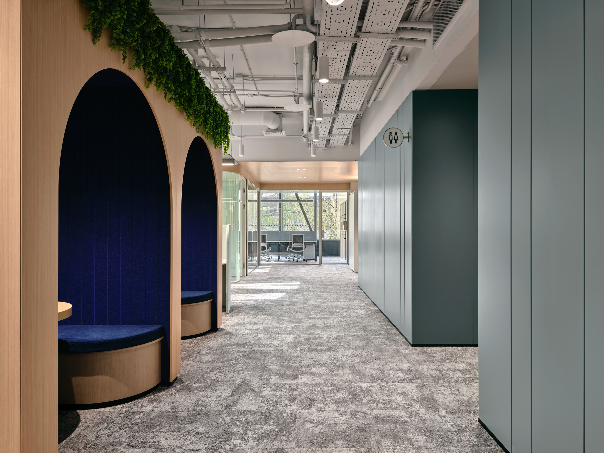 Вдоль основного ядра размещены ниши для встреч, выполненные из акустического войлока с интеграцией зеленых акцентов, а также демонстрационные зоны с мебелью и элементами фирменного дизайна. Эстетика бежево-синих оттенков и черные элементы фурнитуры подчеркивают премиальность интерьера.