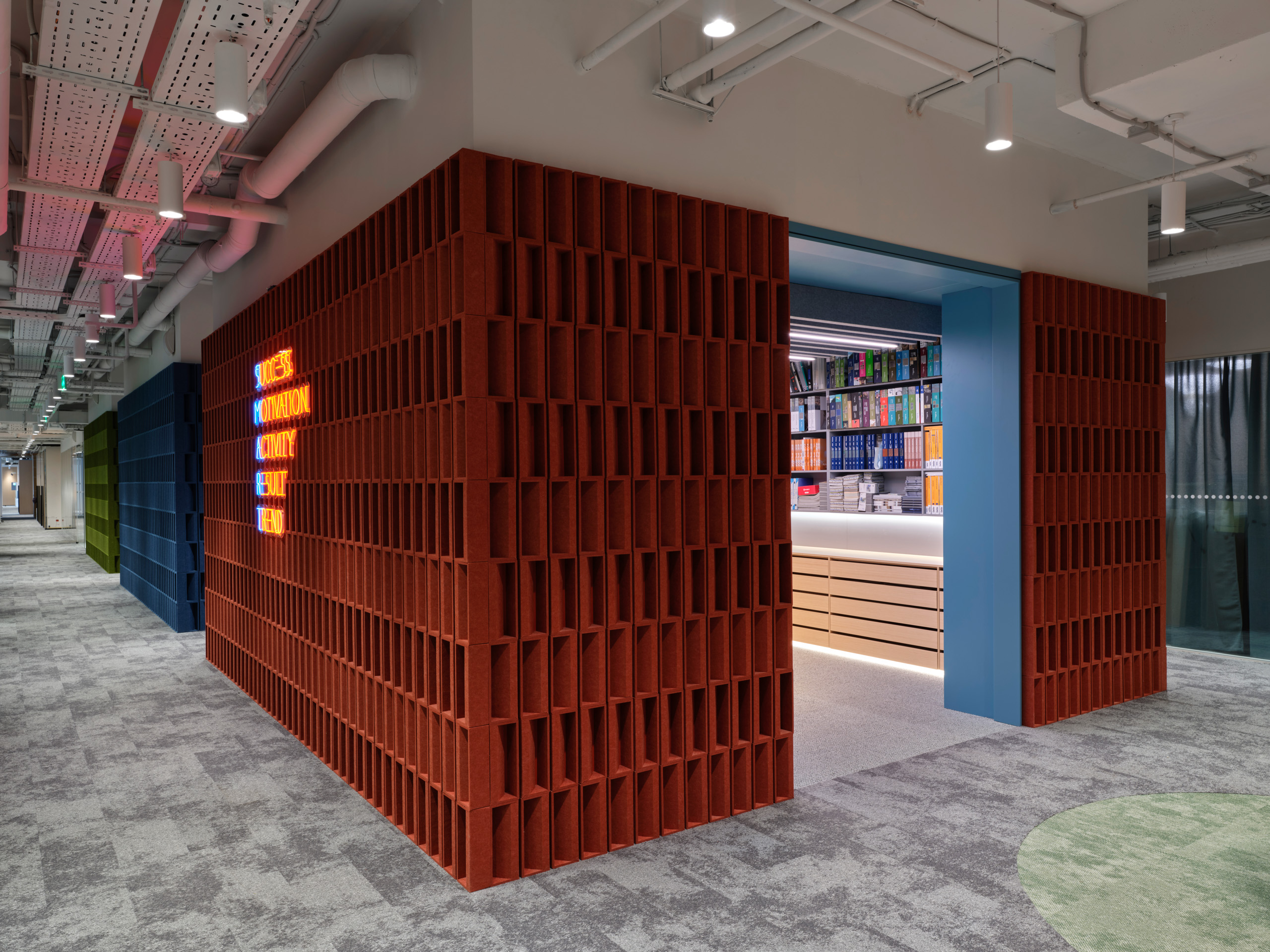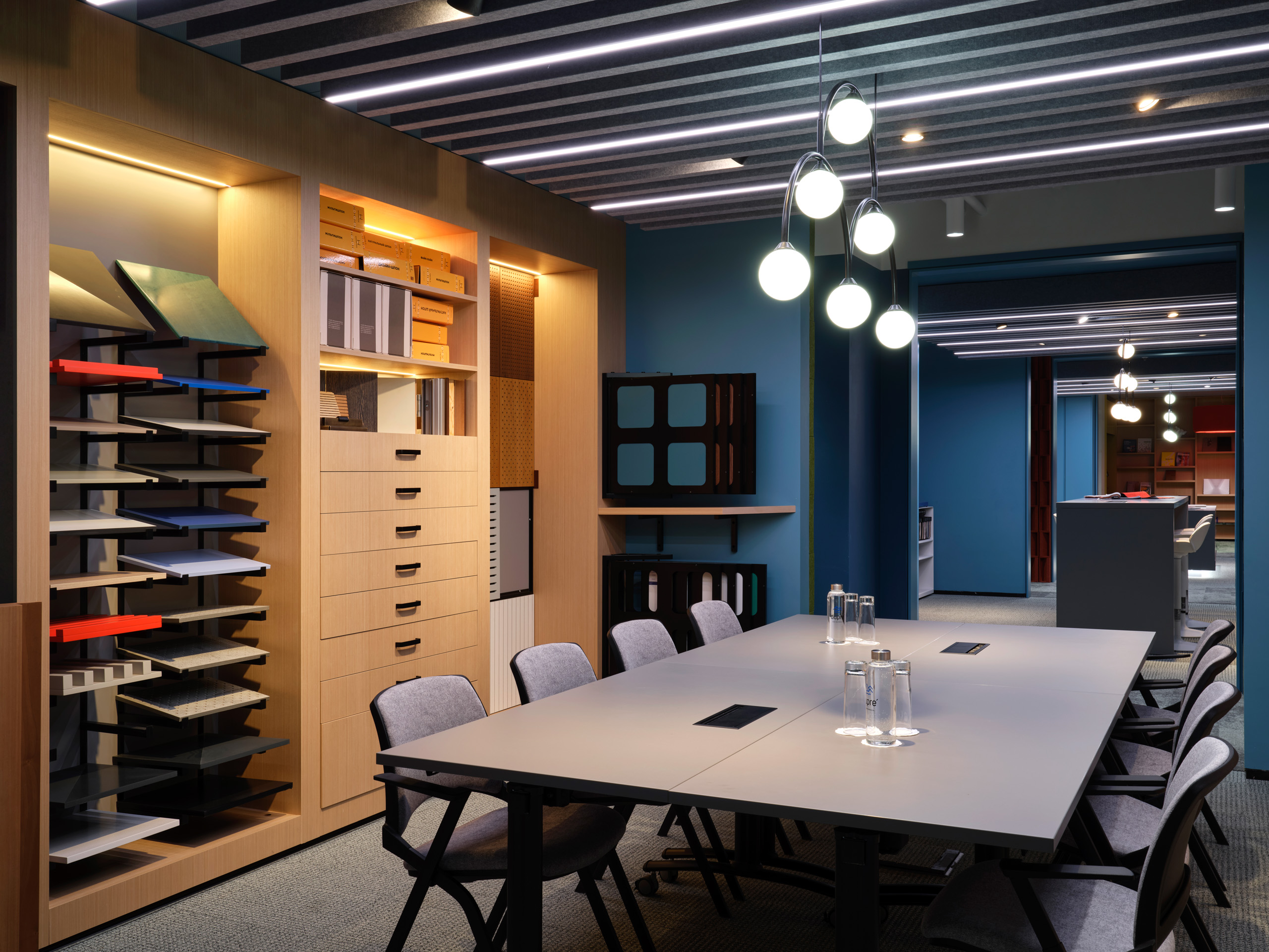 Важным элементом стал «бульвар из войлочных кубов» — зона для работы с образцами и материалами компаний холдинга Smart Group. В ней интегрированы акустические решения и выразительный дизайнерский свет, использованы серо-синие цветовые решения и натуральное дерево — идеальный фон для продуктовых презентаций.