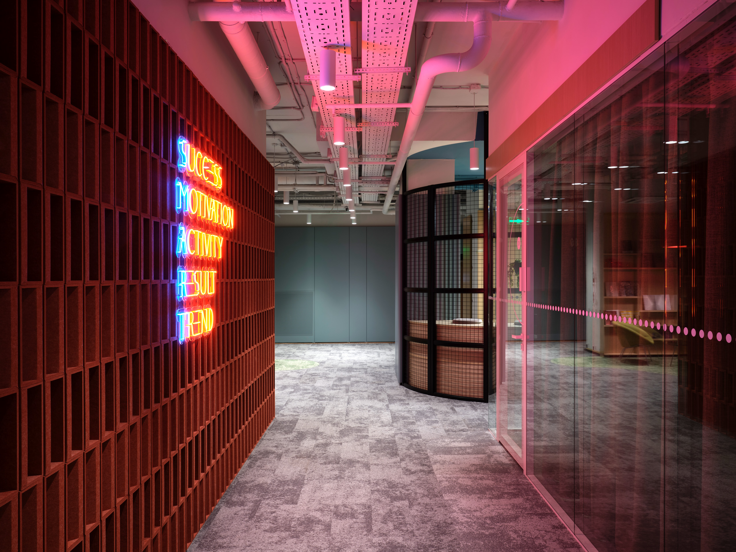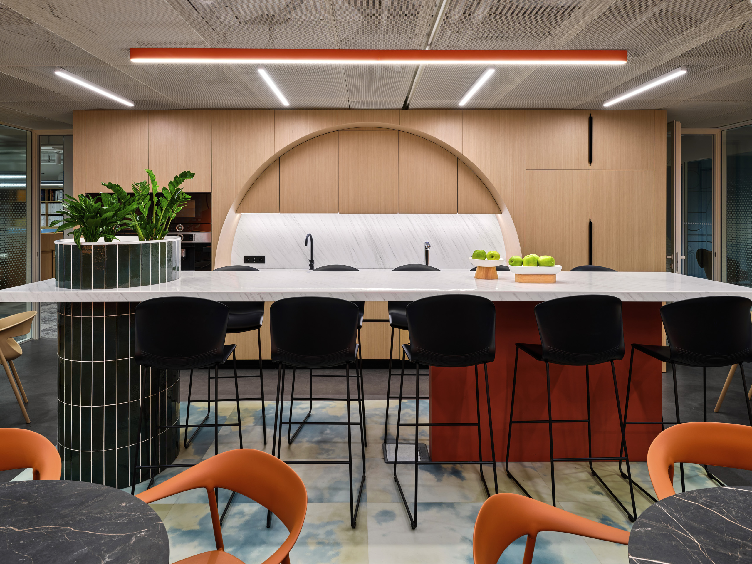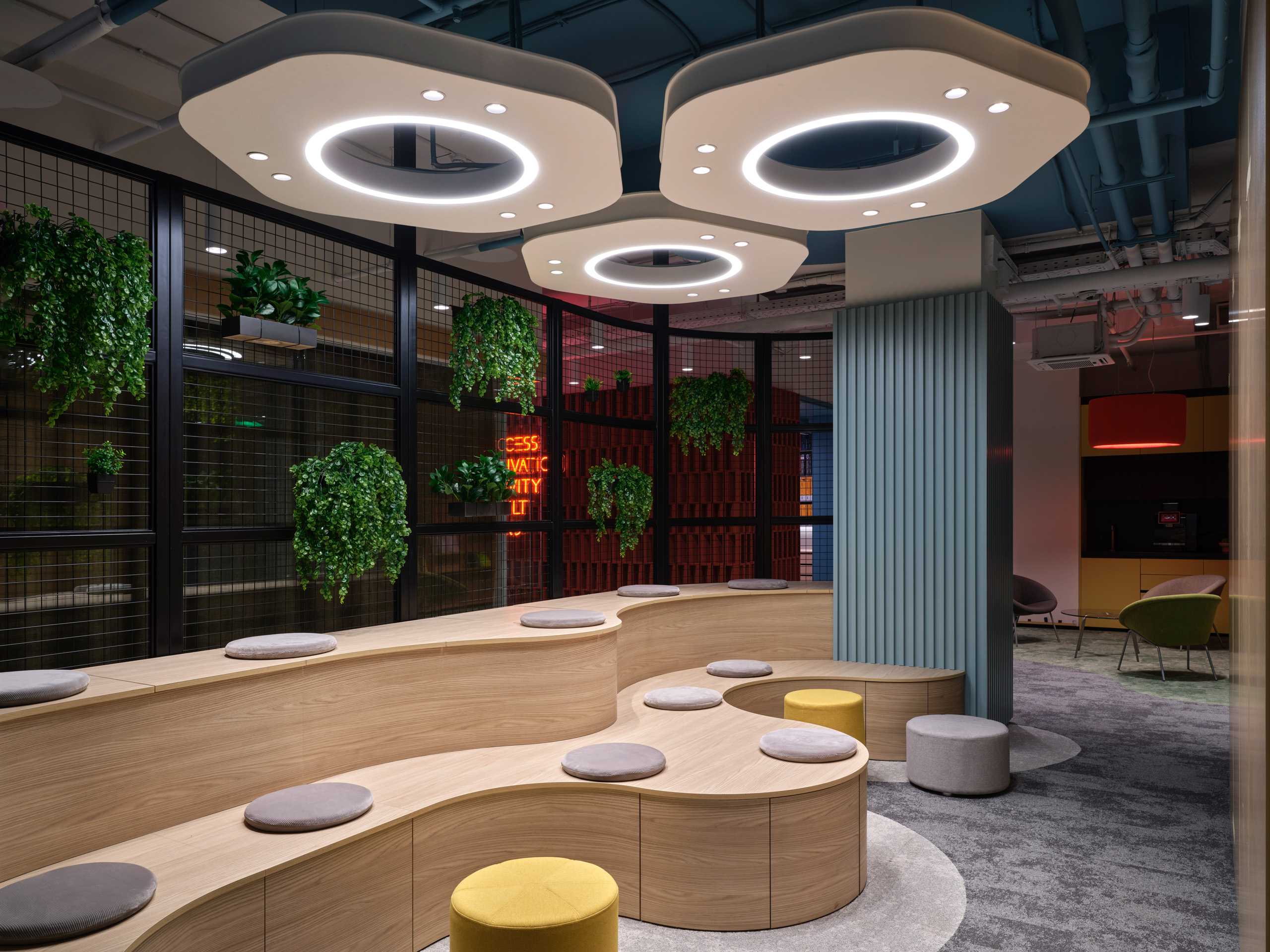 Рабочая зона организована вокруг стационарных рабочих мест бренда Orgspace и кабинок для индивидуальной работы с высоким уровнем акустического комфорта. Световые линейные конструкции и яркие акцентные кресла создают рабочее визуально динамичное пространство.