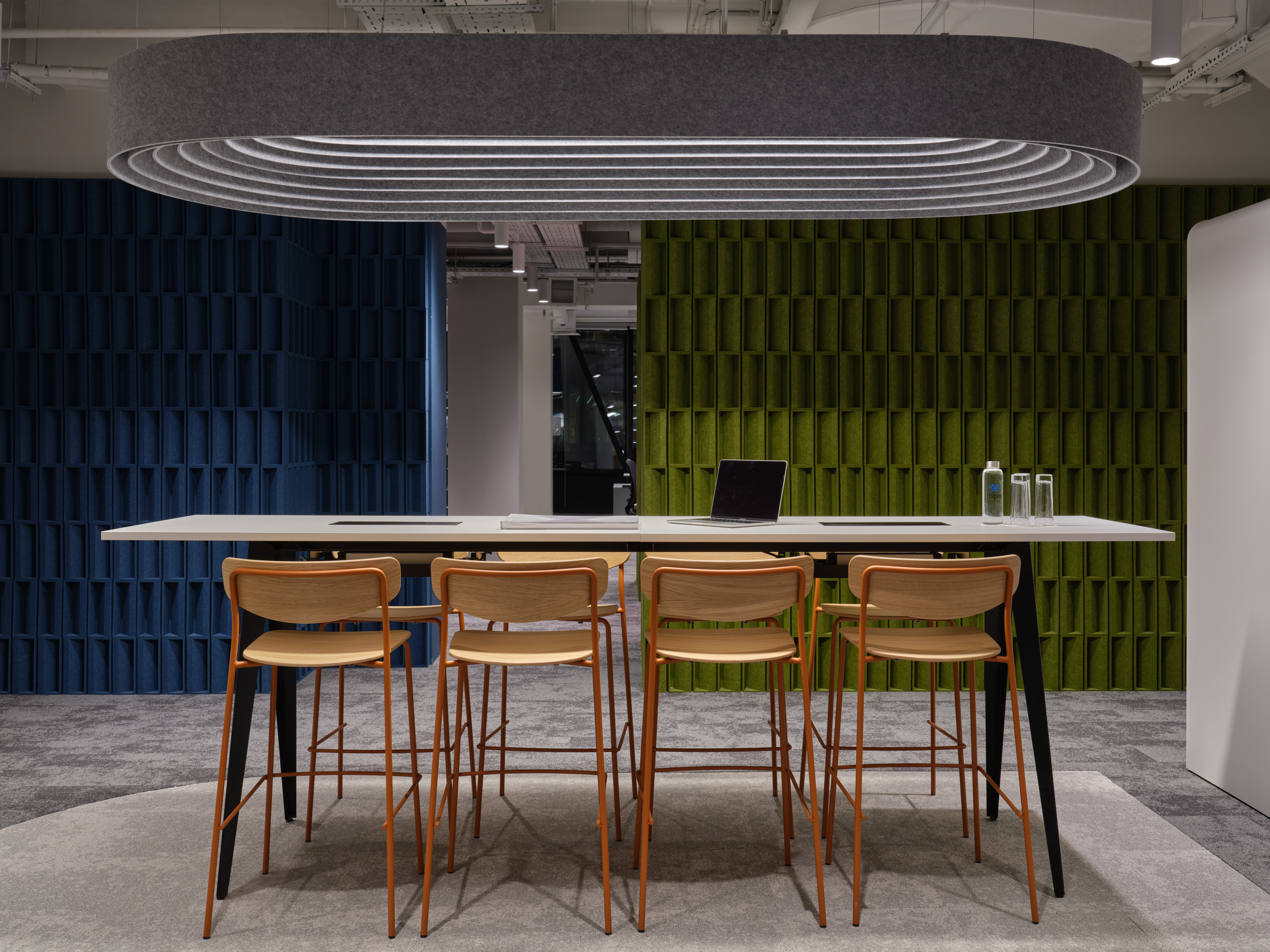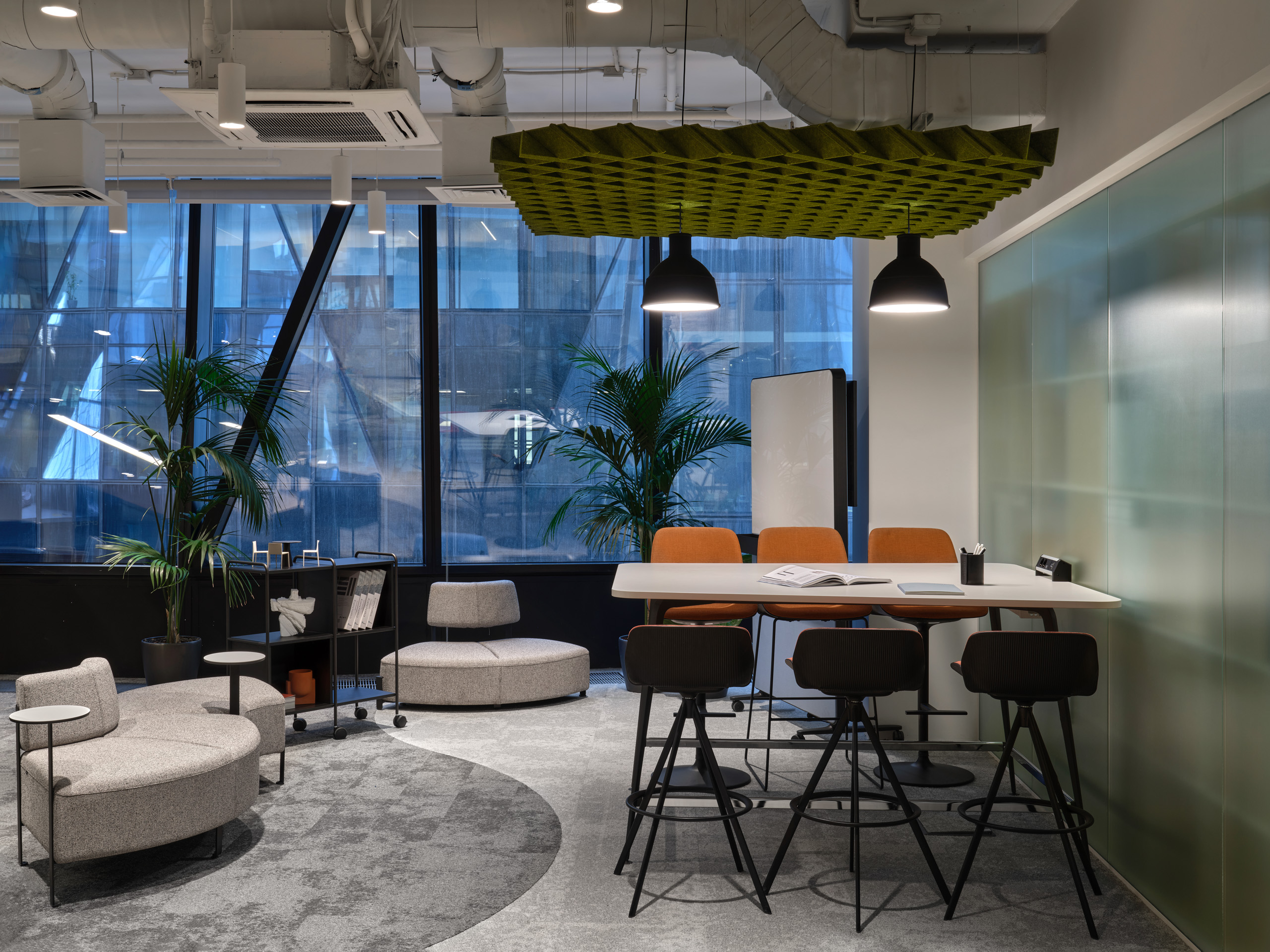 Для индивидуальной концентрации предусмотрены акустически изолированные кабинки с мягким светом и спокойной палитрой. В одной из рабочих зон размещен высокий стол с монитором для кросс-функциональной работы — пространство, где удобно проводить брейнштормы и презентовать идеи.