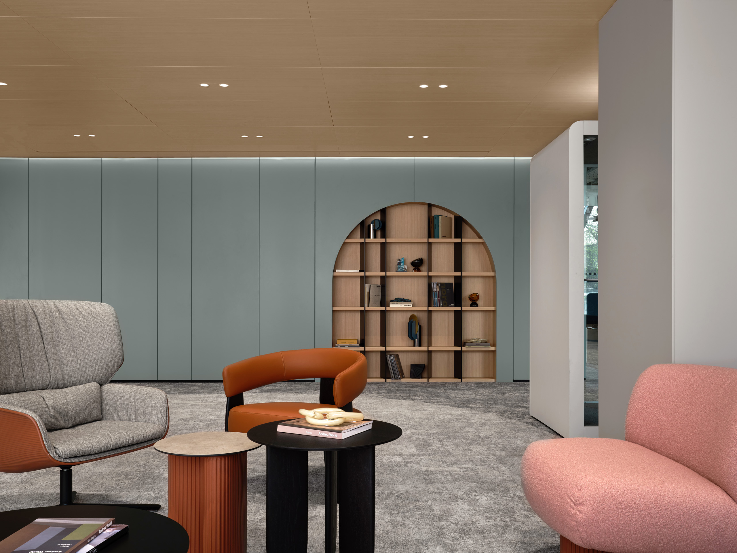 Первое впечатление формируется с ресепшн-зоны — светлого пространства с выразительной отделкой потолка из дерева, встроенными акцентными светильниками разного диаметра и комфортной бизнес-гостиной. Панорамное остекление и кофе-пойнт вдоль окна приглашают к неформальному общению, работе и переговорам.
