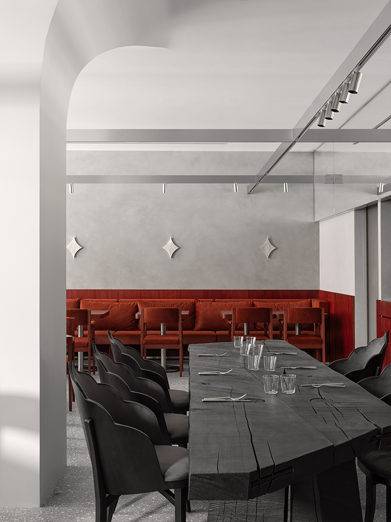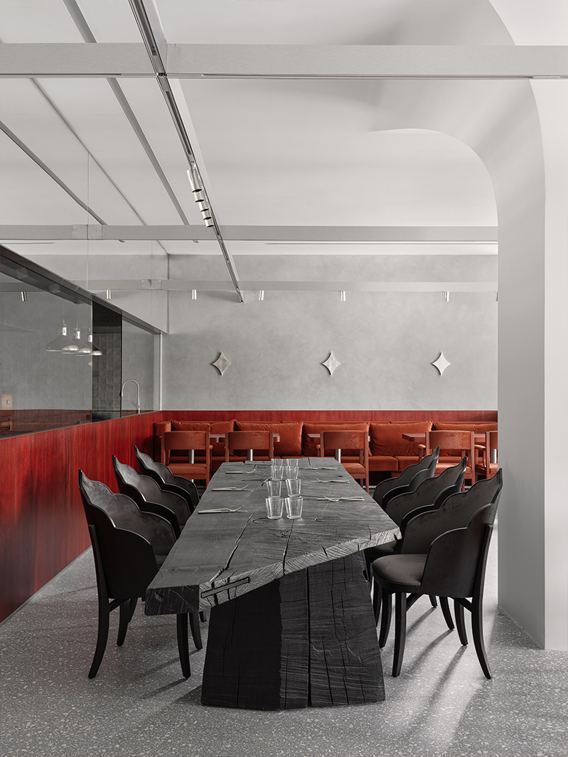 Второй зал решен более интимно: приглушенный свет, изогнутые линии и преобладание дерева формируют атмосферу, отсылающую к образу терема. Центральный элемент — общая столовая группа из черного дерева, выполненная при участии художника, специализирующегося на крупных формах.