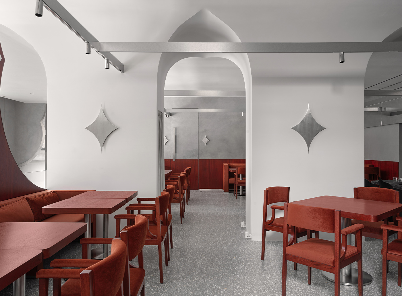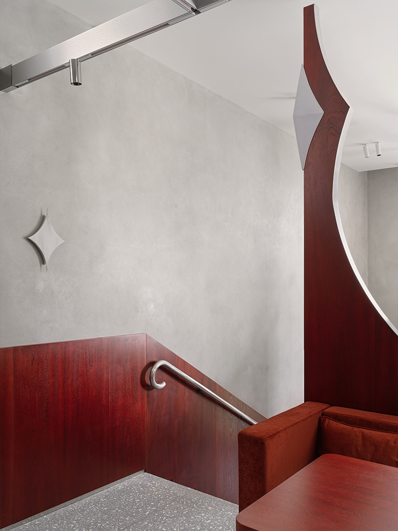 Пересекающиеся отраженные арки формируют в точках соприкосновения четырехконечные звезды — графический символ, знакомый по иллюстрациям к русским сказкам. Возникает ощущение пространства между зеркальными формами, а сама конструкция создает эффект круглого окна со второго уровня и делит интерьер на две функциональные зоны с разным характером.