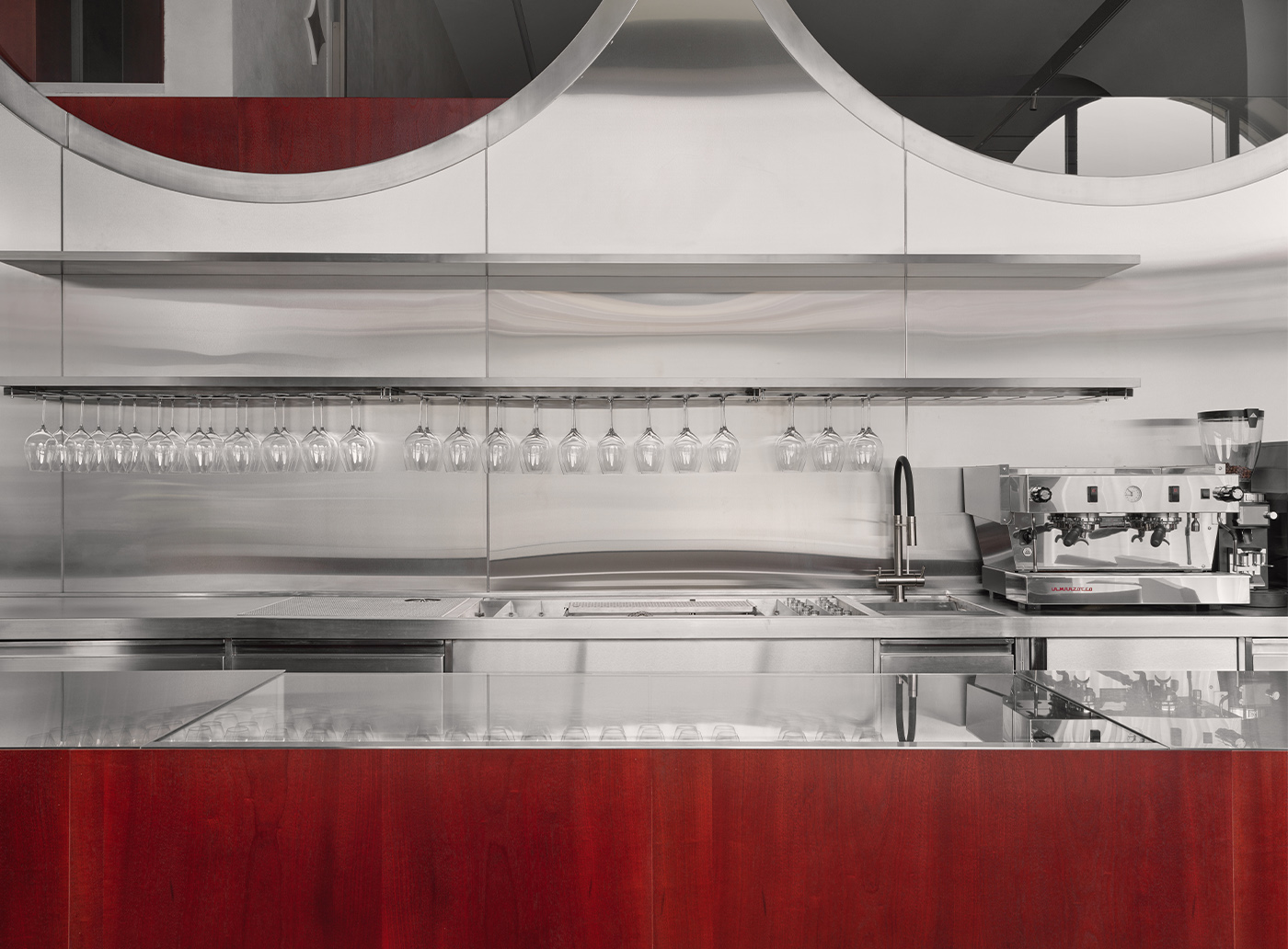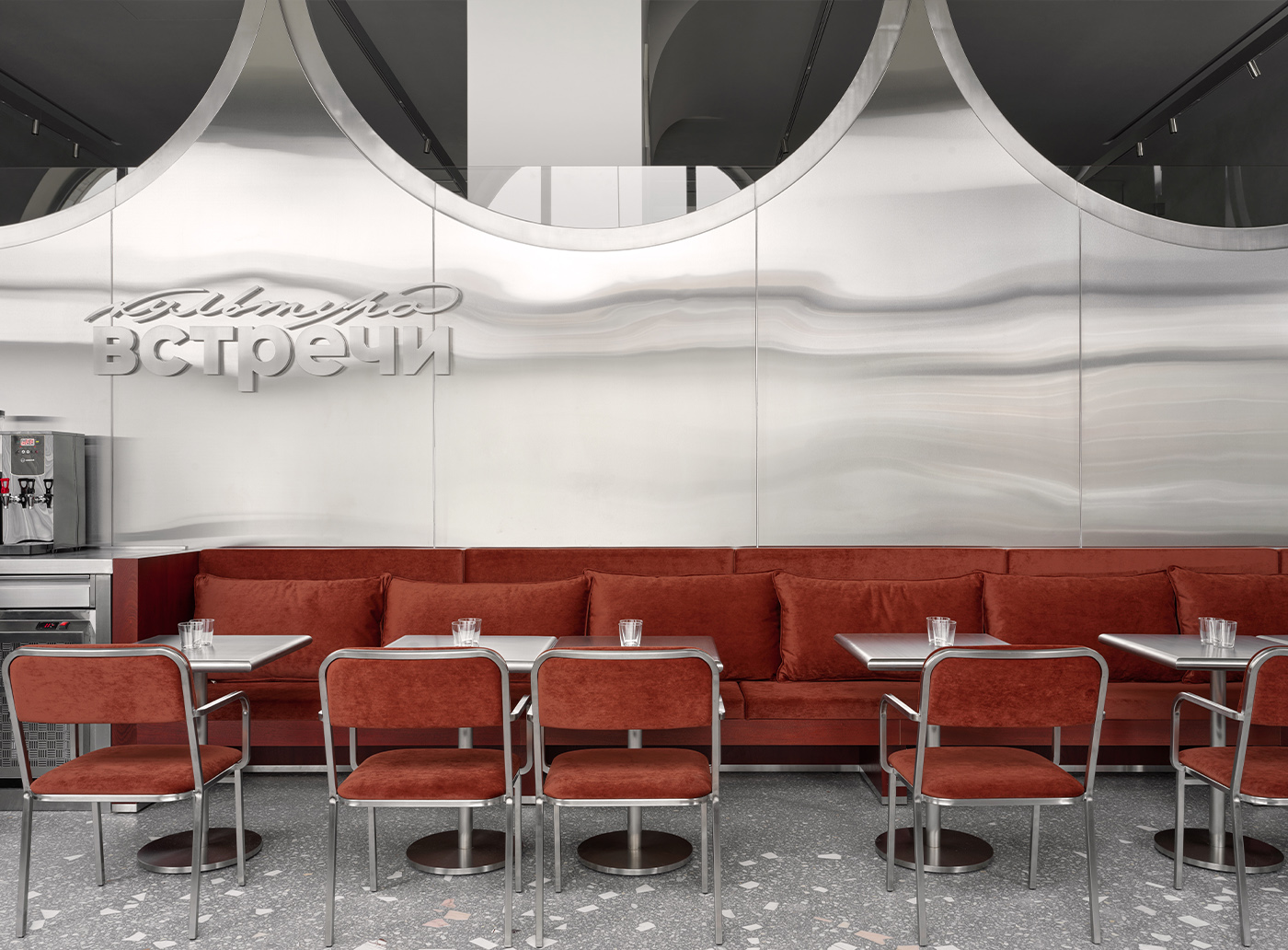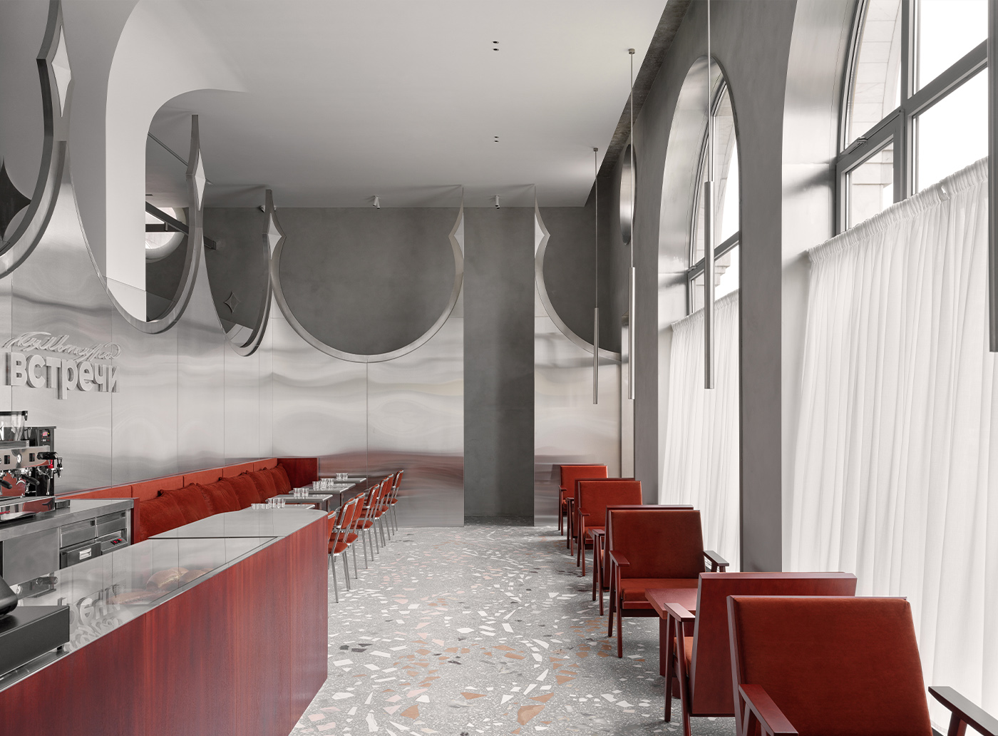Первый зал — открытый и светлый, — организован вокруг арочных окон. Днем он воспринимается как технологичное пространство с активной игрой отражений в металле, вечером — как более камерная среда. Здесь размещена динамичная барная зона.