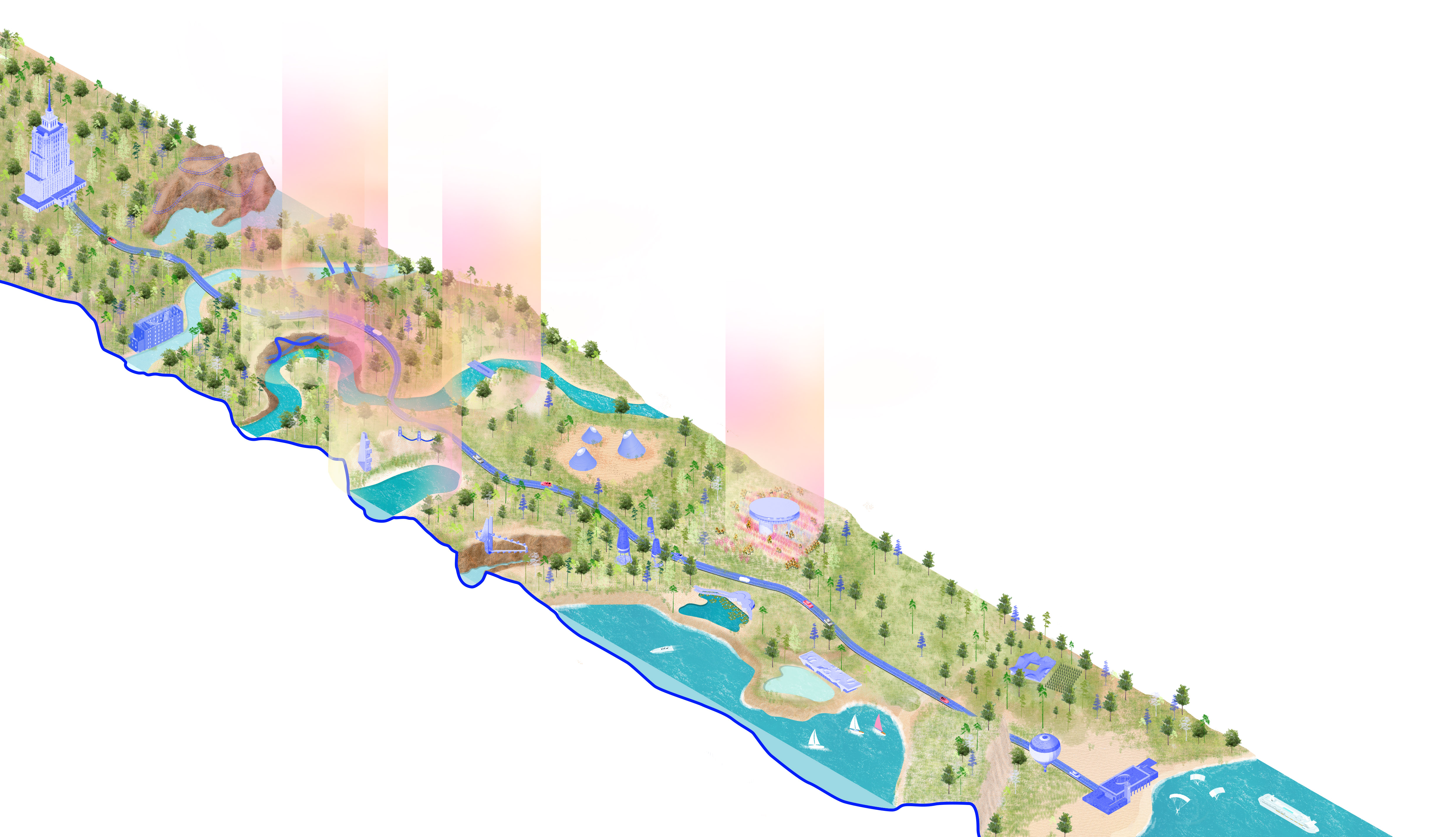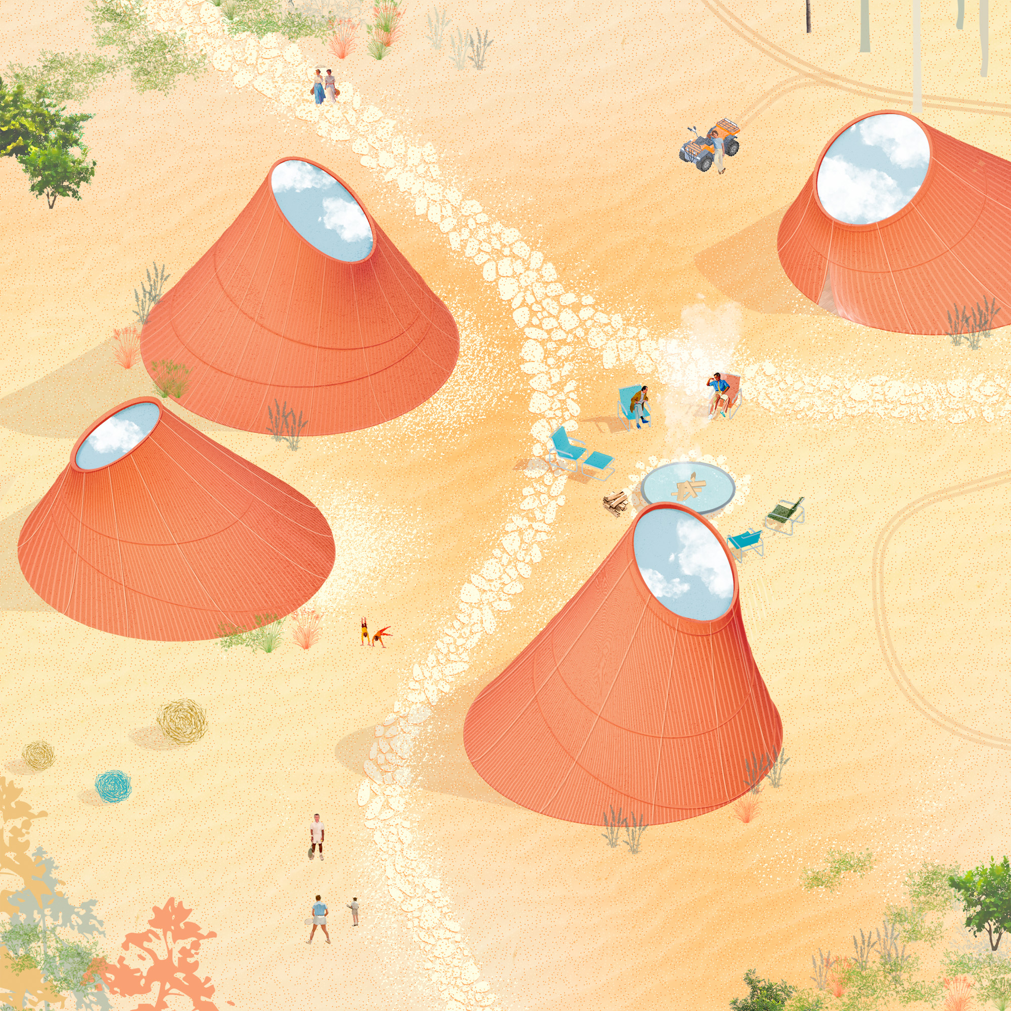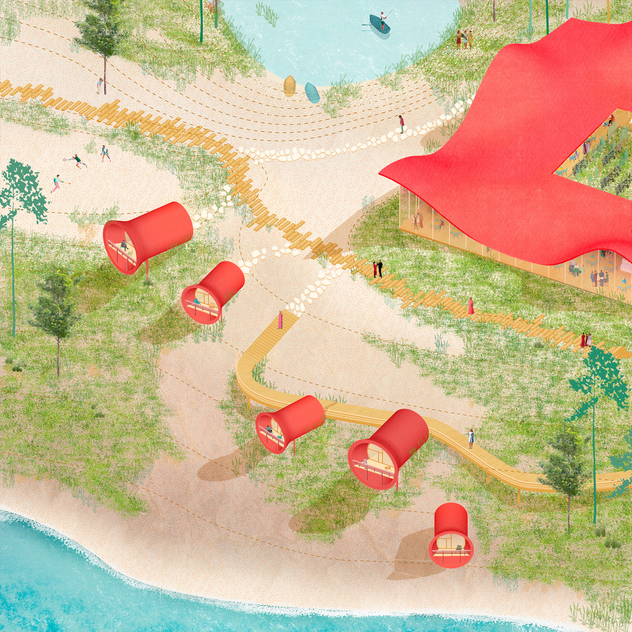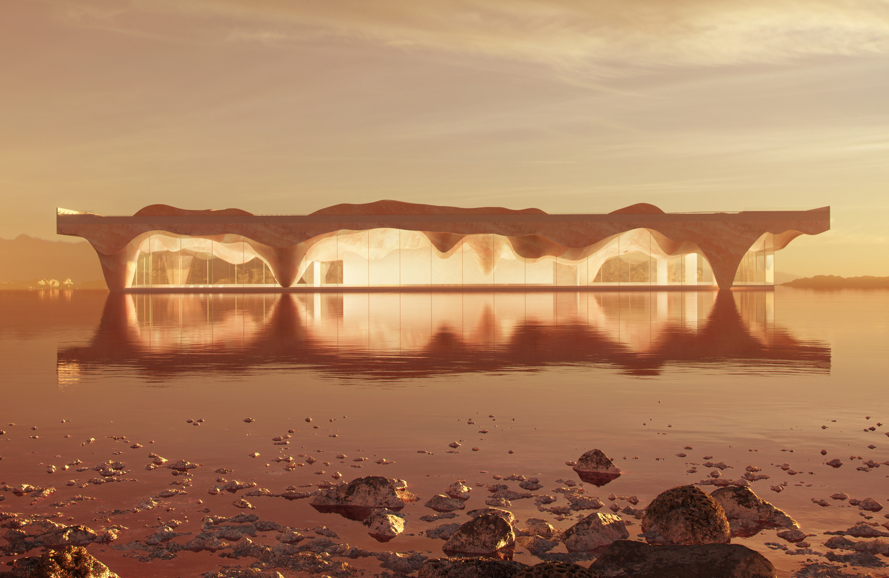 Спроектировали также и смотровые площадки, подобные тем, что есть в Норвегии, где туристы могут наслаждаться красивыми пейзажами с разных высот. В зоне пустыни мы предусмотрели глэмпинг с прозрачной крышей, чтобы гости могли наблюдать за звездным небом. Предложили и ресторан у живописного озера с лилиями, где можно остановиться для обеда и отдыха, спа-комплекс на соленом озере, в котором можно провести несколько часов.
