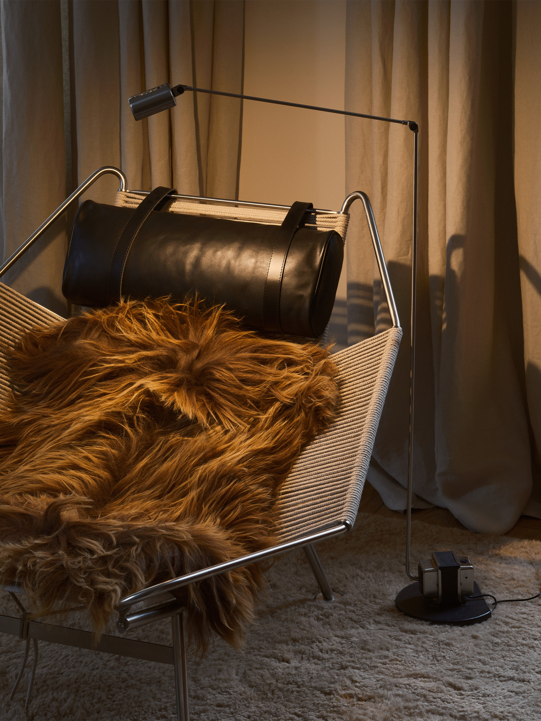 PP 225, известное как Flag Halyard Chair, — это икона современного дизайна, созданная датчанином Хансом Вегнером в 1950 году. Кресло-шезлонг является воплощением творческой свободы и мастерства, смешивая строгую утилитарность и непривычную для Скандинавии роскошь. Конструкция выполнена из нержавеющей стали, оплетена 240 метрами каната и дополнена мягким мехом.