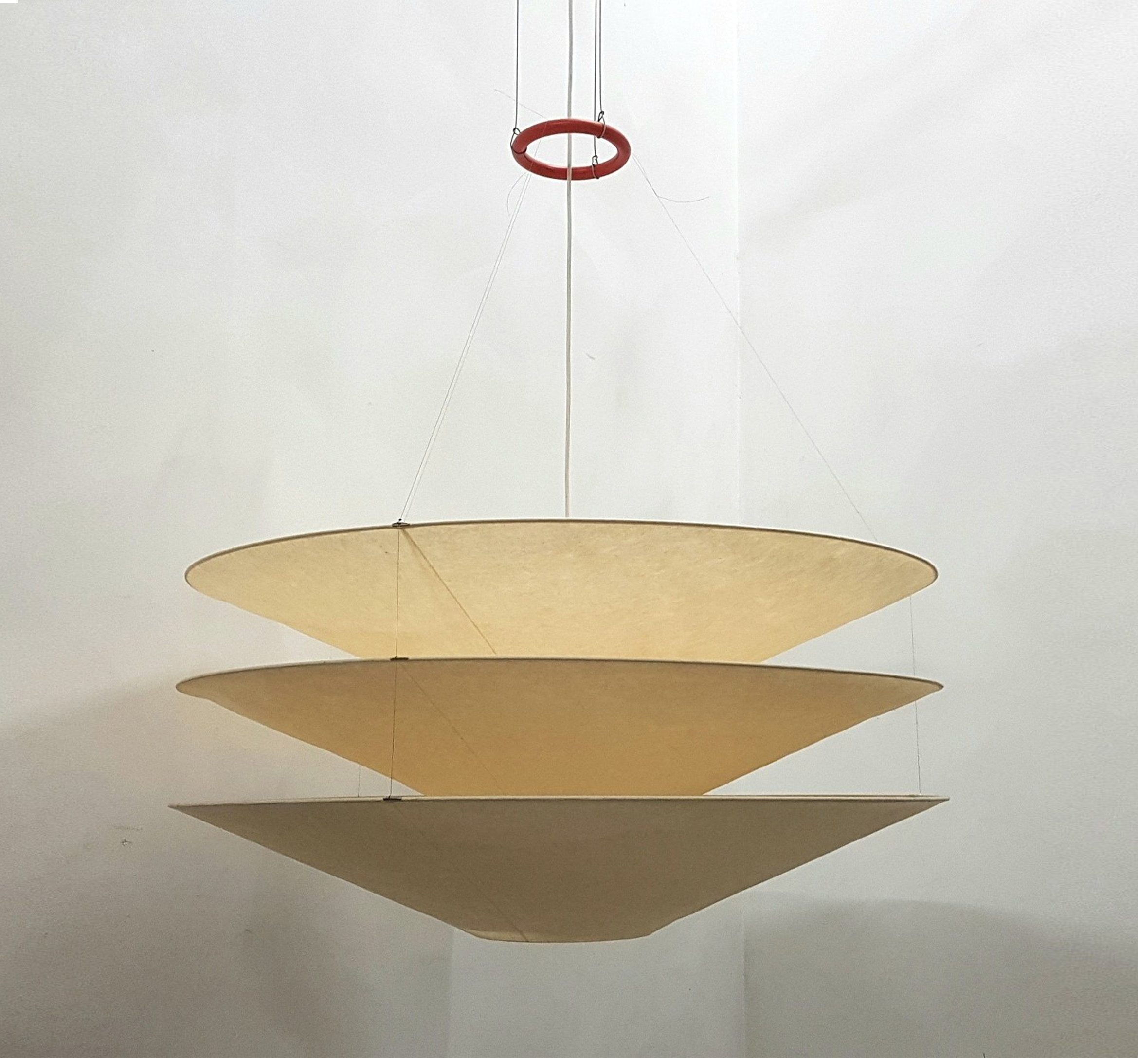 Люстра Floatation, разработанная немецким дизайнером Инго Маурером в 1980 году, сочетает японскую бумагу и металлическую основу в уникальной композиции. Этот светильник словно парит в пространстве благодаря легкости своих материалов. Три абажура из бумаги васи создают мягкий и рассеянный свет, который идеально подходит для любого пространства.