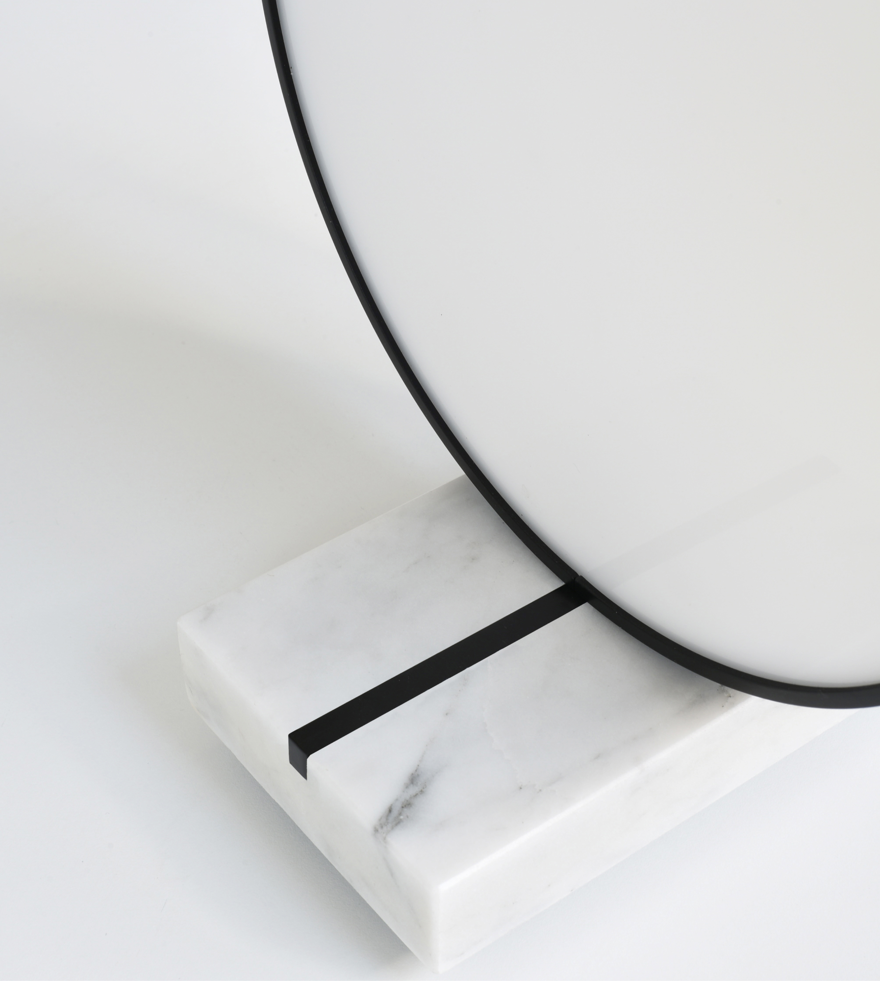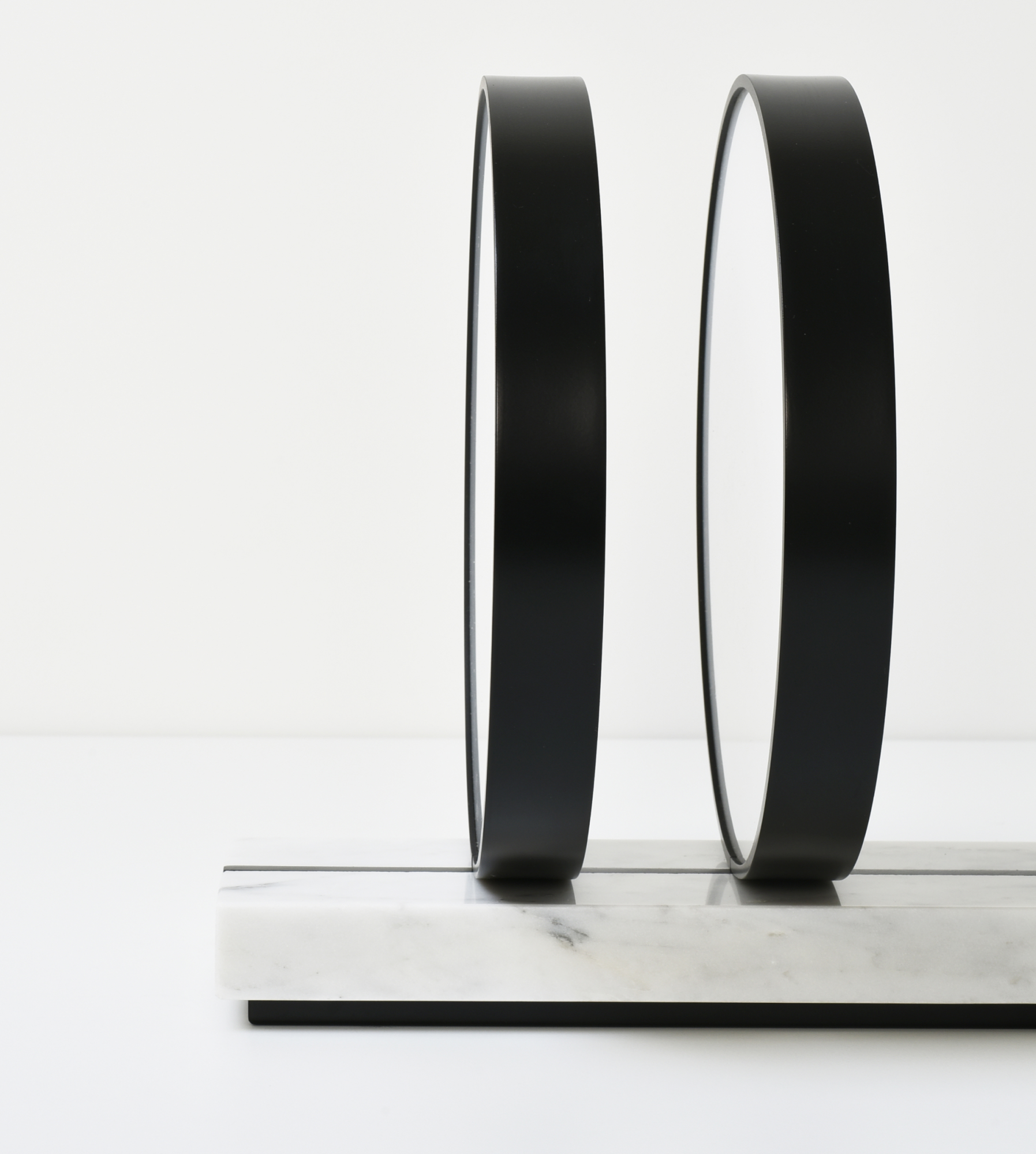 Третий объект, светильник O2, — одна из первых разработок Артема Бабаянца в предметном дизайне. Предмет создан в 2019 году и состоит из мраморного основания и двух парящих световых дисков, обрамленных металлом. Сложная форма и конструкция светильника показывает возможности развития устойчивых технологий, а его геометрия отсылает к двум первоэлементам.