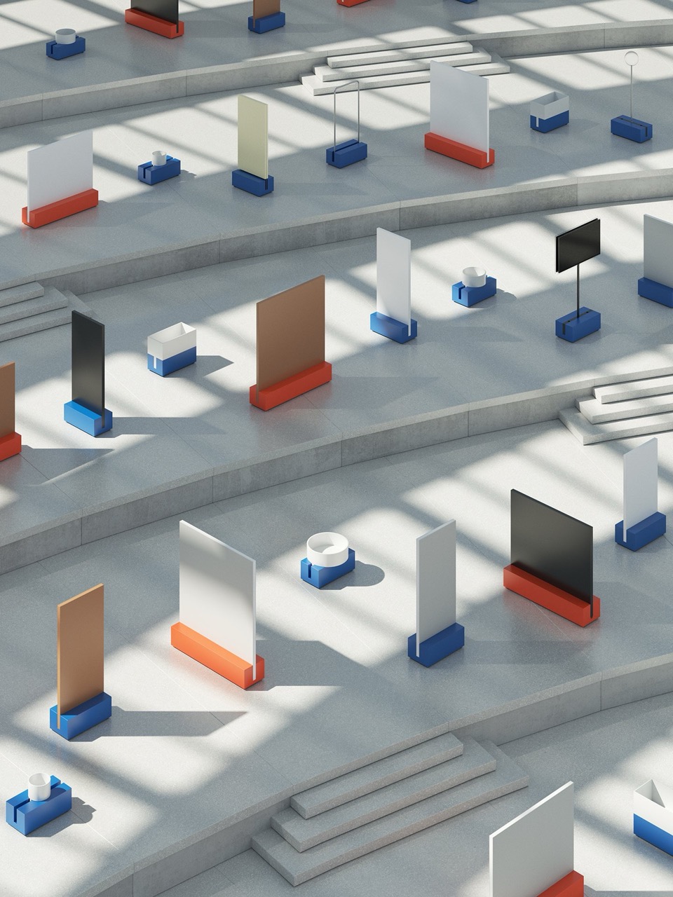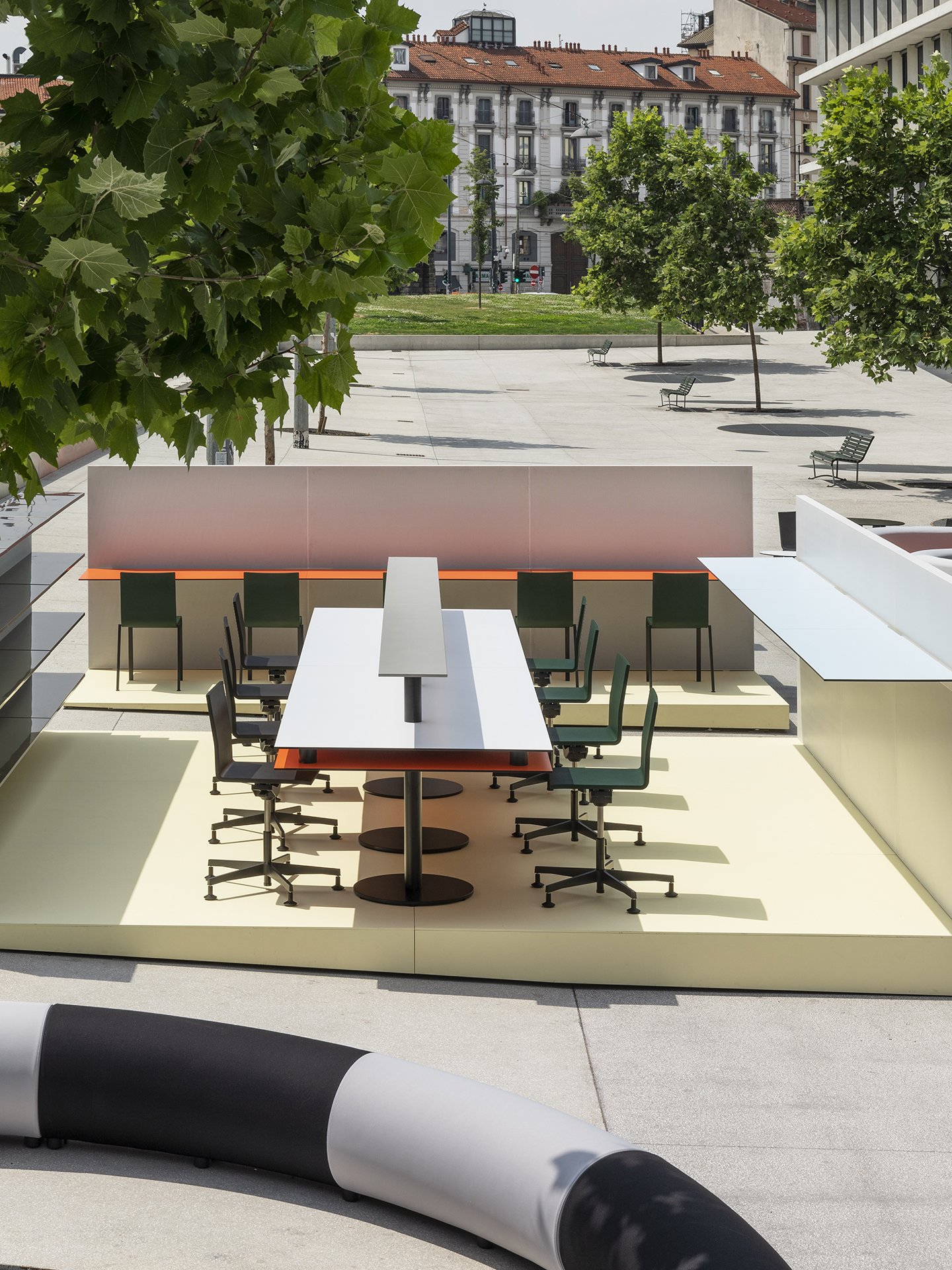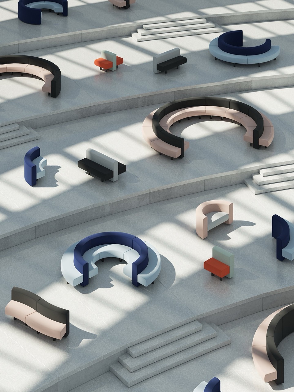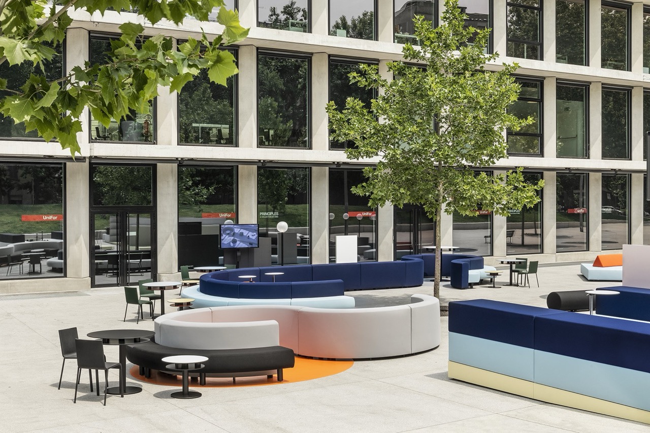 Коллекция включает более ста элементов размеров S, M, L и XL, сгруппированных по семействам и позволяющих создавать множество конфигураций. Линейные и округлые перегородки формируют уединенные зоны и полуприватные пространства для встреч, а круглые диваны и мягкие острова стимулируют неформальное взаимодействие.