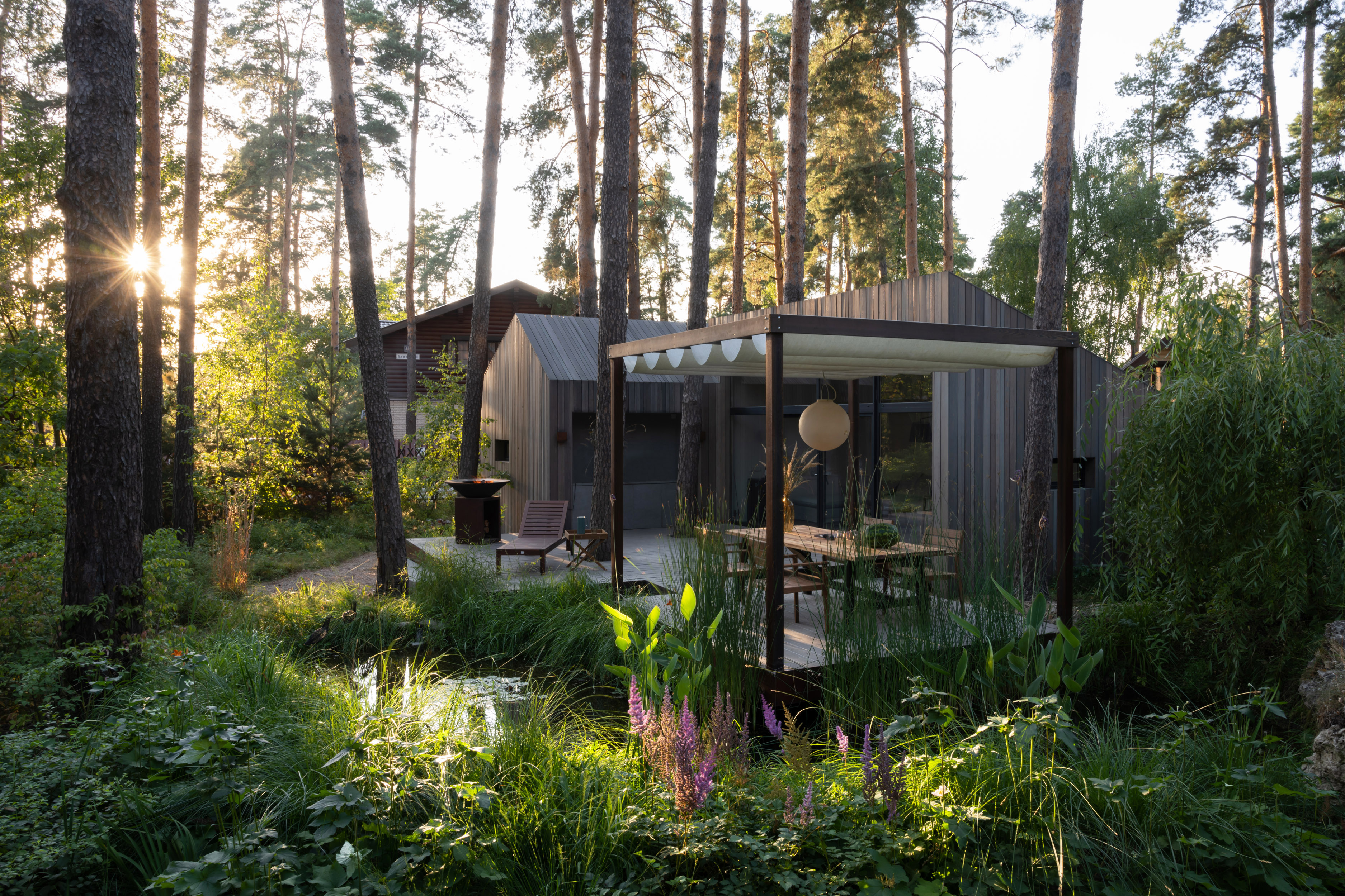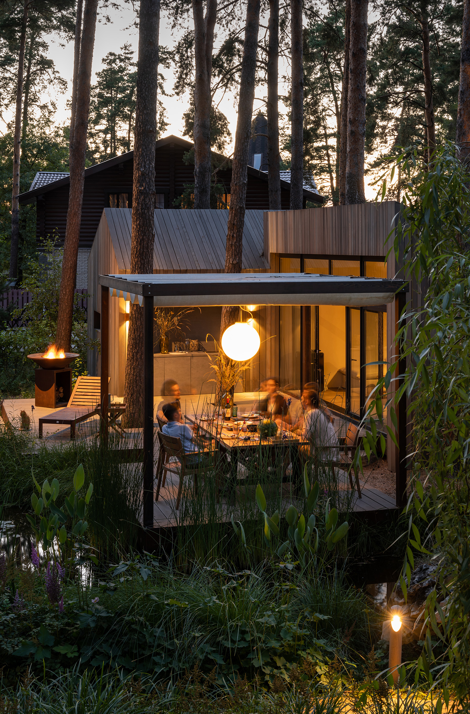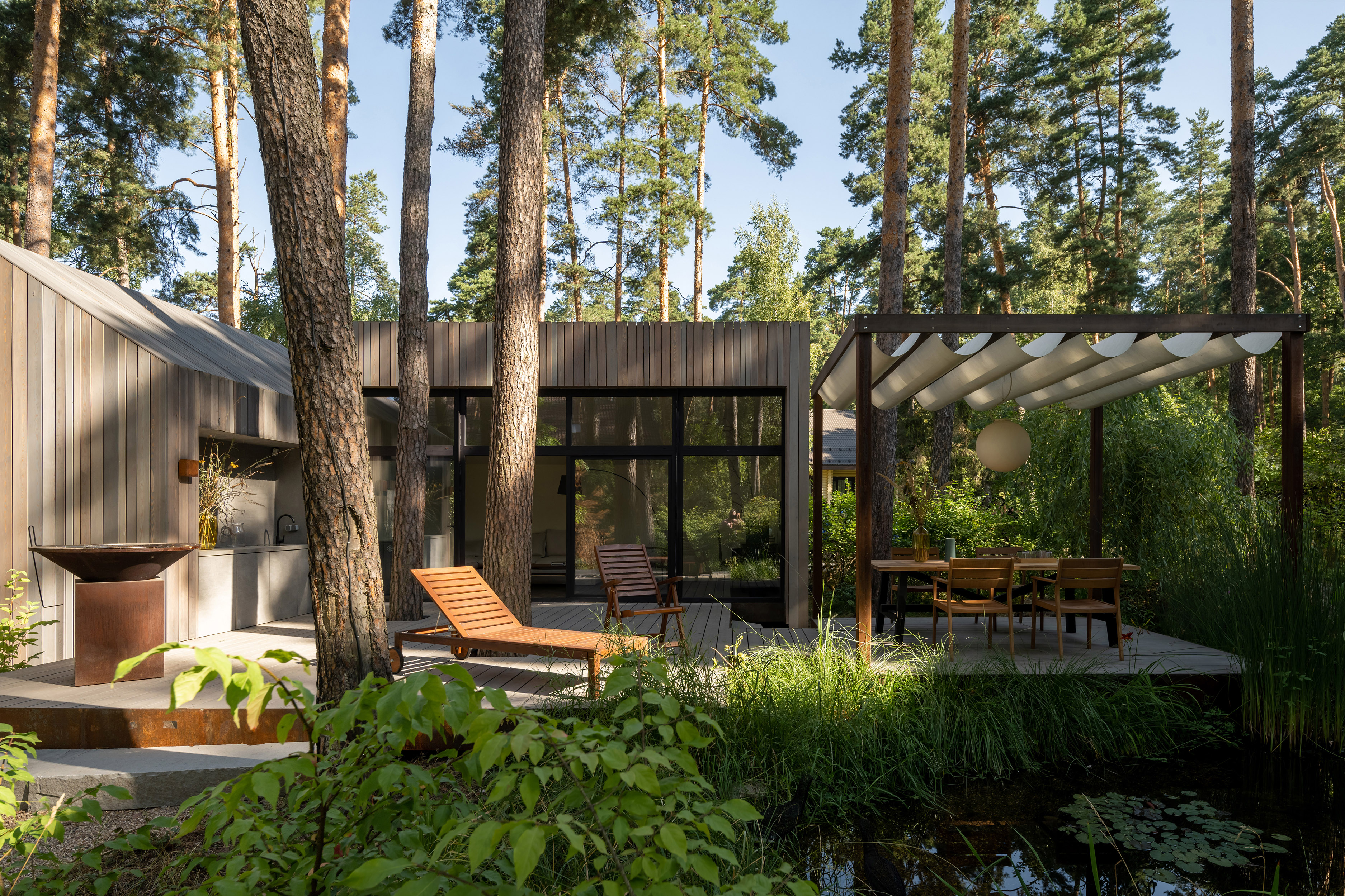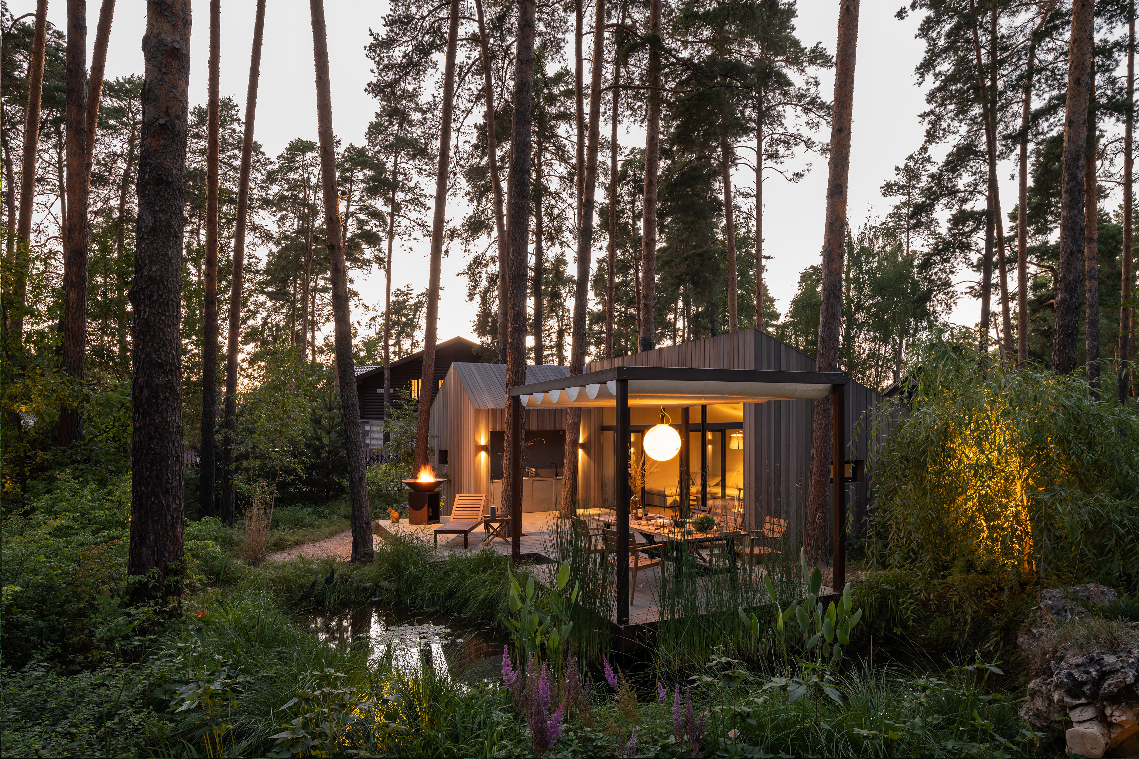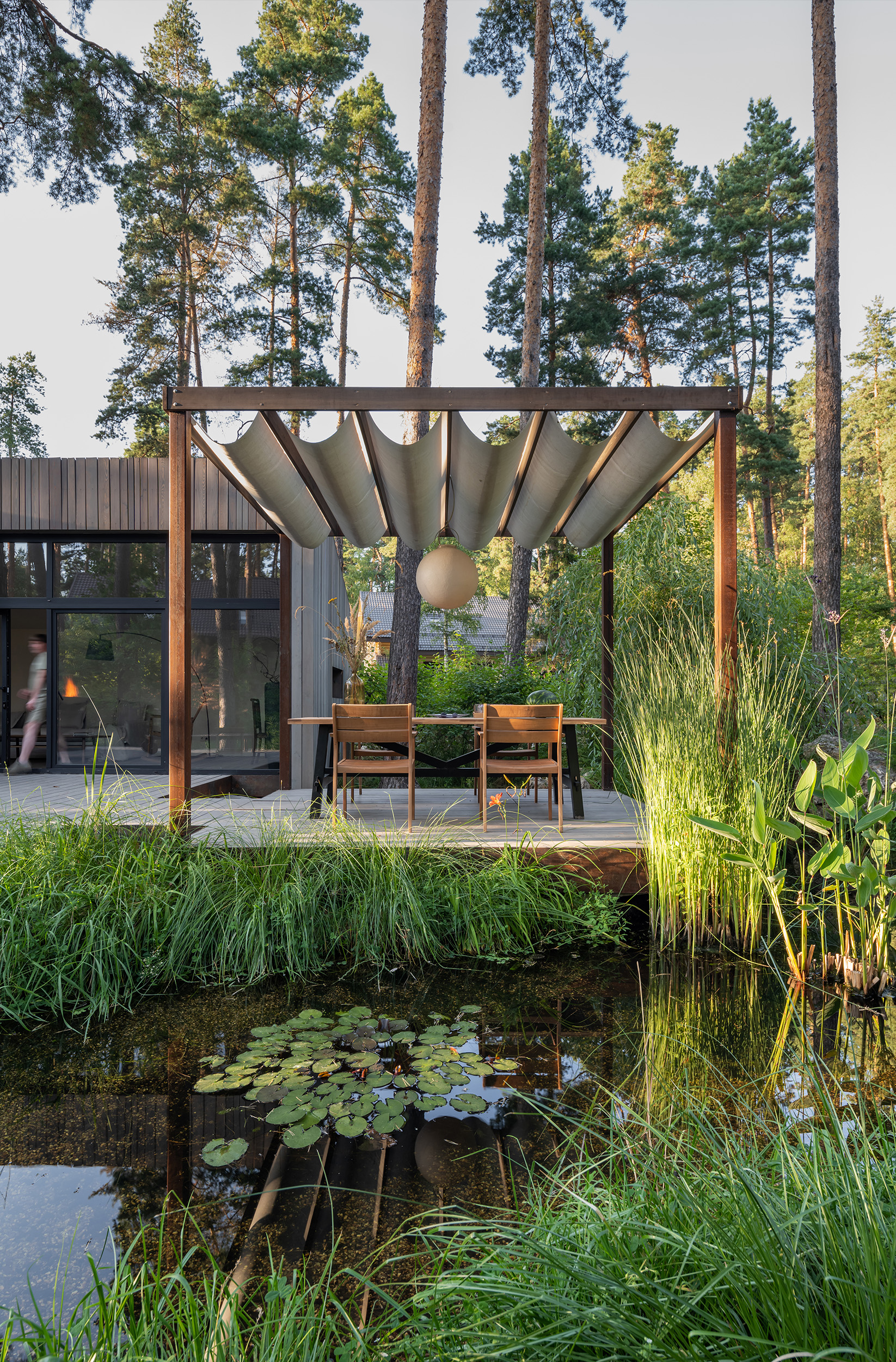 Летнее патио — проект про личные переживания, про воспоминания детства, когда возможно разглядеть море в пруду. Патио включает в себя открытую веранду, спальню-гостиную, навес с прудом и кладовую. Основной объем строений разделен для сохранения камерности места. В отделке применены планкен из лиственницы, покрытой маслом, металл, широкоформатный керамогранит для встроенной кухни и натуральный камень для ступеней, а главным акцентом в освещении стал светильник «Луна» итальянской фабрики In-es.artdesign романтично отражающийся в воде среди кувшинок.