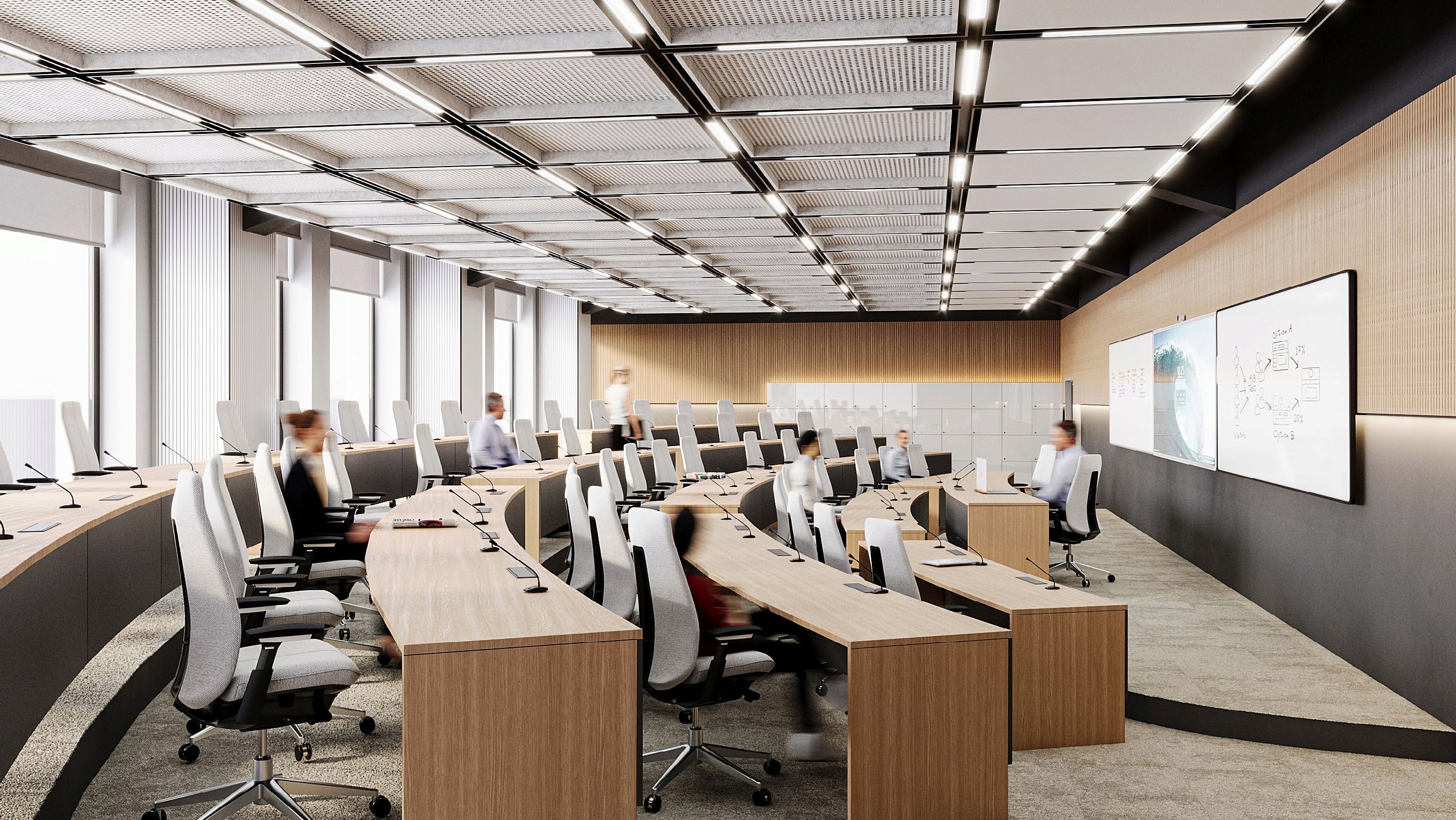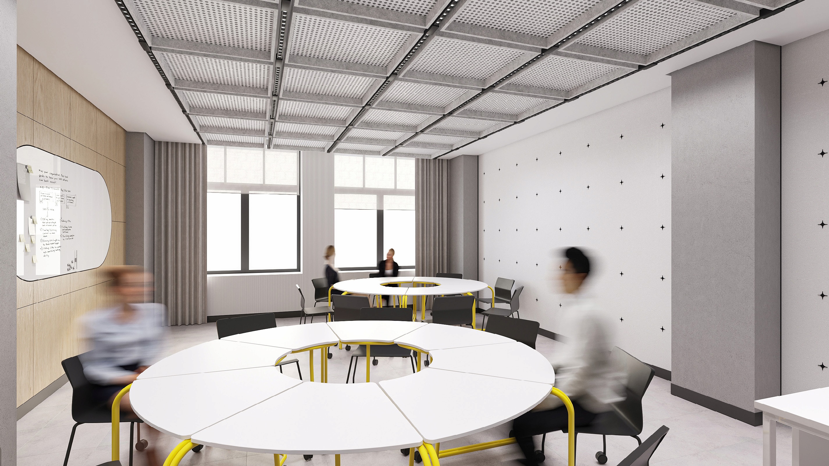 Как отмечает Мария Корнеева, практически в каждом помещении учащиеся смогут найти историческое послание. В аудиториях, к примеру, будет использован прием, заимствованный у фасада здания: регулярная сетка, состоящая из прямоугольников, — отсылка к модульности, характерной для визуальных кодов телеграфной системы.