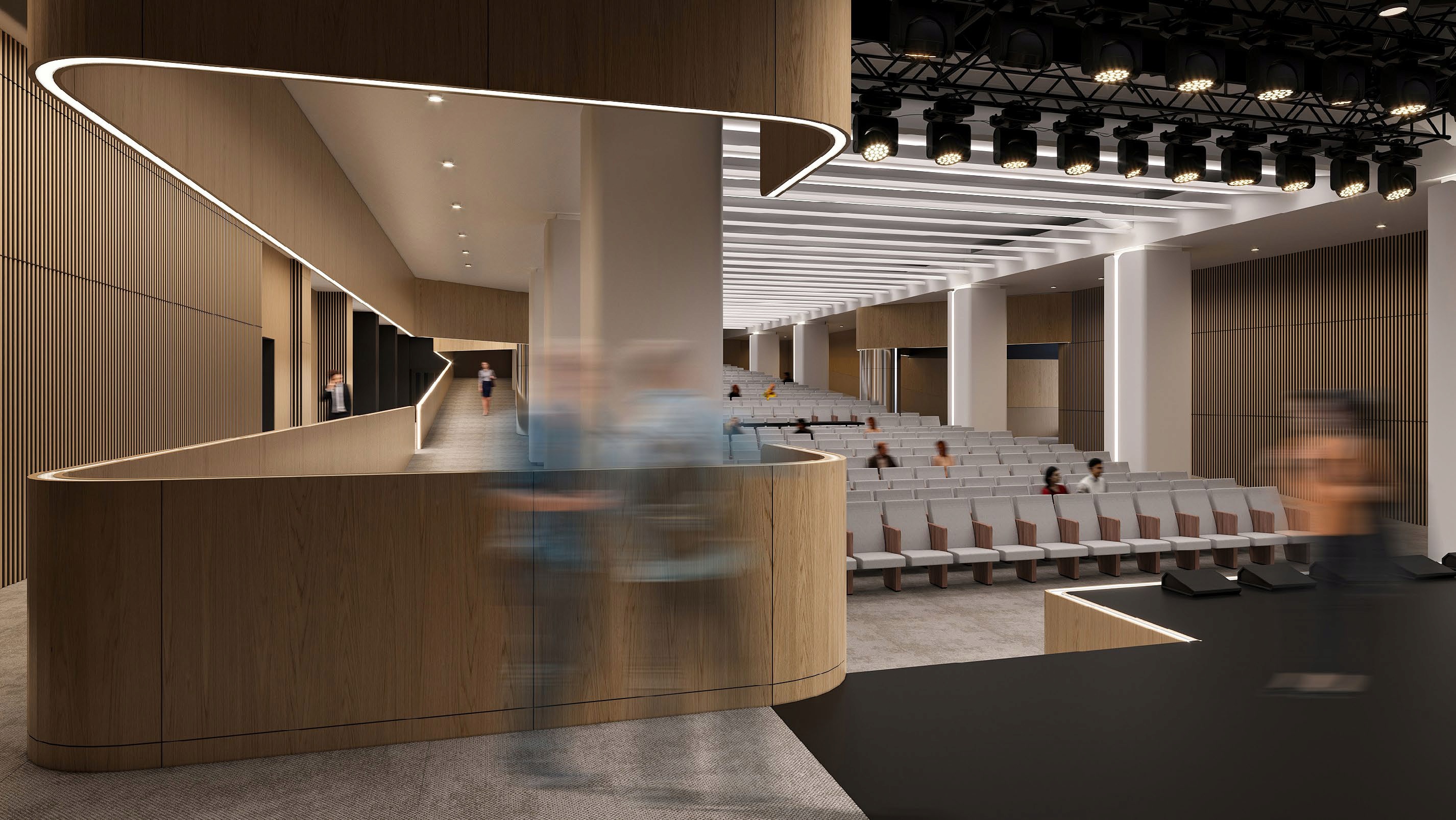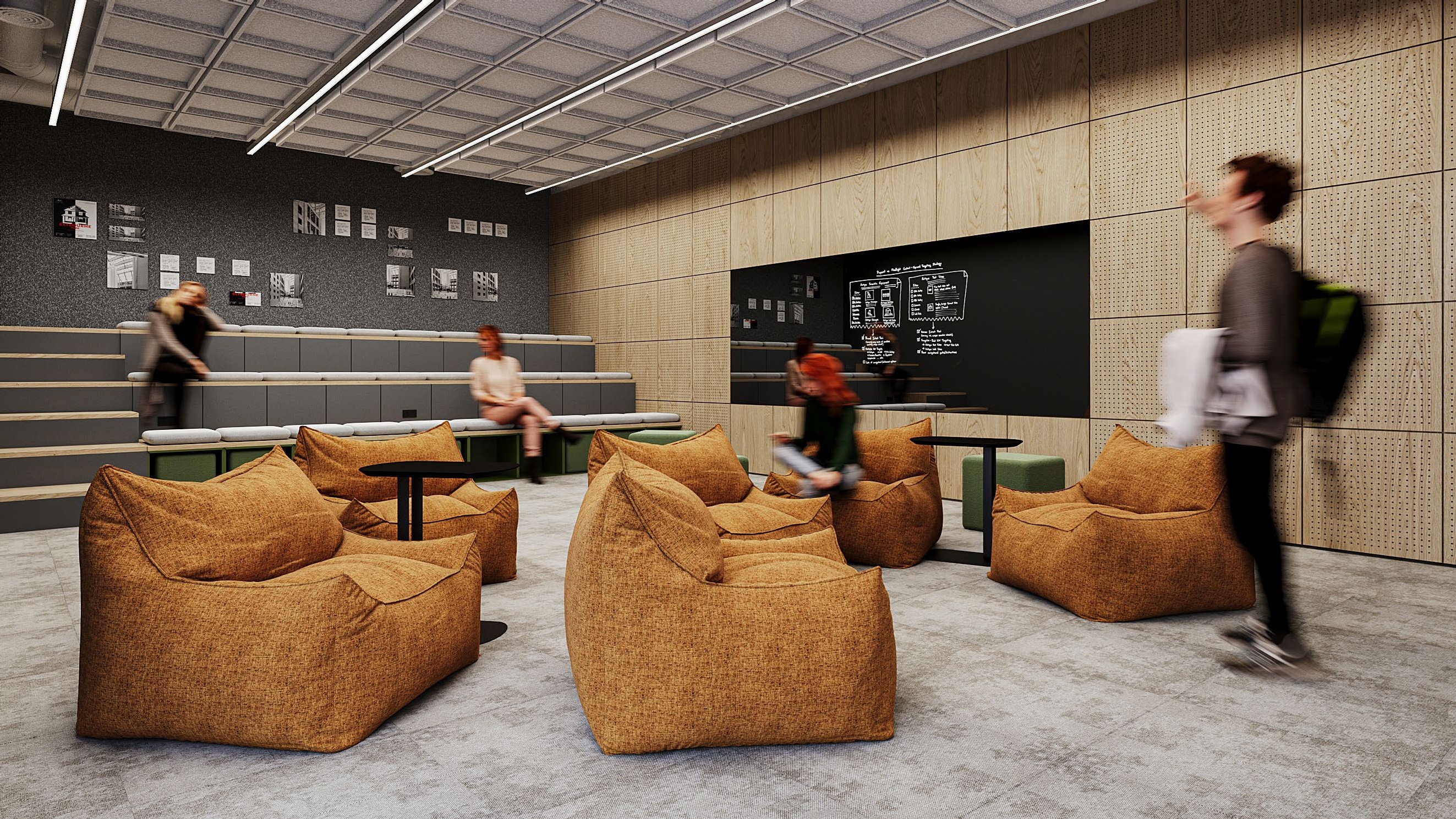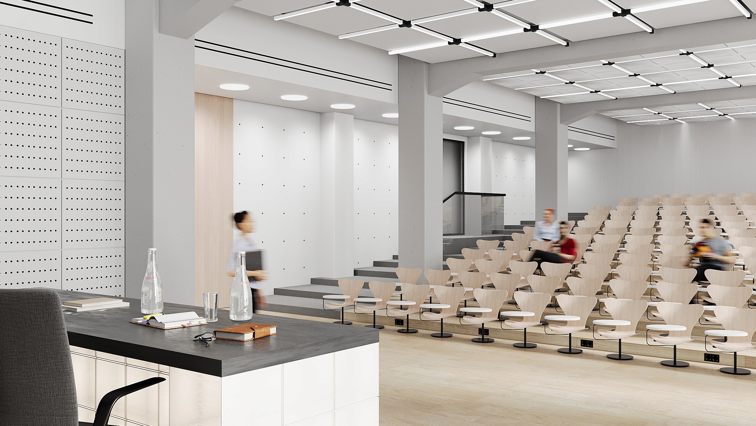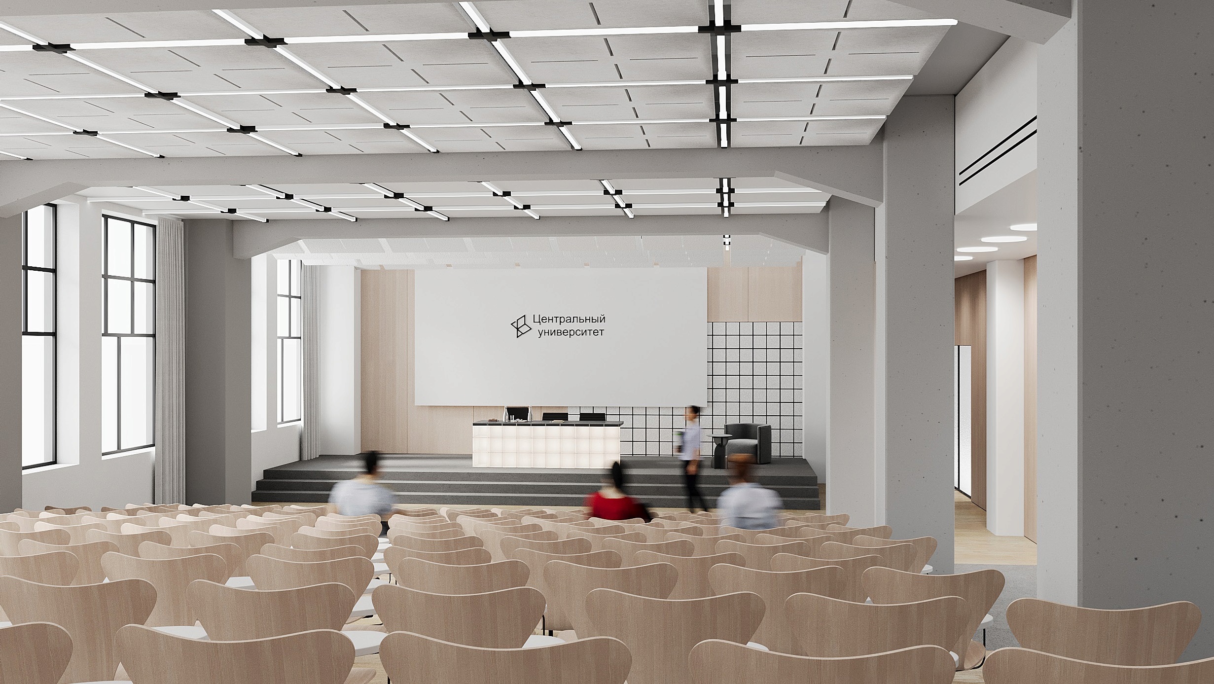 По словам Марии Корнеевой, в работе с интерьером команда активно использовала отсылки к истории здания. Архитекторы стремились к тому, чтобы многое было реконструировано с сохранением оригинальных конструкций и планировок. Особенно тщательно прорабатывалось пространство бывшего операционного зала, который в будущем станет университетской столовой.