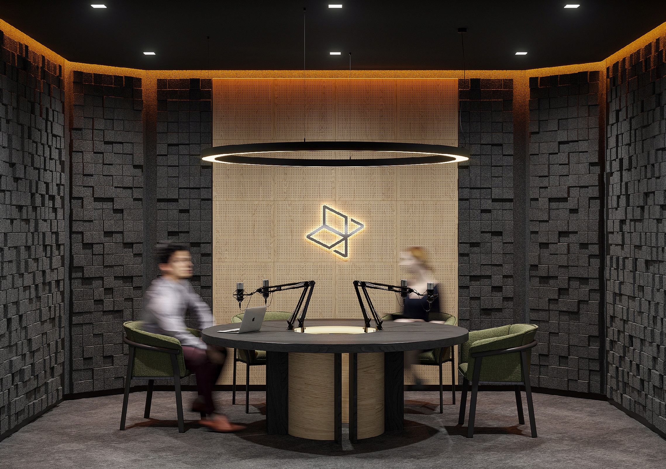 В здании предусмотрено и помещение для записи подкастов — оно разместится в бывшей радиостудии, таким образом продолжая техническое наследие здания в новом, цифровом ключе.