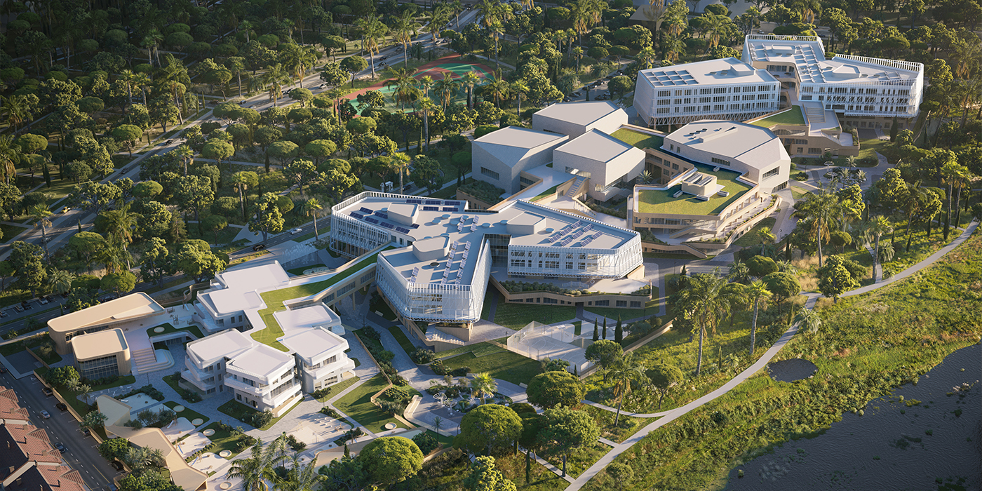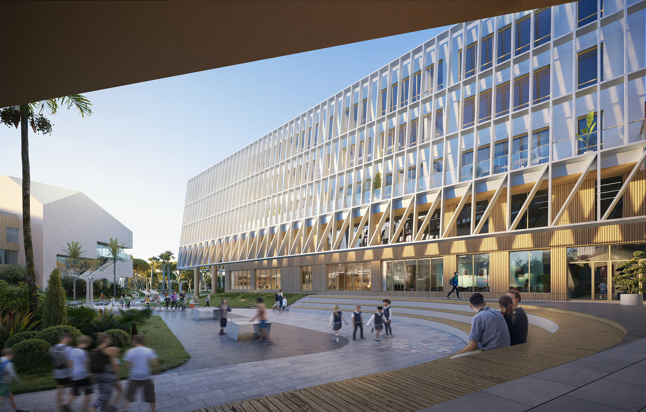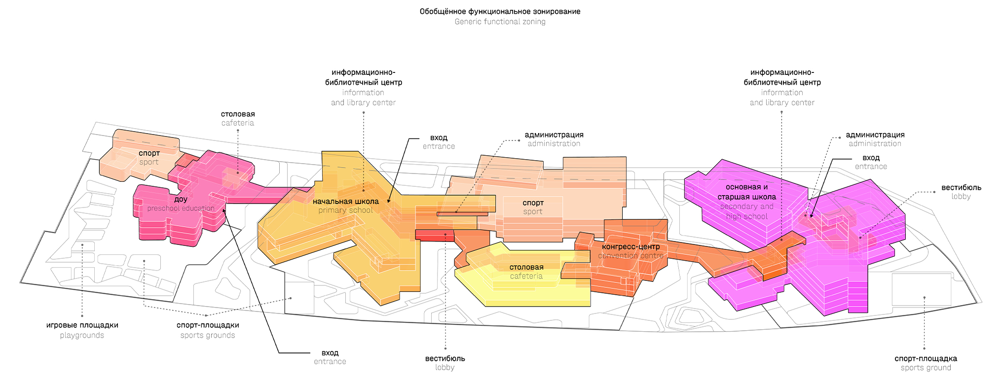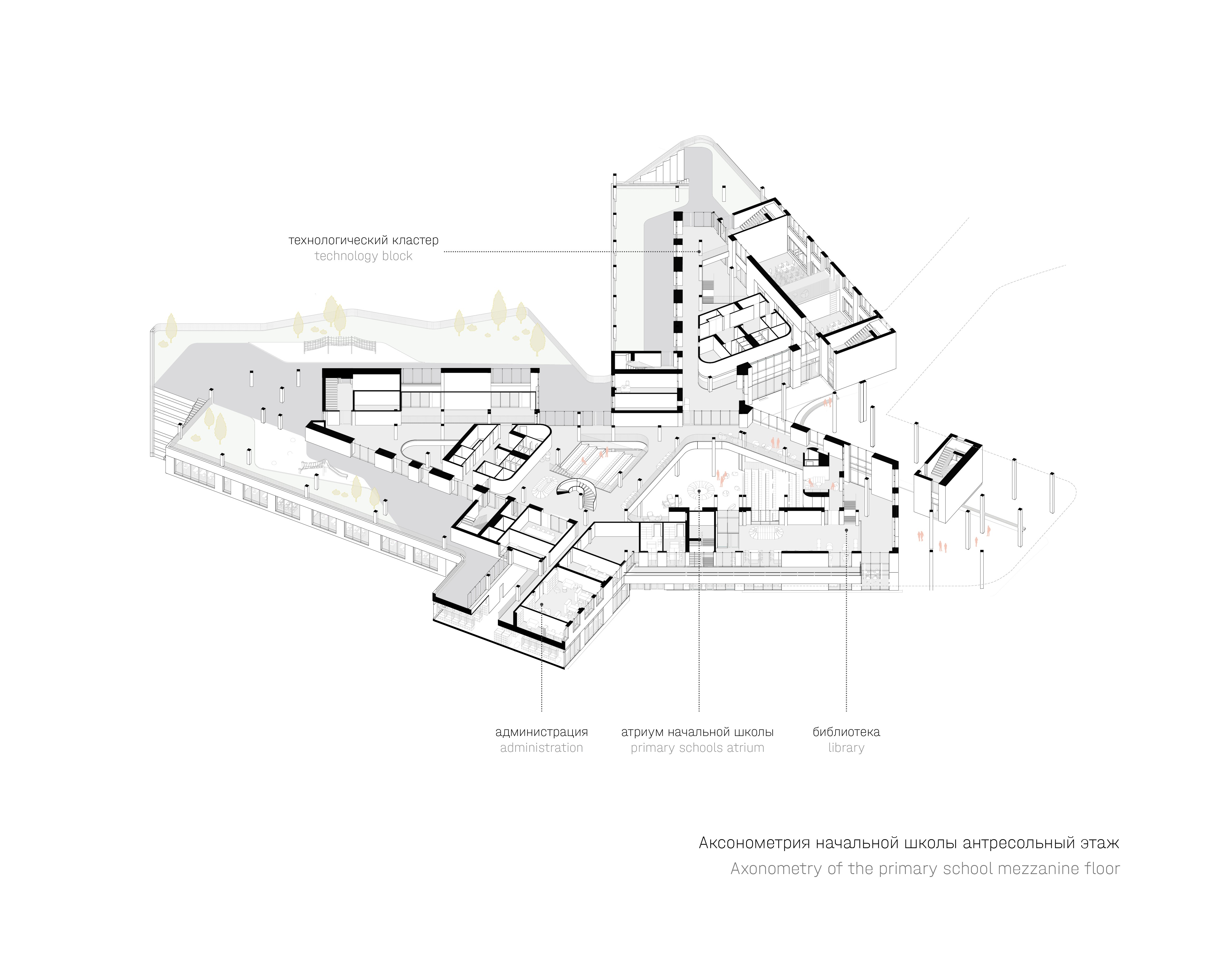 Комплекс площадью 5,8 га, располагающийся на участке довольно вытянутой формы, станет частью формирующегося научно-образовательного кластера и будет включать детский сад, школу, творческие лаборатории и спортивную инфраструктуру. Архитектура задана кластерной структурой: крупный объем разделен на более мелкие функциональные блоки, устроенные в единую систему по принципам пространственной сложности, визуальной открытости и разнообразия типологий.