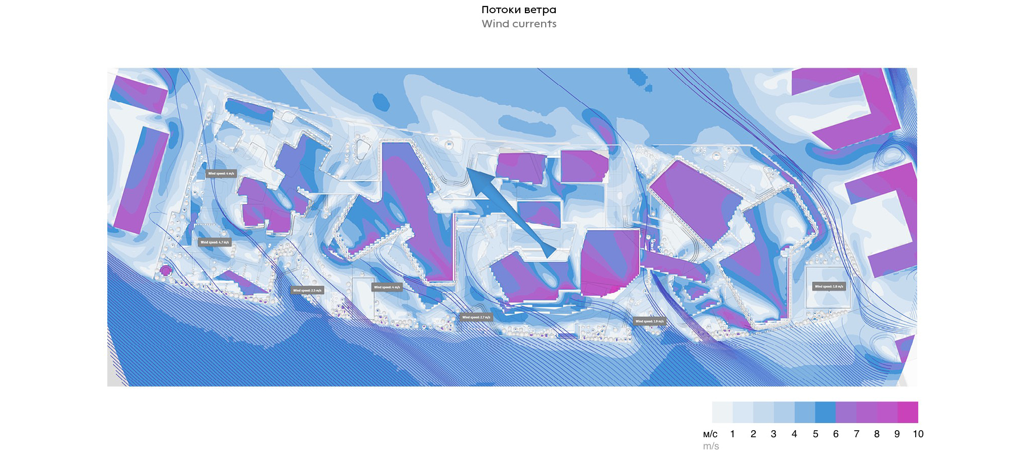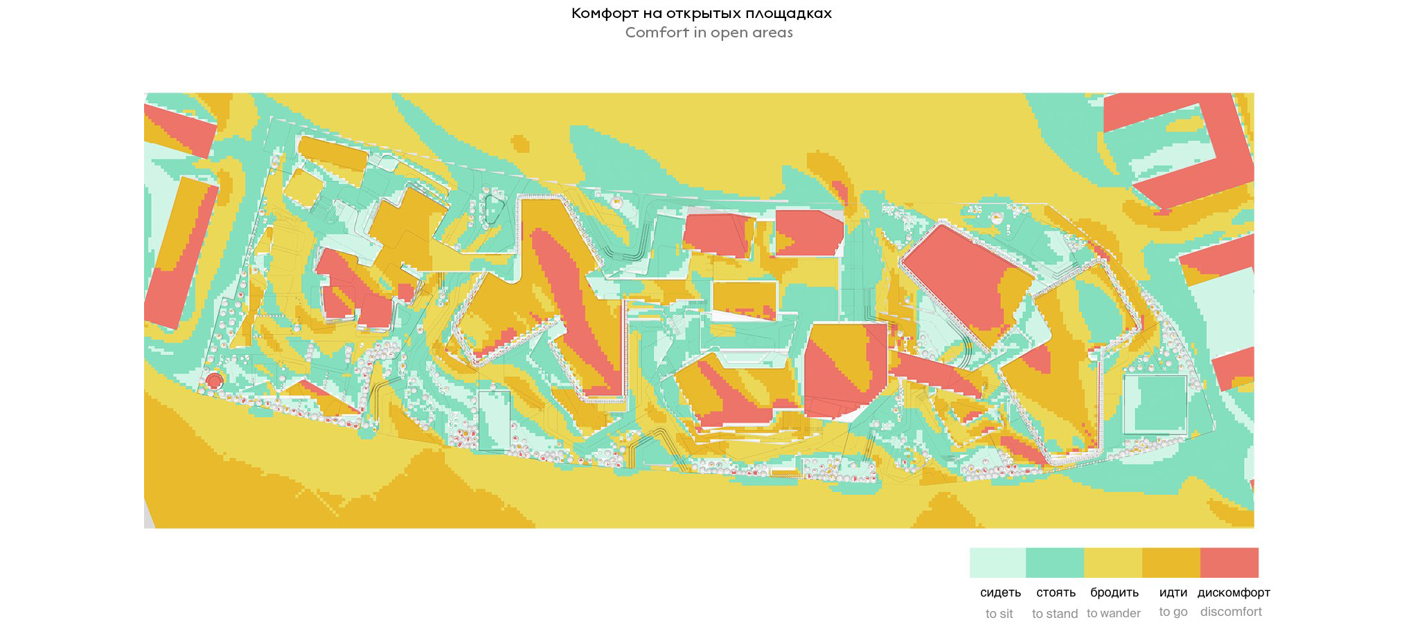 При этом пространство не замыкается в бетонной оболочке. Также особенности проекта учитывают анализ ветровых потоков и условий комфортного пребывания человека на открытых площадках, поэтому каждый функциональный блок обладает своей климатической ориентацией. Такое решение повышает энергоэффективность здания, снижает тепловую нагрузку, обеспечивает инсоляционную оптимальность и открывает возможность для естественной вентиляции, что напрямую влияет на комфорт учебного процесса.