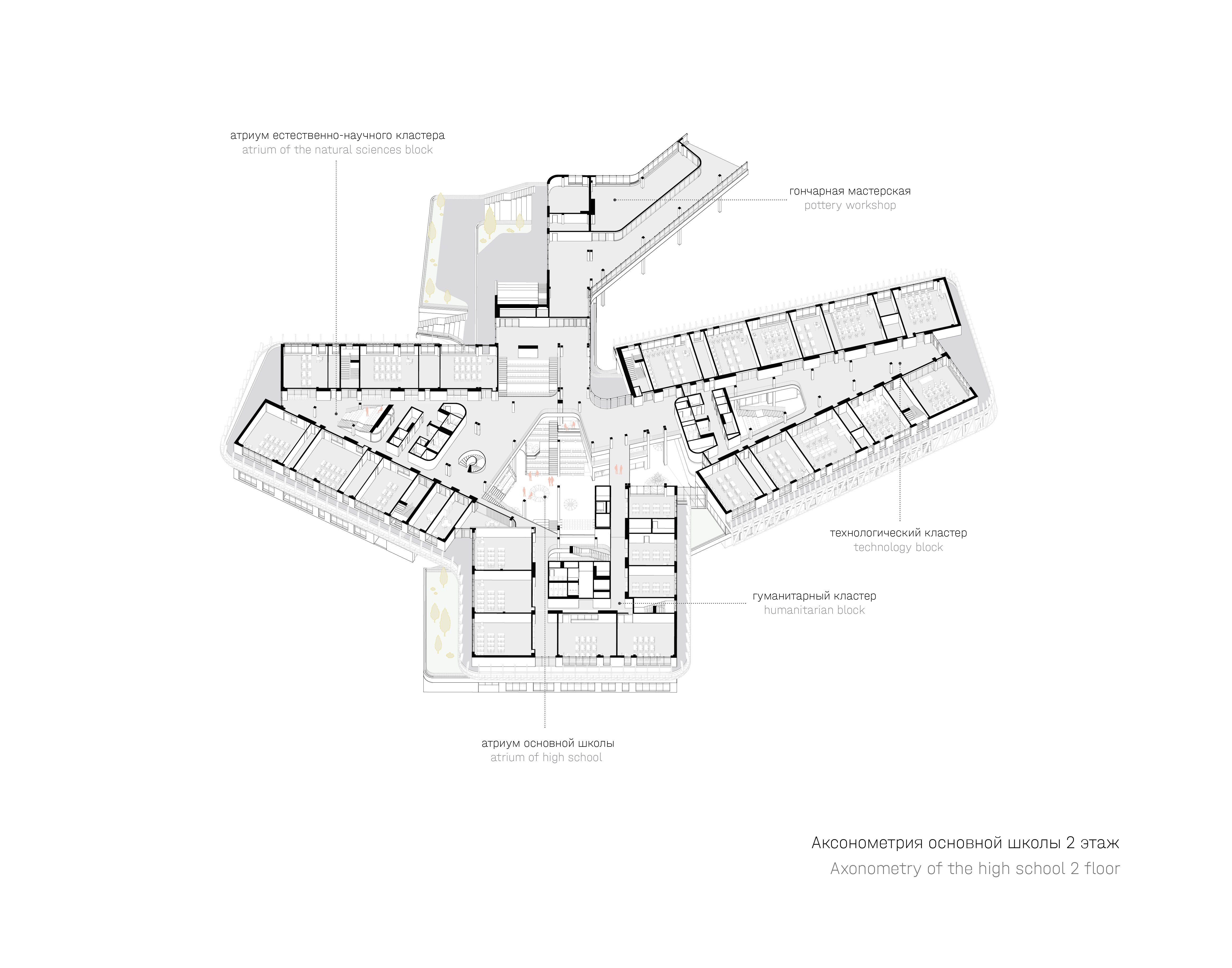 Каждый функциональный блок комплекса (детский сад, рассчитанный на 320 детей, начальная и основная школа, вмещающая на 2500 учеников, технологические и творческие лаборатории, спортивная инфраструктура) задан как самостоятельная единица с собственным ритмом и ориентацией на конкретные задачи и потребности учащихся. Вместе они образуют единую систему с продуманной логистикой и гибкой программой взаимодействия. Такое пространственное решение позволяет воспринимать «Сириус» как «мини-город», пространство со своими улицами, площадями, террасами и форумами, где маршрут — это сценарий, а переход — форма социализации.