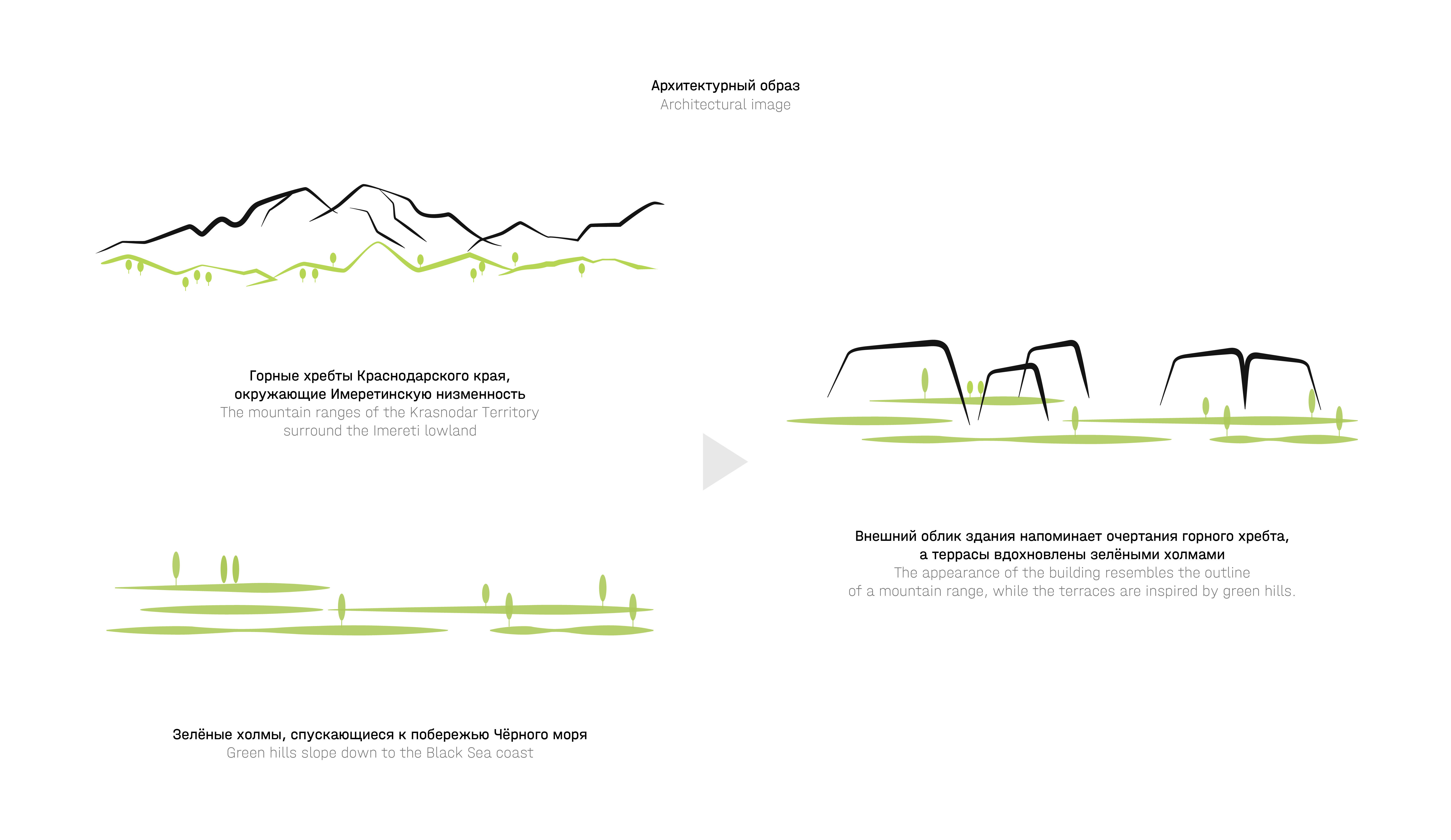 Ландшафтная организация, устроенная по принципу модульной системы с многочисленными террасами и зеленой кровлей, сглаживают грань между современной архитектурой и флорой соседнего орнитологического парка, формируя альтернативные точки притяжения, способные конкурировать с традиционной партой. Так, помимо эстетического удовольствия, реализация устойчивой связи с внешней средой закрепляет когнитивные и физиологические реакции учащихся, предлагая им самостоятельно наблюдать за экосистемами, редкими растениями и животными. Архитектурный образ здания напоминает очертания горных хребтов Краснодарского края, окружающие Имеретинскую низменность, а террасы вдохновлены зелеными холмами, спускающимися к побережью Черного моря.