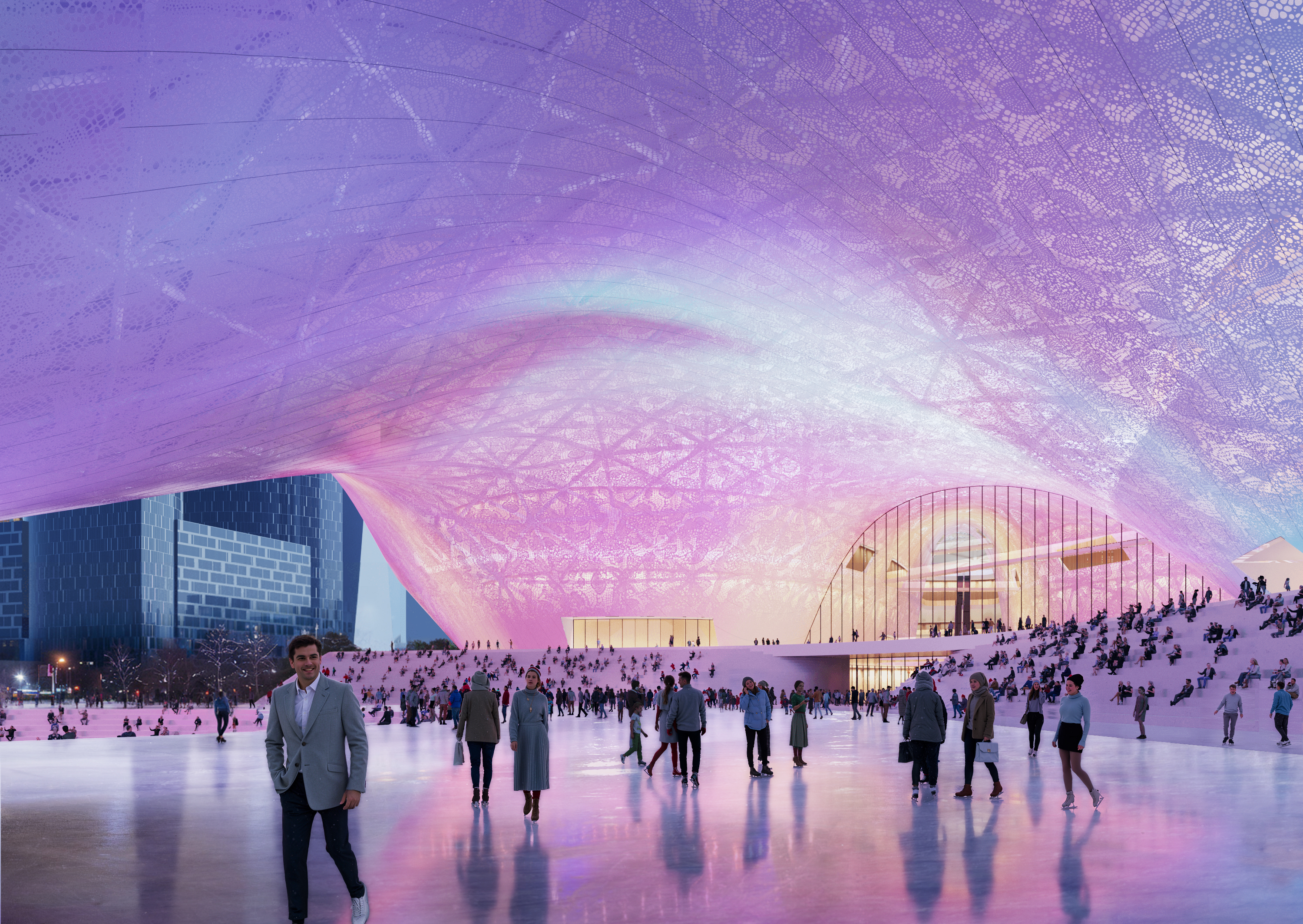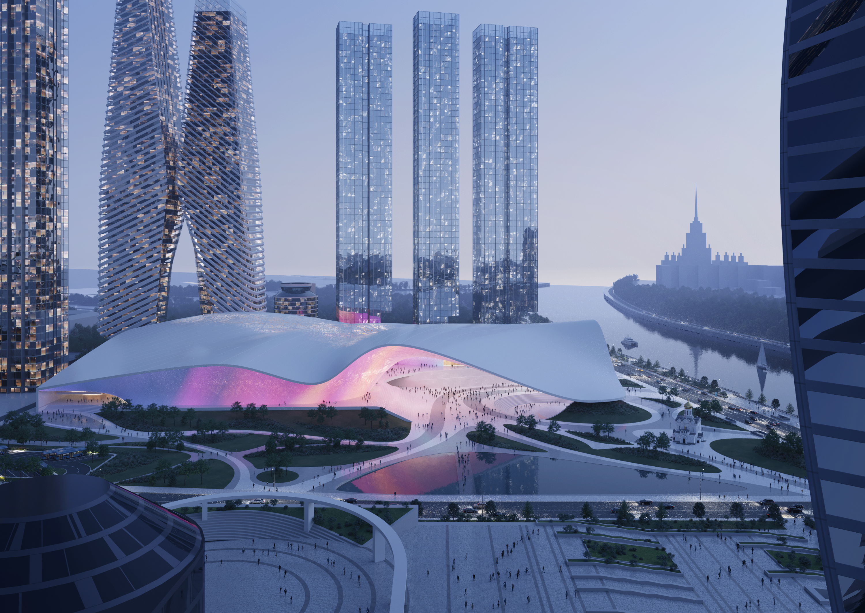 Наше здание рассчитано на возможность одновременного пребывания 15-20 тысяч посетителей, поэтому площадь перед входом была необходима. Она имеет и особый смысл как новое многофункциональное городское пространство. Здесь могут проводиться общественные мероприятия на открытом воздухе, выставки, зимой может работать каток. Функциональность этого пространства существенно повышается за счет того, что она накрывается кровлей здания, защищающей от осадков и солнца. В конце концов, люди здесь могут просто гулять или отдыхать в амфитеатре с видами на Москва-реку и Сити. Пространство площади также плавно «втекает» в интерьер комплекса и развивается внутри многосветными холлами и атриумами, освещаемыми верхним естественным светом.