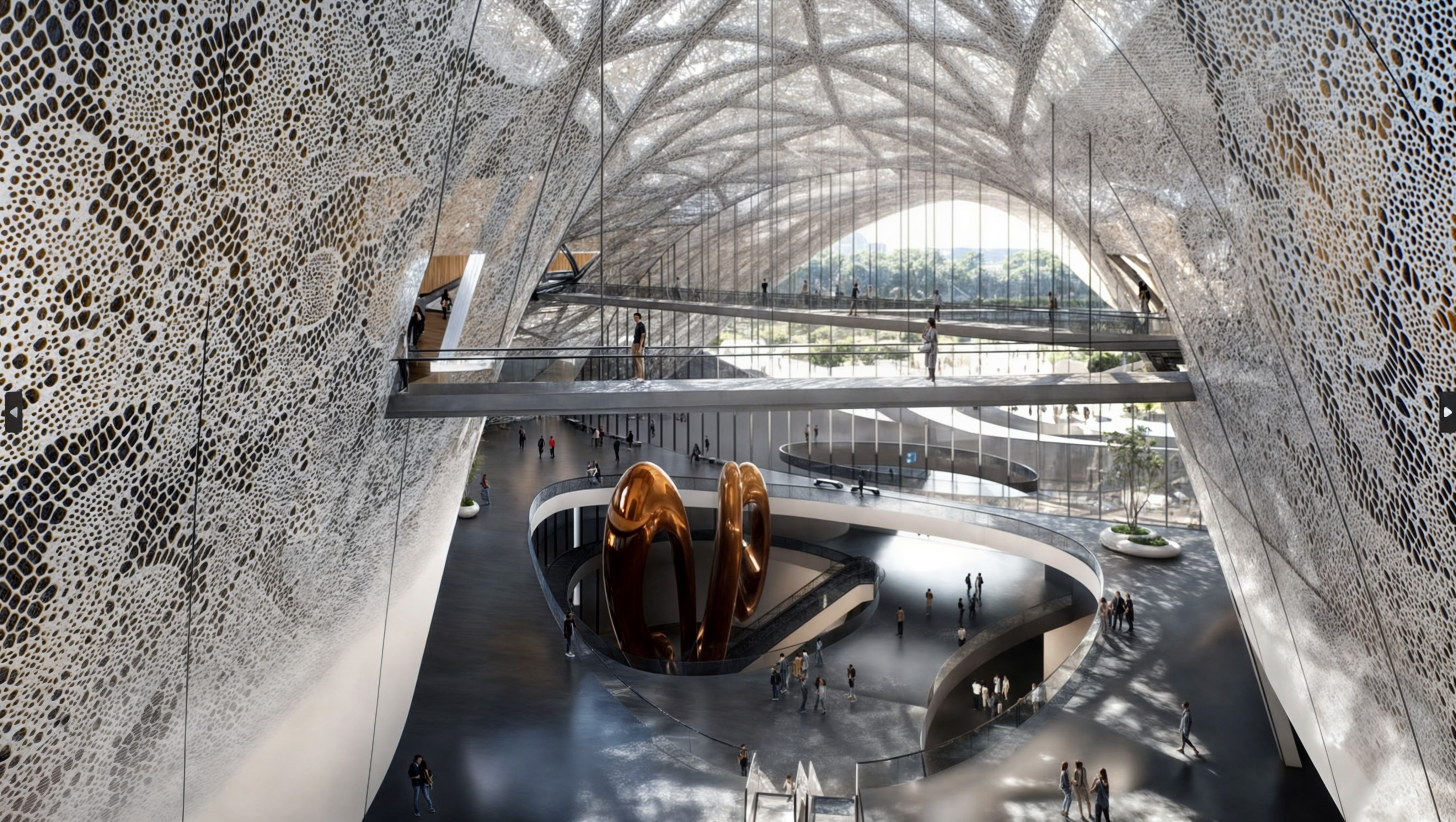 Здание изначально имеет довольно сложную геометрию, и его разработка и строительство являются непростой задачей. В своей практике мы применяем технологии параметрического проектирования, особенно в разработке фасадов, поскольку нам надо будет учитывать большое количество ключевых факторов, таких как обеспечение естественного освещения внутренних помещений, требование по пожарной безопасности и эвакуации, изменяемость фасадного орнамента и его неоднородность в каждой точке, внешняя подсветка и многое другое. Все эти решения подразумевают цифровое проектирование и машинное производство. Планируется применение мультимедийного фасада и лазерных проекционных систем. На этапе разработки концепции мы активно использовали искусственный интеллект.