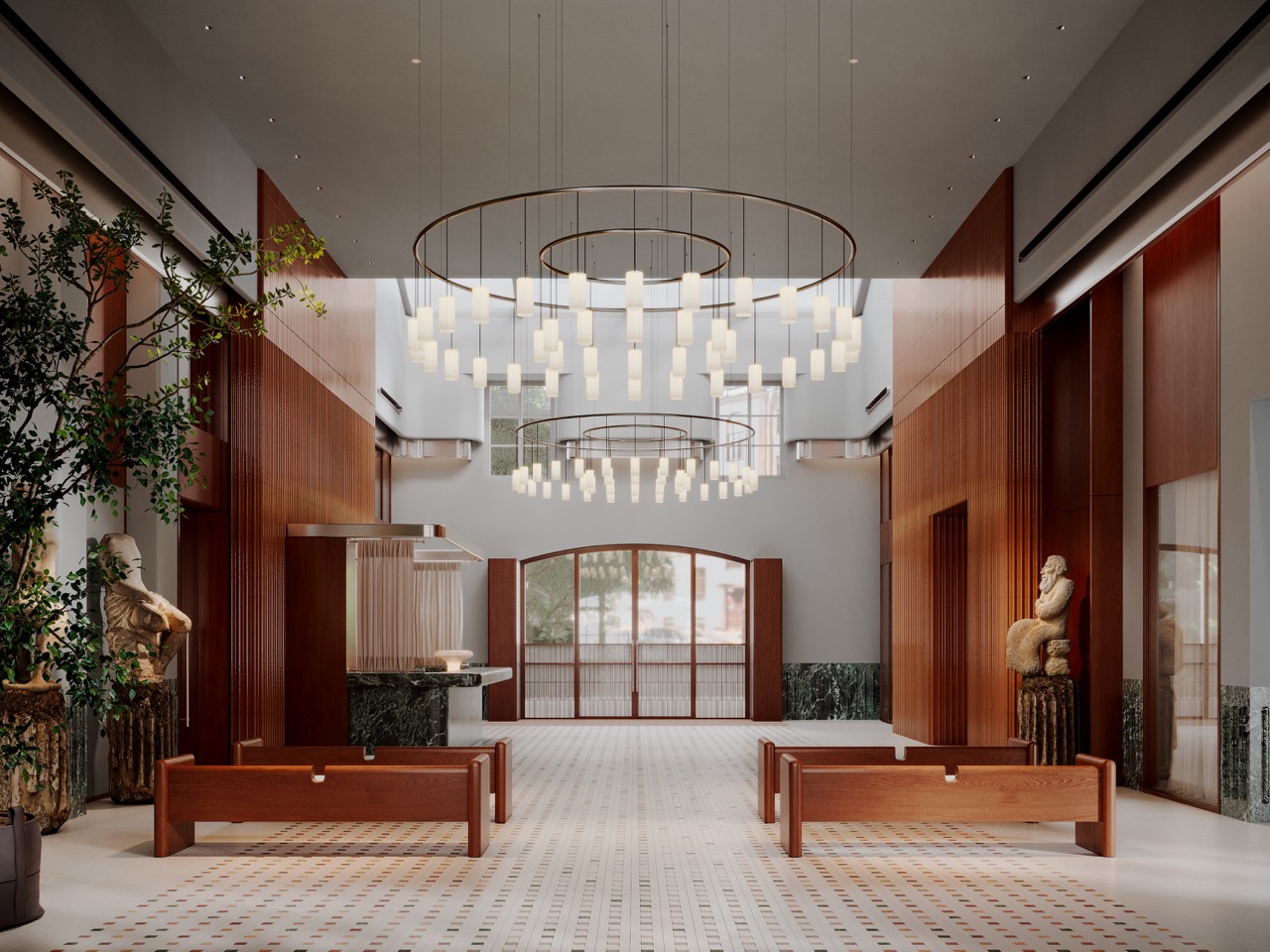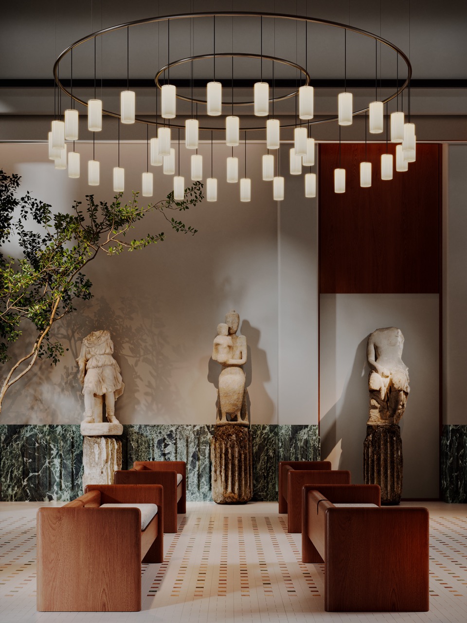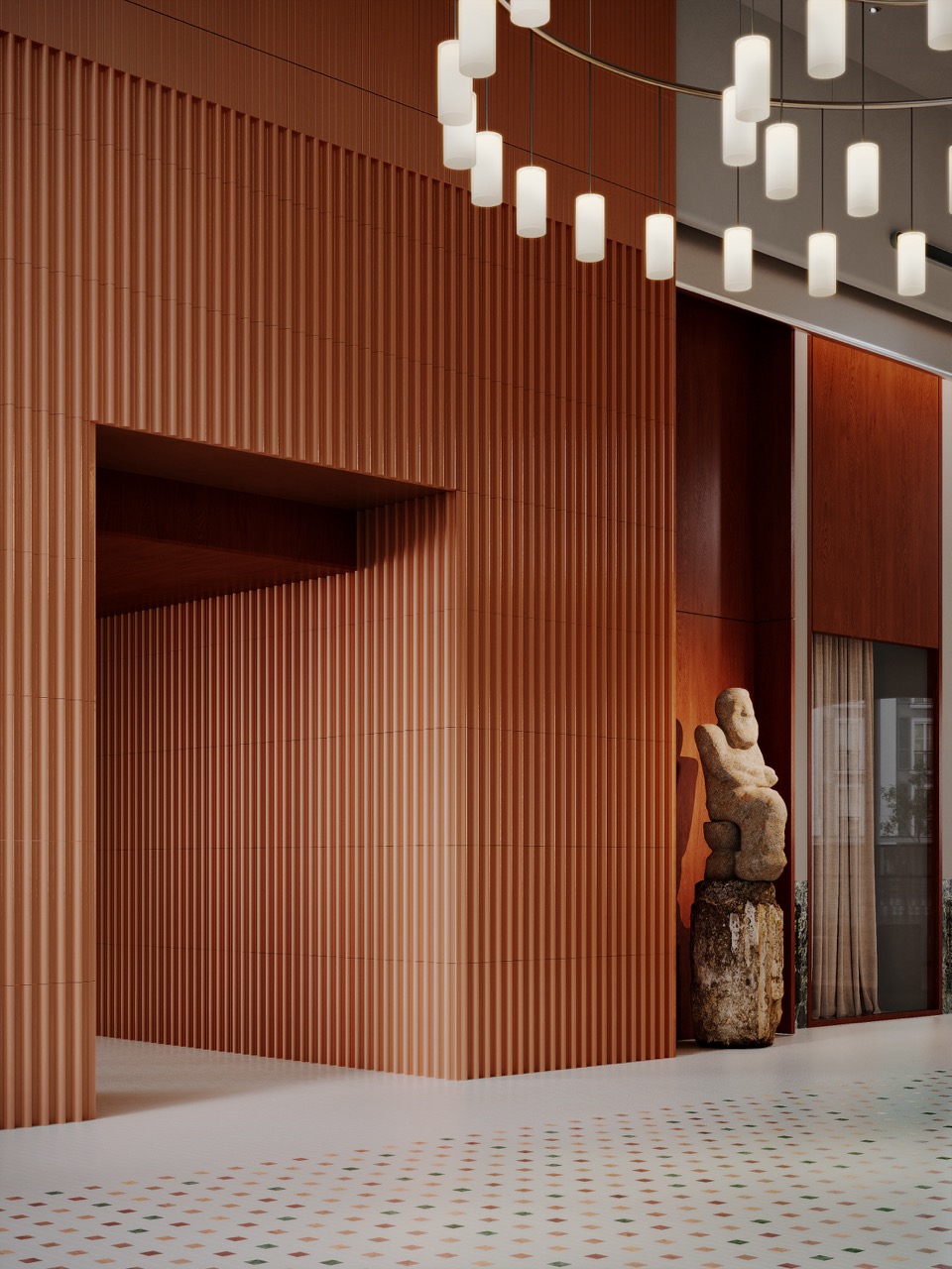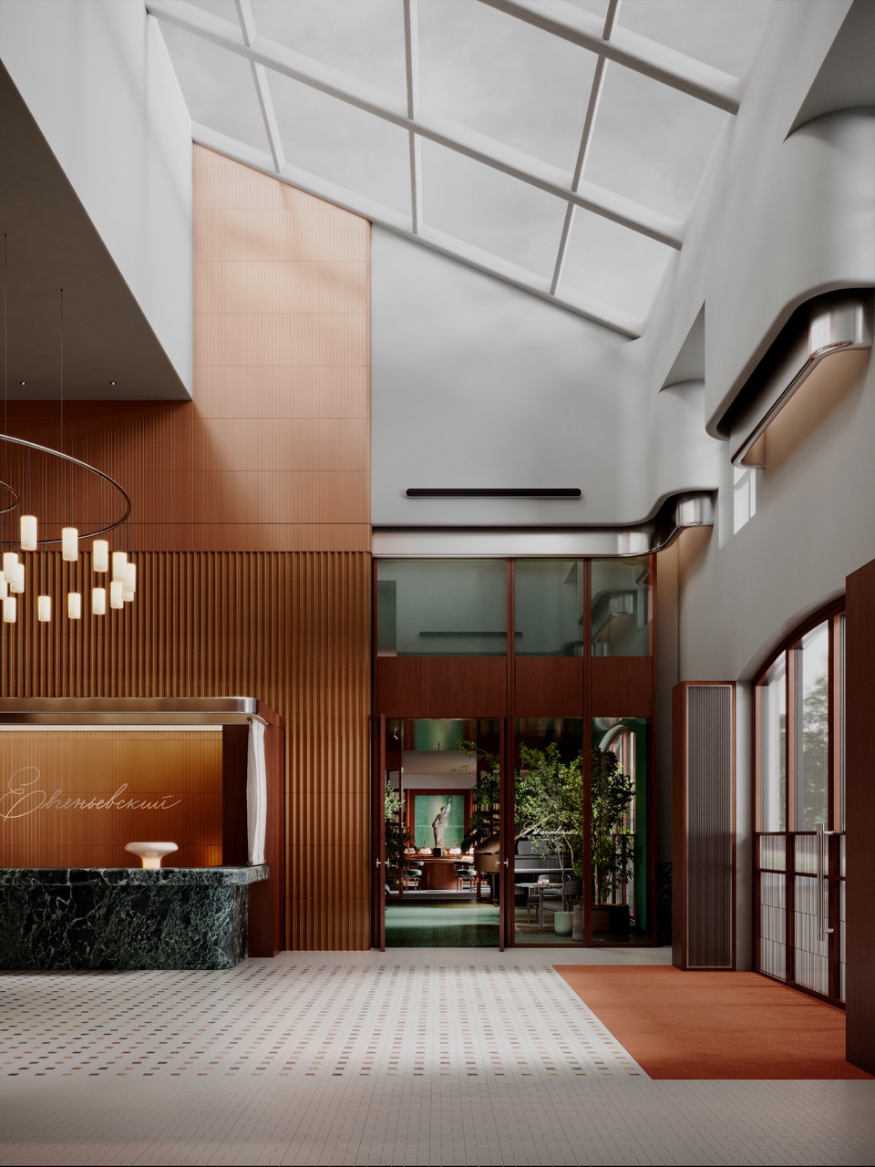 Гранд-лобби задумано как пространство покоя и гармонии. Вместо традиционного рецепционного ядра — открытое, светлое пространство, где внимание сосредоточено на масштабе. Скамьи рассредоточены вдоль главной оси и выполнены в кастомном исполнении. А объемы, облицованные керамикой с рельефом, напоминают ритмичные трубы органа. Главная ось ведет к стеклянным дверям с видом на город. Анфиладная структура плавно объединяет лобби, библиотеку, оранжерею и другие зоны. В интерьере сочетаются культовые предметы дизайна XX века, переосмысленные ведущими мировыми брендами, и ряд скульптур.
