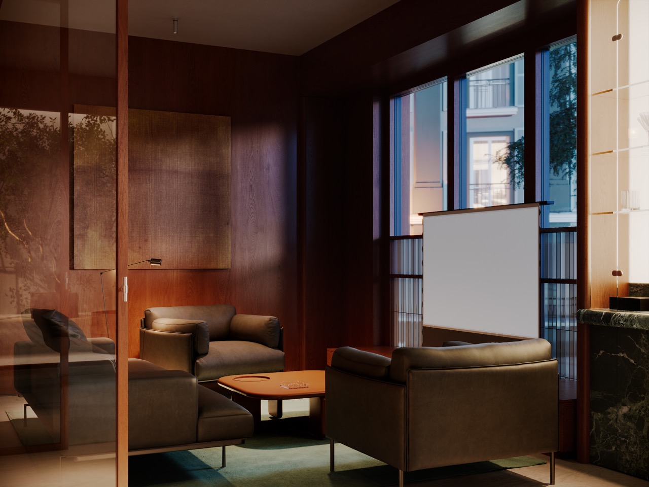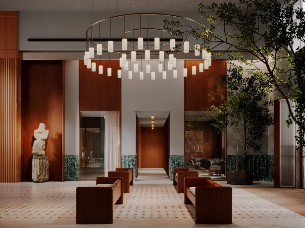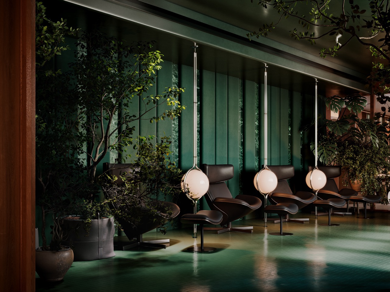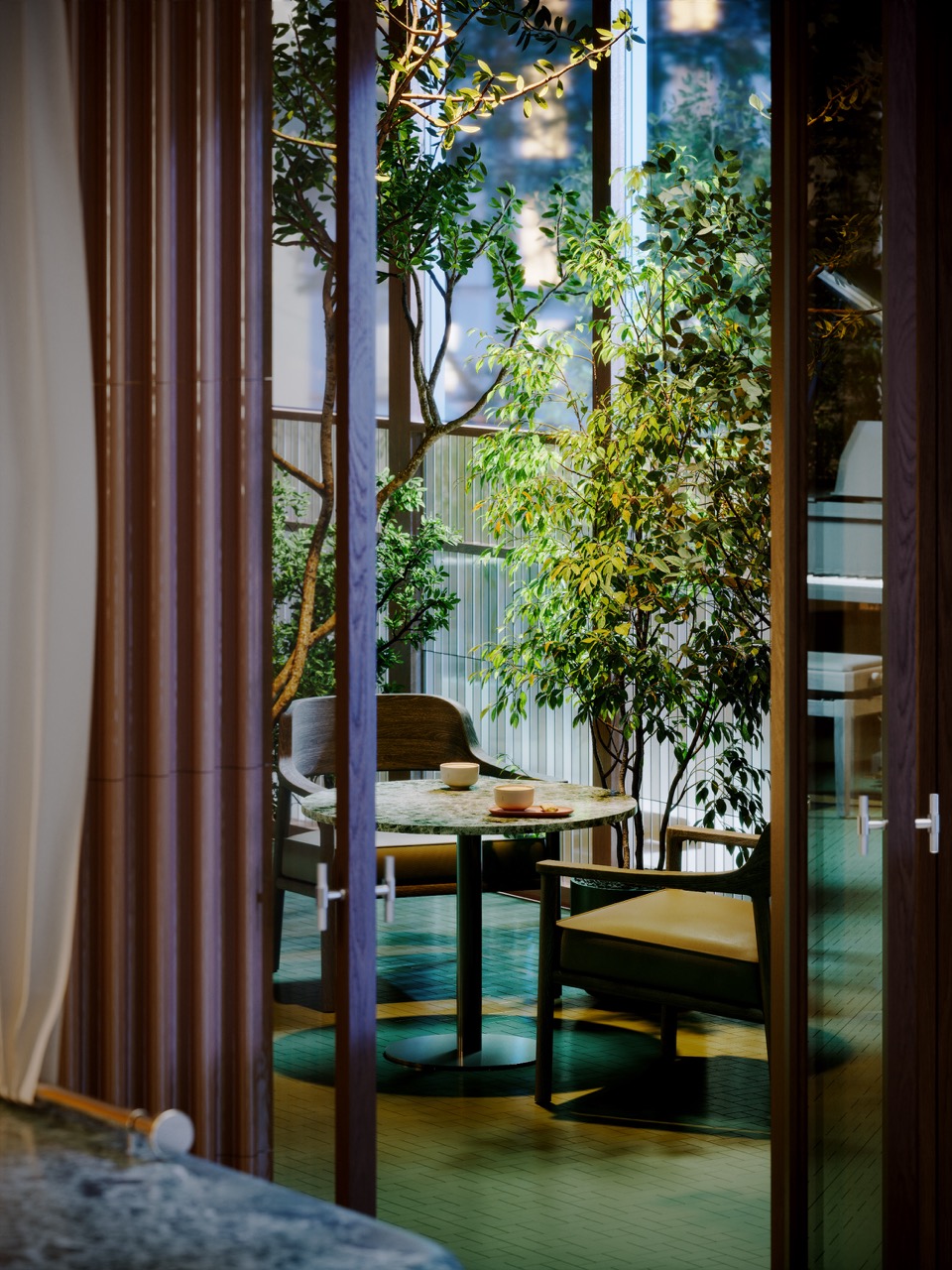 Гранд-лобби задумано как пространство покоя и гармонии. Вместо традиционного рецепционного ядра — открытое, светлое пространство, где внимание сосредоточено на масштабе. Скамьи рассредоточены вдоль главной оси и выполнены в кастомном исполнении. А объемы, облицованные керамикой с рельефом, напоминают ритмичные трубы органа. Главная ось ведет к стеклянным дверям с видом на город. Анфиладная структура плавно объединяет лобби, библиотеку, оранжерею и другие зоны. В интерьере сочетаются культовые предметы дизайна XX века, переосмысленные ведущими мировыми брендами, и ряд скульптур.