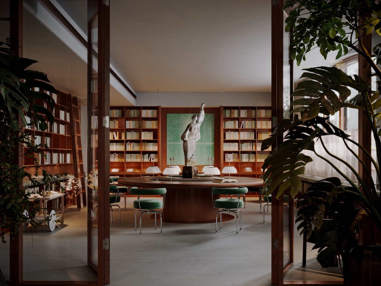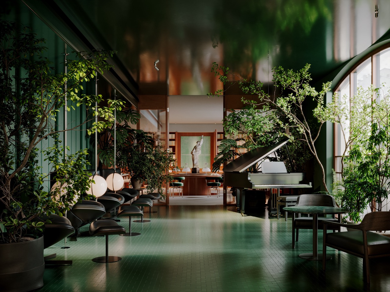Зеленая оранжерея, в которой размещен рояль, превращается в пространство для музыкальных вечеров. Библиотека с двумя зонами — читальной и более расслабленной у камина — оформлена в более домашней, «квартирной» атмосфере. Сигарная выдержана в стиле «old money», а общественная гостиная сохраняет камерность и сдержанную элегантность. Каждое пространство вдохновлено традициями петербургских досуговых пространств, где отдых переплетается с интеллектуальным и эстетическим времяпрепровождением.