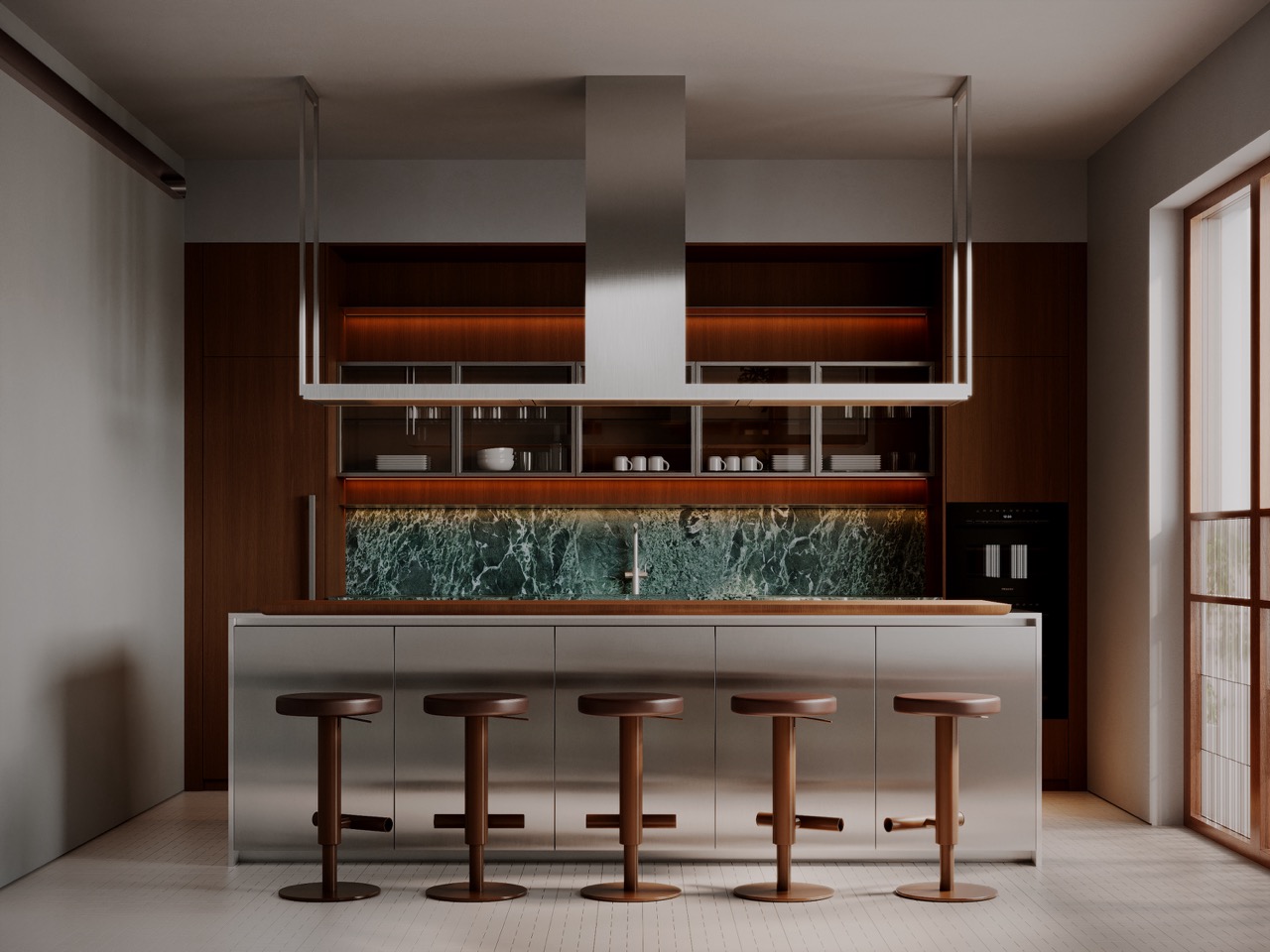 Особый акцент сделан на материалах, которые со временем красиво стареют и обретают характер. Камень, дерево и металл соединяются плавными линиями. Центральная мозаика на полу лобби объединяет колористику всех пространств и становится символическим мостом между историей и современностью.